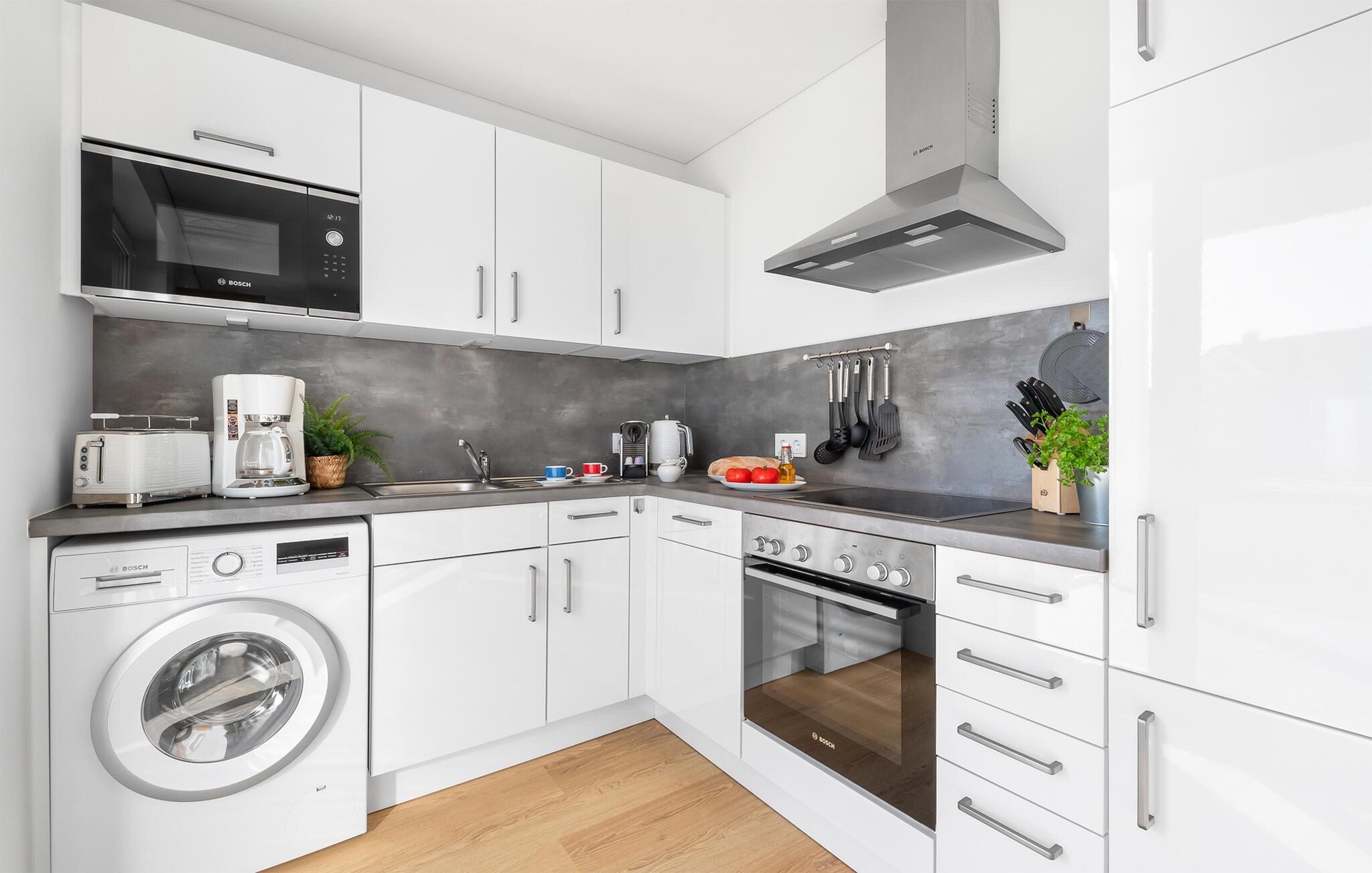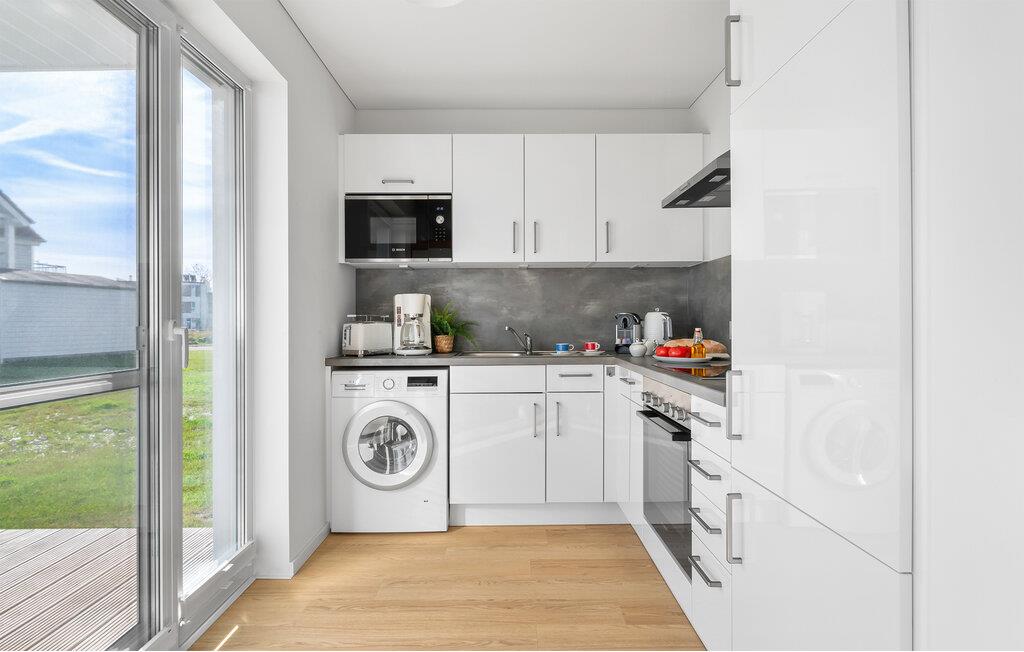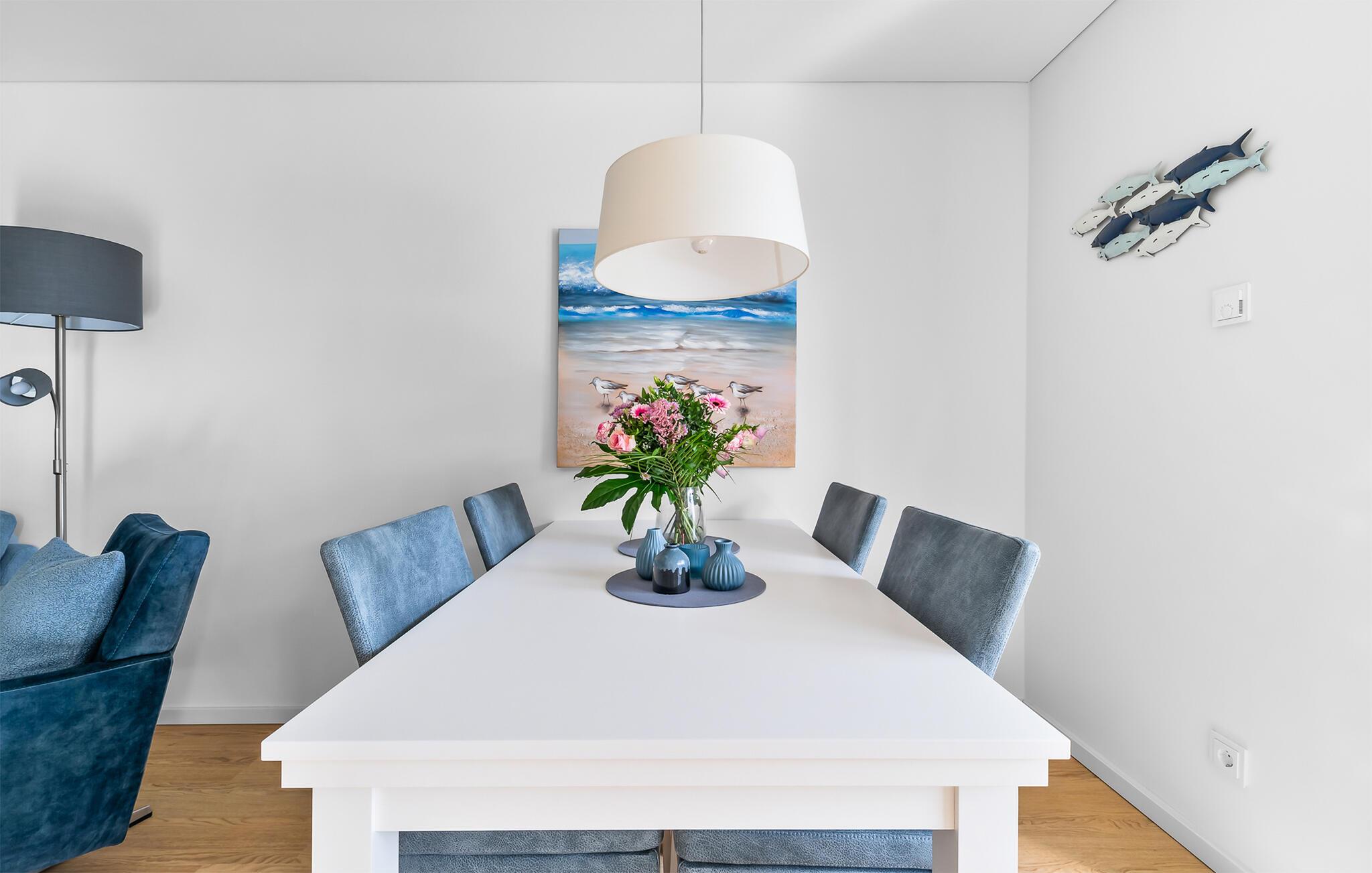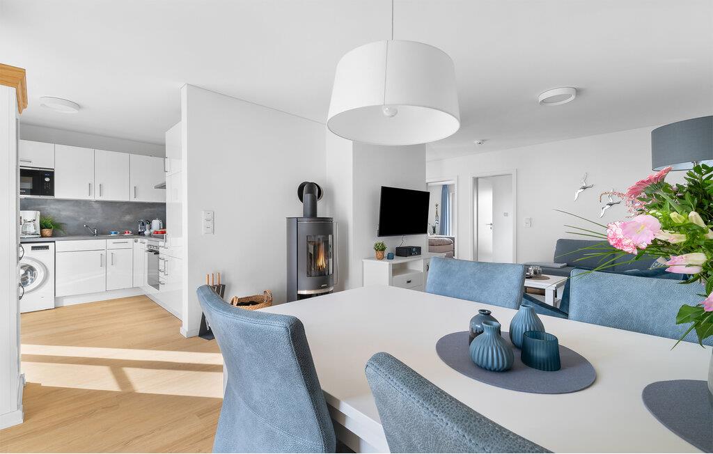 Im Feriendomizil angekommen erwartet euch ein gemütlicher Wohnbereich mit Sofalandschaft, TV und einem Kamin, so ist auch bei schlechtem Wetter Erholung garantiert. Die bodentiefen Fenster in der gesamten Wohnung sorgen für viel Licht und Wärme und runden das gemütliche Urlaubsfeeling ab. Hier findet ihr ebenfalls eine hochwertig ausgestattete Küche und eine Essecke, an der die ganze Familie Platz findet.