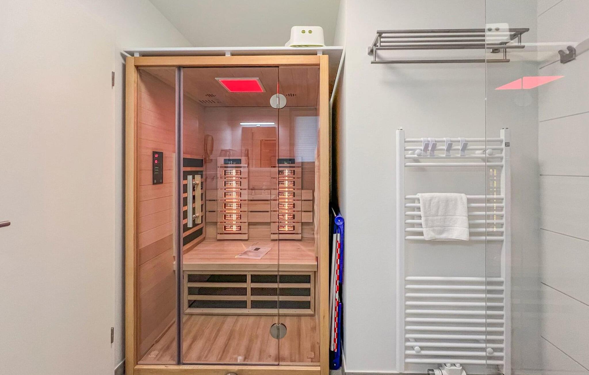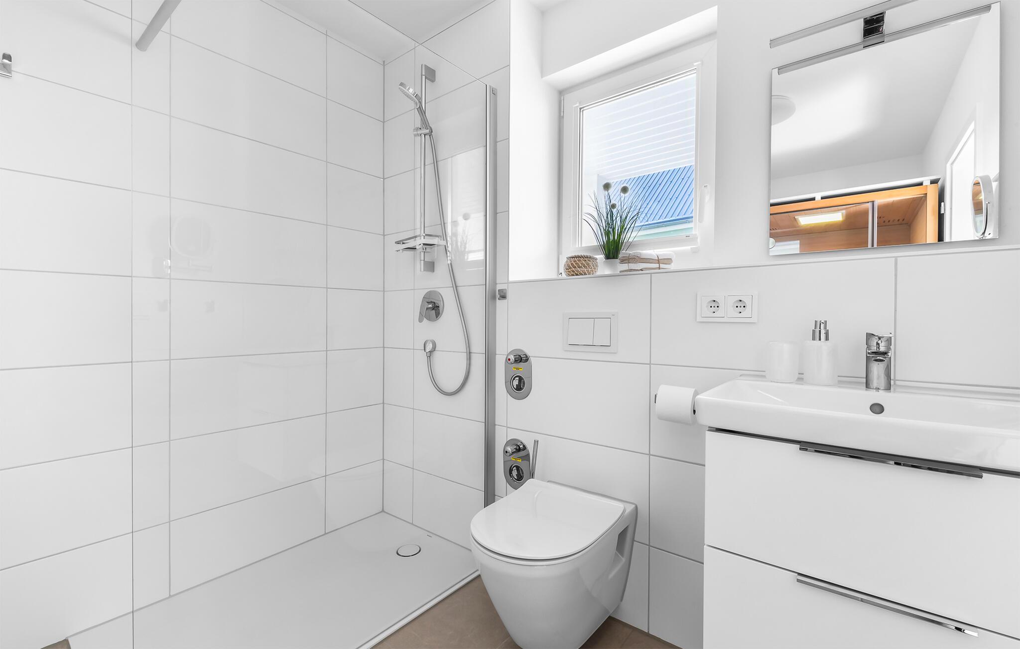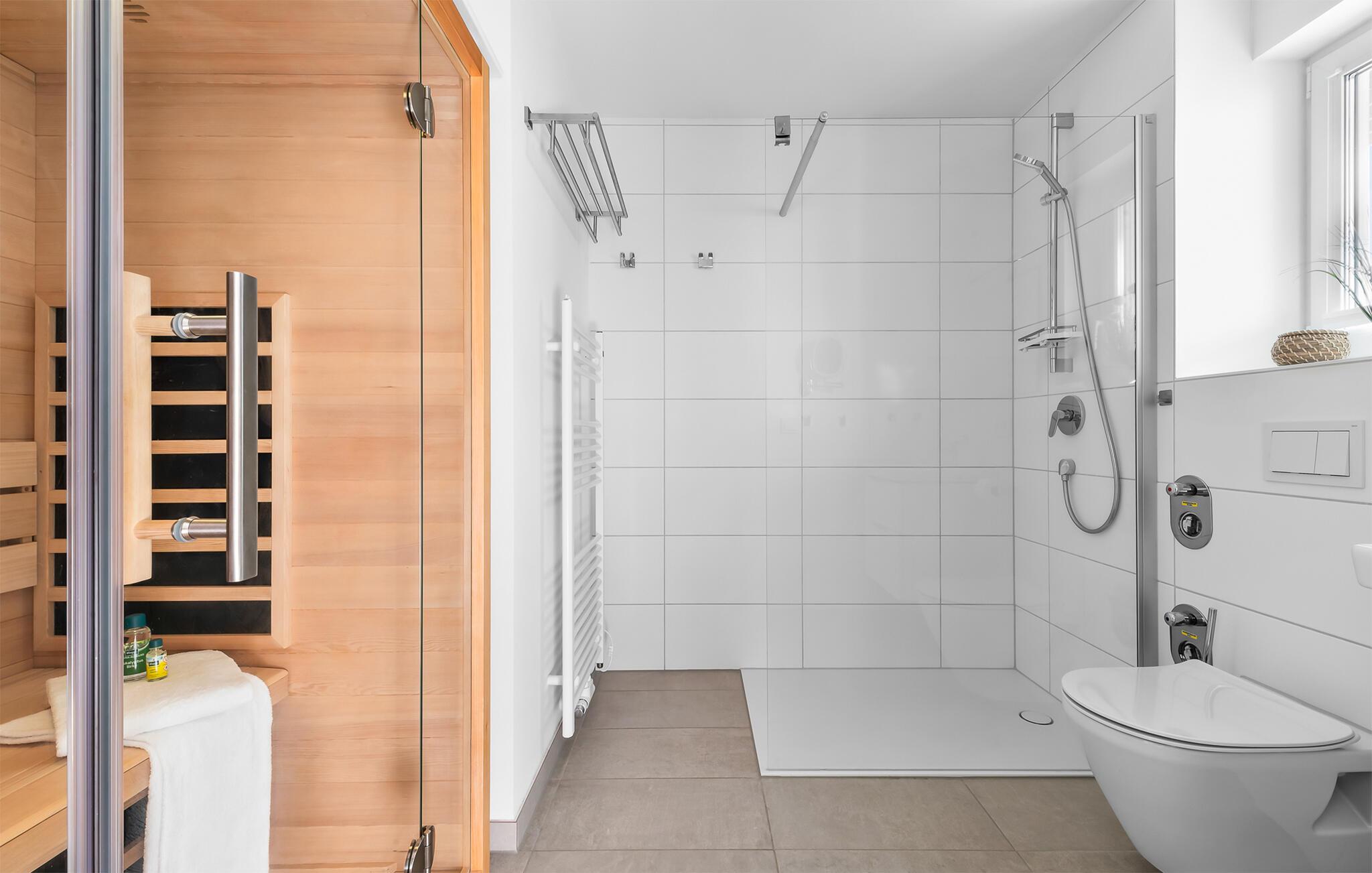 Für den perfekten Abschluss eines erlebnisreichen Urlaubstages sorgt das Badezimmer. Eure ganz eigene kleine Wellnessoase mit bodengleicher Dusche und einer Infrarot-Sauna.