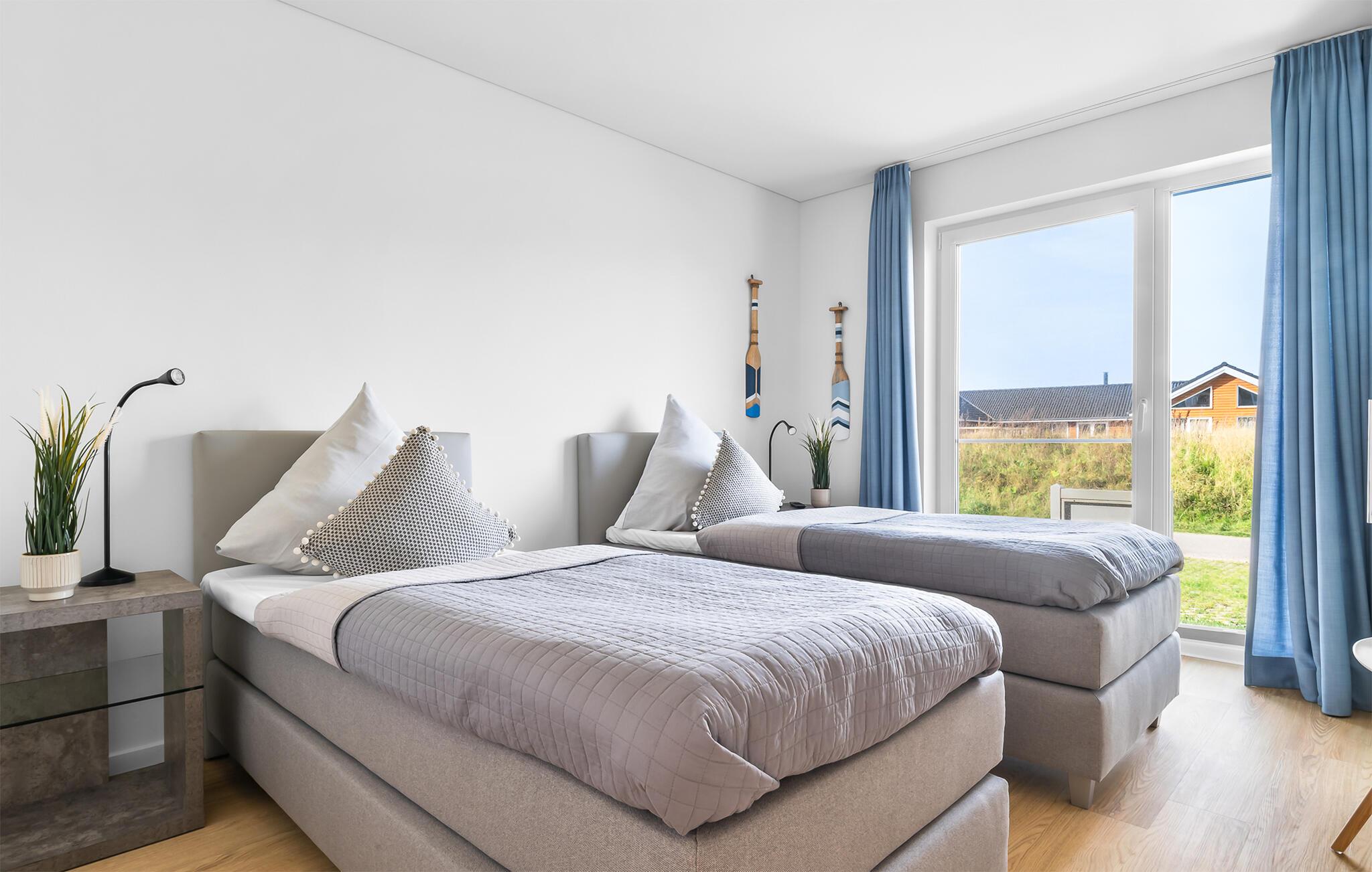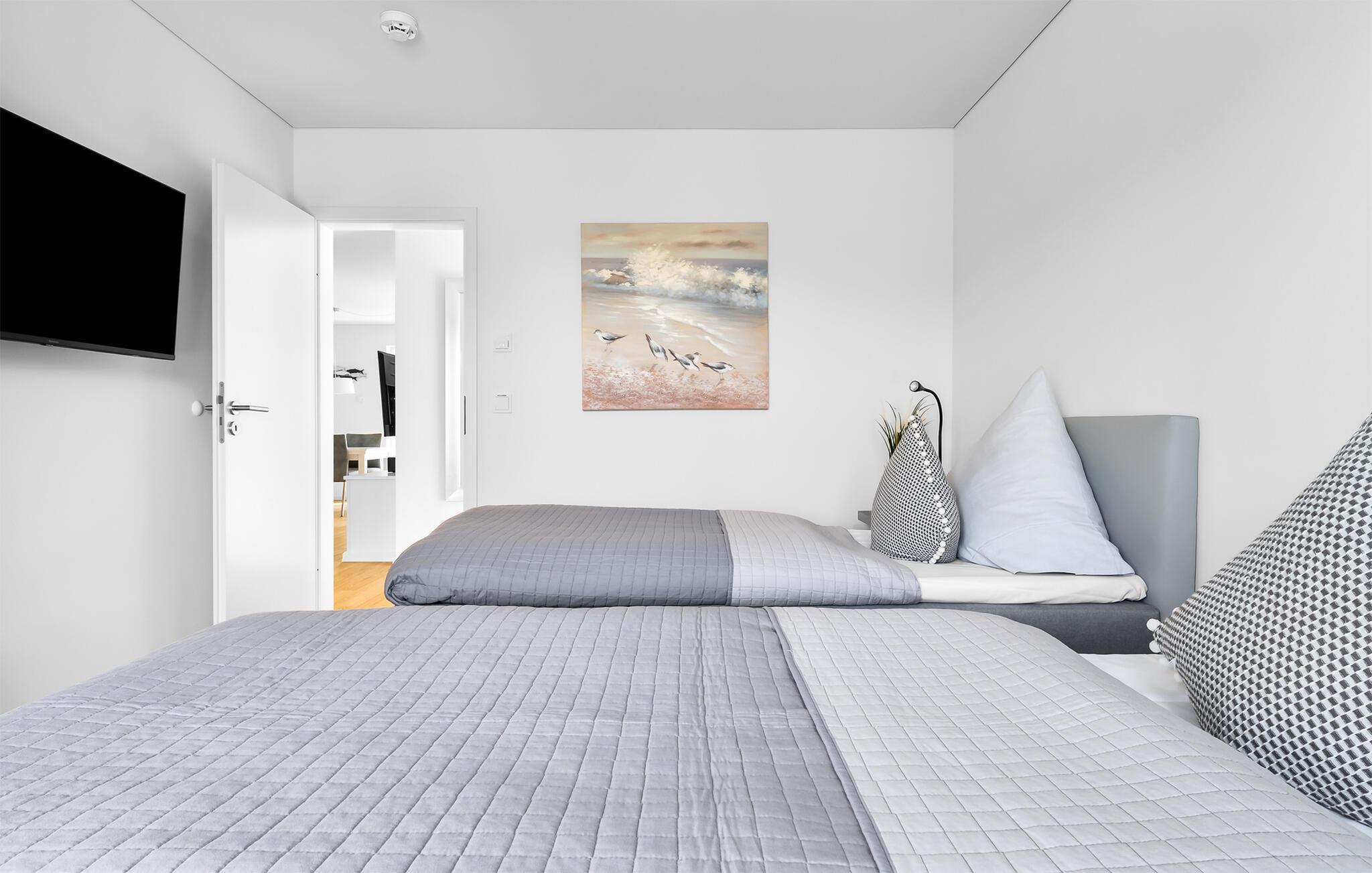 Angrenzend an den Wohnbereich stehen zwei Schlafzimmer zur Verfügung. Das erste Schlafzimmer ist mit einem bequemen Doppelbett ausgestattet. Dank einem zusätzlichen TV kann man für die Lieblingssendung einfach liegen bleiben und vom Bett aus fernsehen. Das zweite Schlafzimmer ist mit zwei ebenso bequemen Einzelbetten und einem TV ausgestattet.