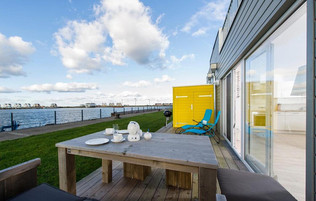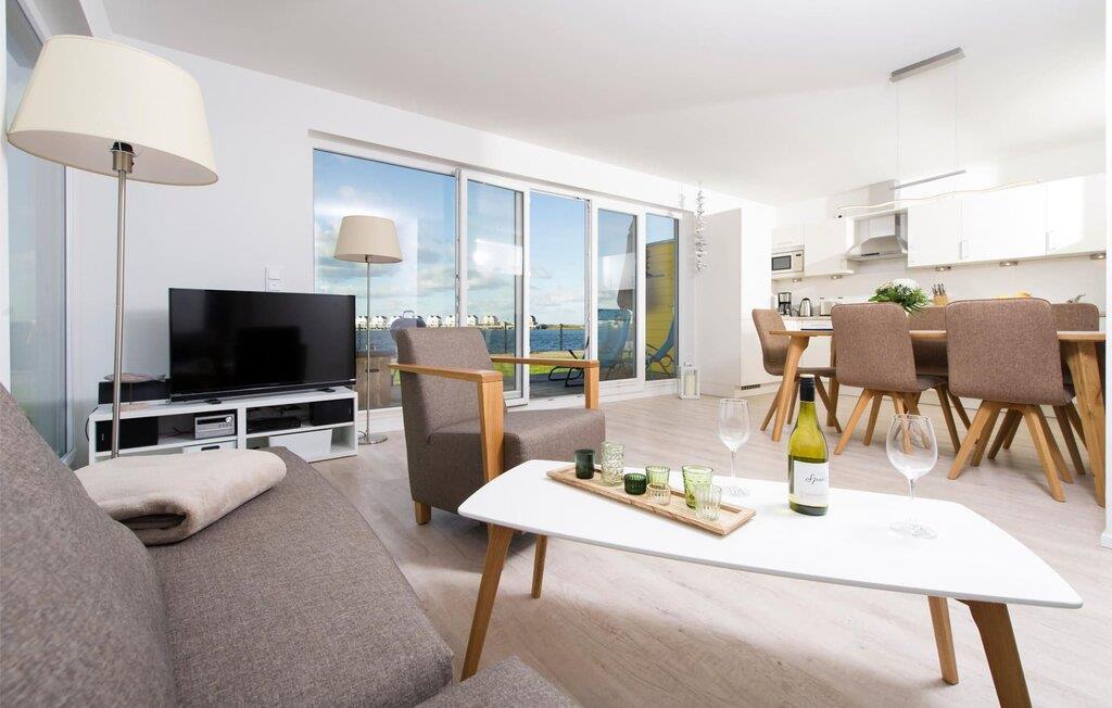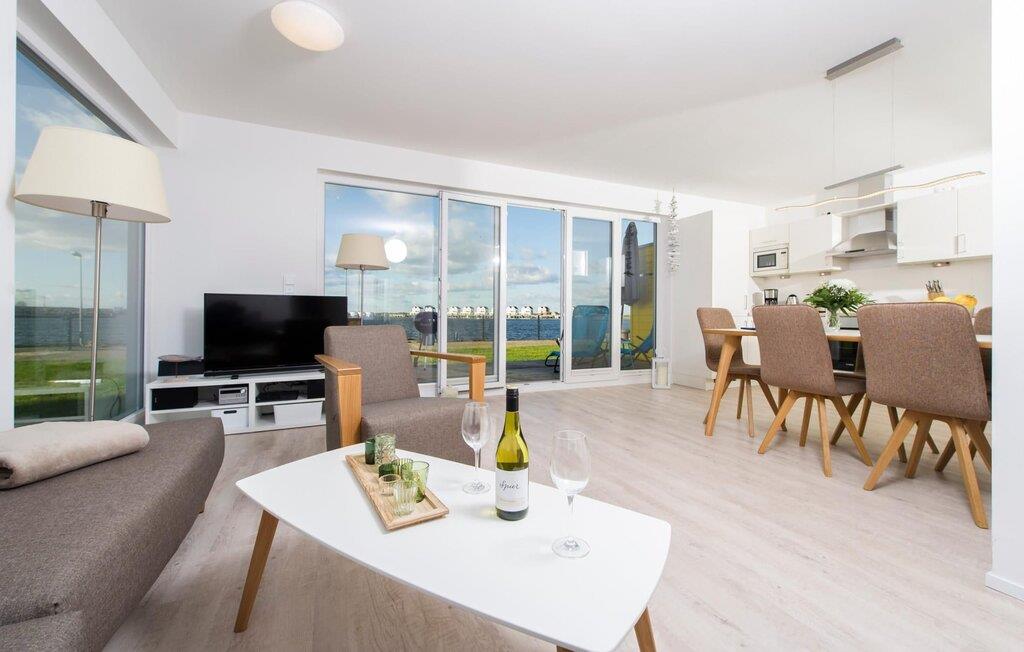 Traumhafte Aussichten eröffnen sich aus dem Wohnbereich und auf der angrenzenden Terrasse mit Blick über die Marina. Hafenkino sorgt hier für