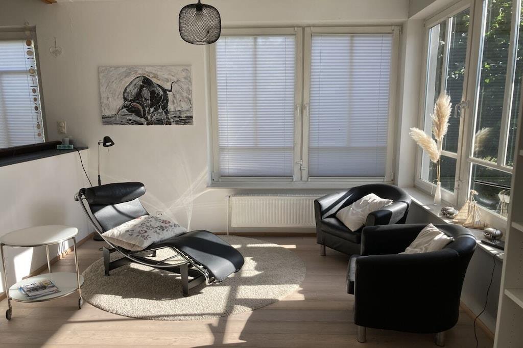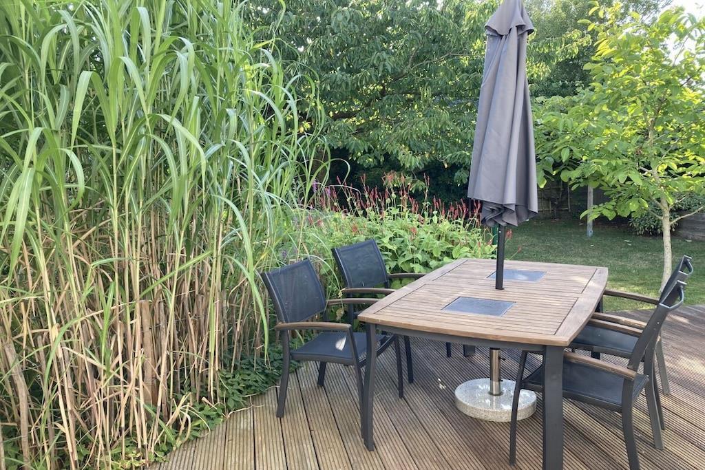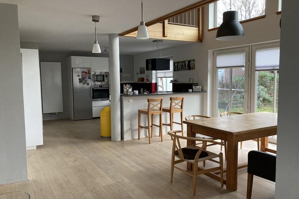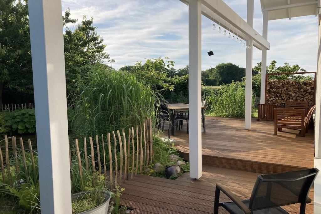 Das große freundliche Ferienhaus mit lichtdurchfluteten Räumen befindet sich auf einem ca. 800 qm großen umfriedeten Grundstück mit einem herrlichen Garten inc. Teich (eingezäunt), Obstbäumen, Kräutern etc. Eine ca. 70qm große Terrasse ist so angelegt, dass man von morgens bis zum Sonnenuntergang der Sonne folgen oder ein schattiges Plätzchen finden kann. Ein Holzkohlegrill steht zur Verfügung. Die 3 separaten Schlafzimmer haben jeweils ein Doppelbett, Schränke und Flachbild TV. Die Fenster der Schlafräume sind mit Insektenschutz versehen. 2 PKW-Stellplätze befinden sich direkt vor dem Hauseingang. Für Ihre Fahrräder gibt es einen überdachten Abstellplatz.