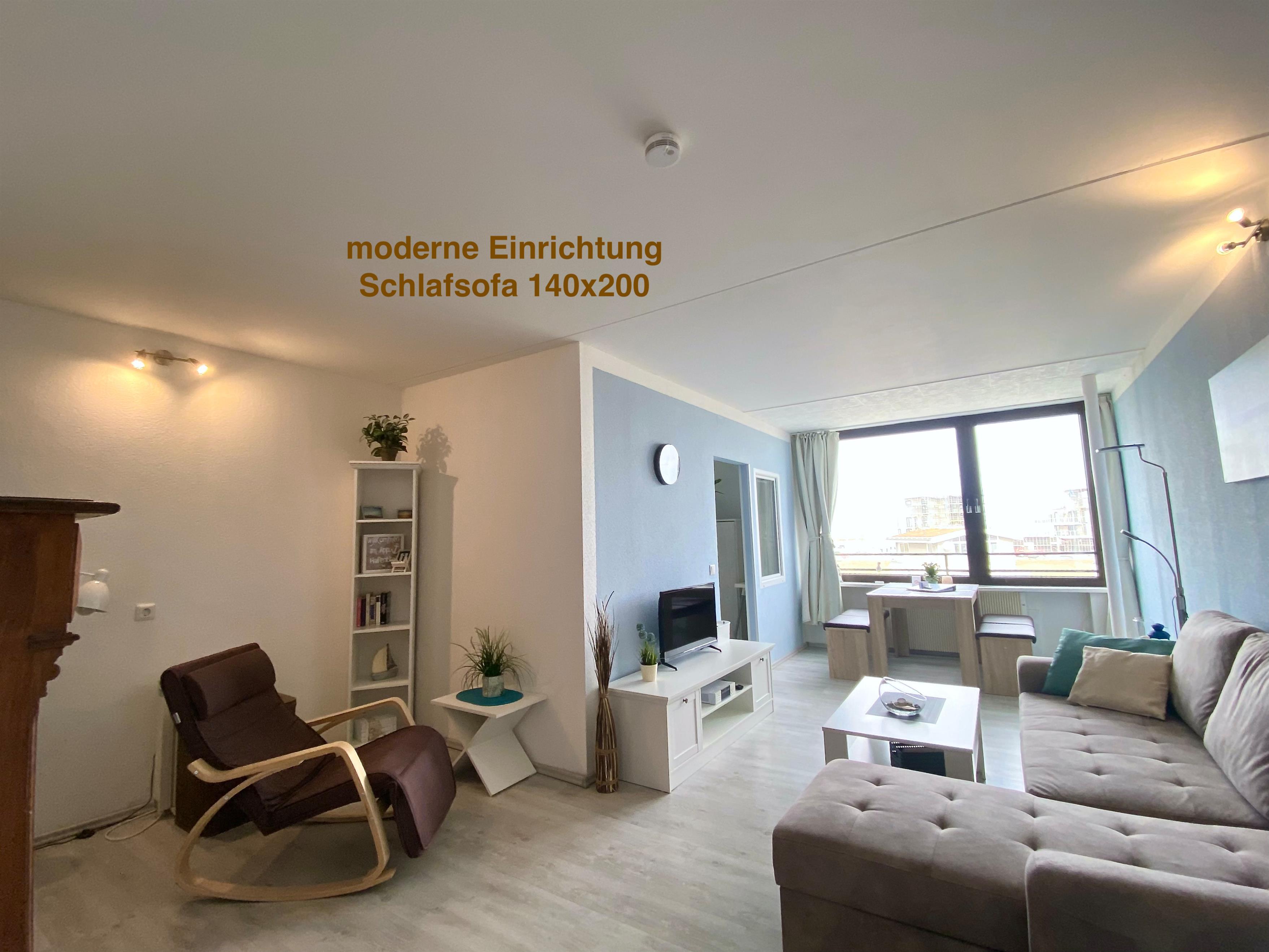Diese gepflegte 1,5-Zimmer-Nichtraucher-Wohnung "Hafenblick" in einem ruhigen Apartmenthaus ist mit dem Aufzug oder über die Treppe zu erreichen. Sie bietet alles, was Sie für Ihren Wohlfühl-Urlaub am Meer brauchen: Im Wohn-/Schlafzimmer steht ein Kuschelsofa, dass sich kinderleicht in ein bequemes Doppelbett verwandeln lässt (Liegefläche zusätzlich mit viscoelastischem Topper, 140x200) und ein Lesesessel für die ruhigeren Augenblicke. Im Schlafzimmer finden Sie ein Doppelbett (140x200, verstellbare Lattenroste) für erholsame Nächte. Die Wohnung verfügt über Kabel-TV 32", Radio/CD, einen gemütlichen Essplatz und ein modernes Duschbad mit Duschkabine und ausreichend Ablageflächen. Die separate Einbauküche ist ausgestattet mit reichlich Geschirr, Ceranfeld, Backofen, Geschirrspüler, Kühlschrank/Gefrierfach, Kaffeemaschine, Wasserkocher und Toaster. Im Flur befindet sich ein großer Kleiderschrank mit viel Platz für Ihr Reisegepäck. Der Blick von Ihrem Essplatz lässt, auch durch den regen Schiffsverkehr, keine Langeweile aufkommen - hier können Sie erlebnisreiche Tage super ausklingen lassen. Ein kleiner Wertsachentresor, Kindersicherungen in allen Steckdosen, diverse Bücher und Spiele runden die Ausstattung ab.