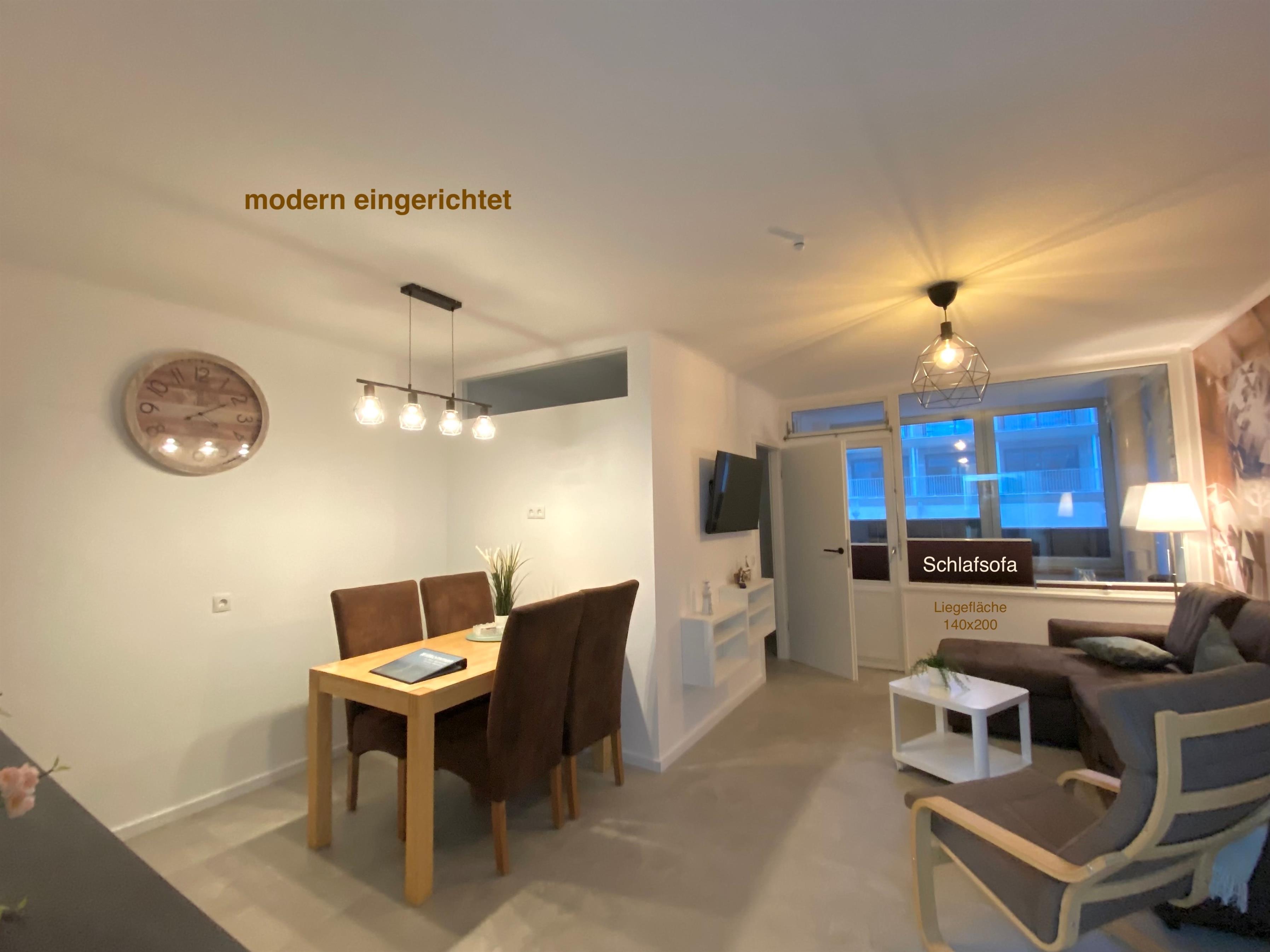 Helle 1,5-Zimmer-Wohnung mit offener Küche bis 4 Personen. Gepflegt, gemütlich und sehr schick für 2 (+ 2) eingerichtet. WLAN, Parkplatz, max. 1 Hund, Strandentfernung 300 m.