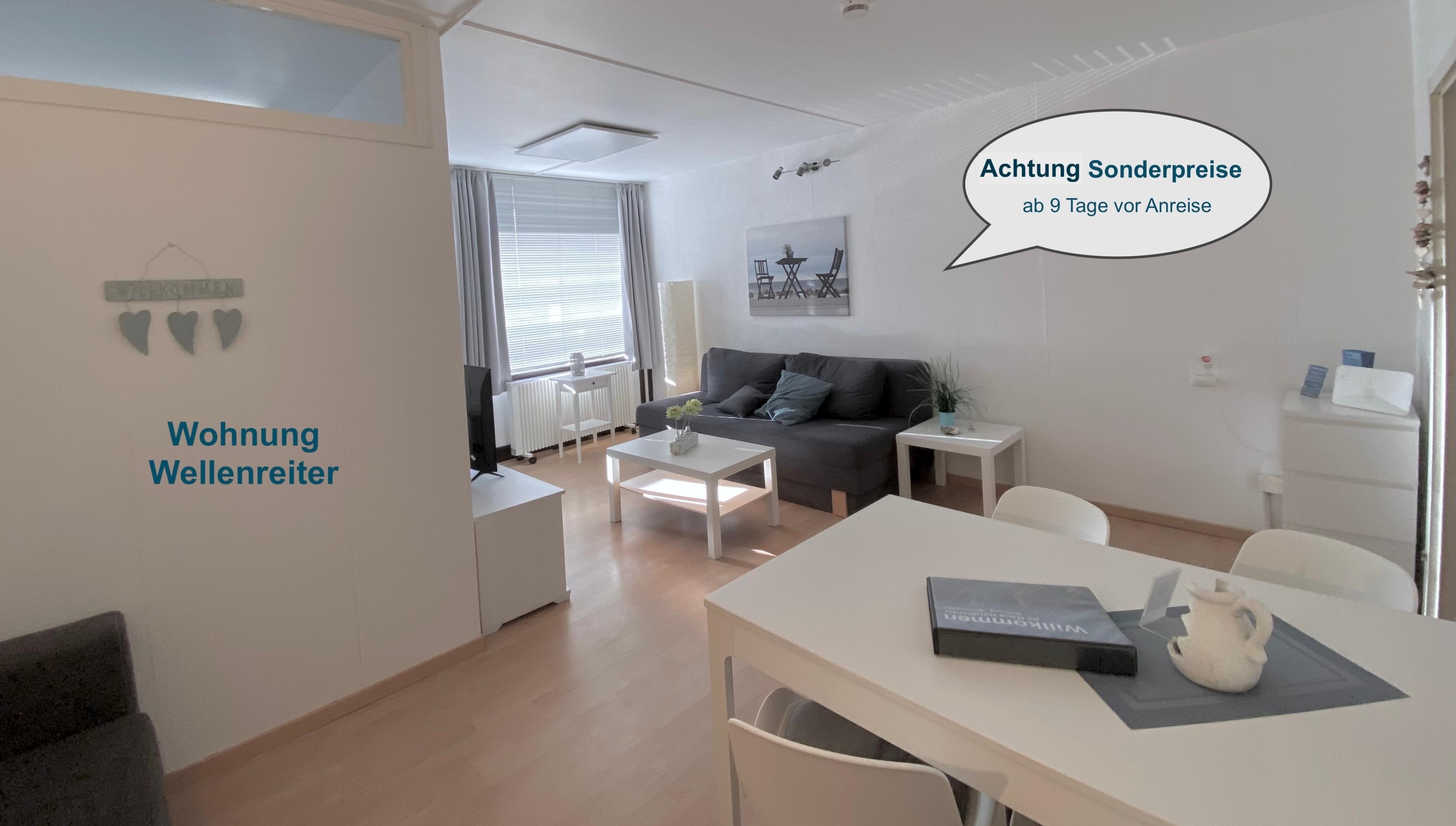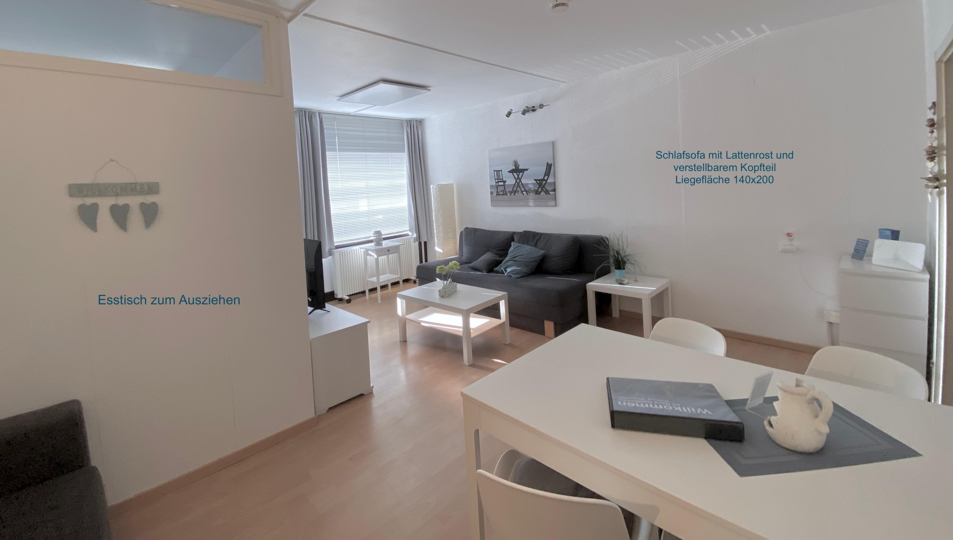 Diese gepflegte 1,5-Zimmer-Nichtraucher-Wohnung "Wellenreiter" bietet mit ihrer modernen Einrichtung und einer komfortablen Ausstattung alles, was Sie für Ihren Wohlfühl-Urlaub am Meer brauchen. Sie befindet sich im 2. OG eines ruhigen Apartmenthauses (Fahrstuhl ist vorhanden) ca. 200 m vom Strand. Den Wohnmittelpunkt bildet der großzügige Essplatz vor der offenen Küche. Sie ist ausgestattet mit reichlich Geschirr, Ceranfeld, Backofen, Mikrowelle, Geschirrspüler, Kühlschrank/Gefrierfach, Kaffeemaschine, Wasserkocher und Toaster. Im Schlafzimmer befindet sich ein Doppelbett mit einer Liegefläche von 140x200 (verstellbare Lattenroste). Das Schlafsofa im Wohn-/Schlafraum, lässt sich kinderleicht in ein bequemes Doppelbett (auf Wunsch mit zusätzlichem viscoelastischem Topper, 140x200) verwandeln; es hat ein Lattenrost und ein verstellbares Kopfteil. Das kleine Kuschelsofa bietet einen zusätzlichen Schlafplatz (Liegefläche 110x200) - allerdings bodengleich ohne Lattenrost. Sowohl in dem modernen Duschbad mit Fußbodenheizung als auch in dem großen Einbauschrank im Flur finden Sie genügend Stauraum für Ihre persönlichen Dinge.