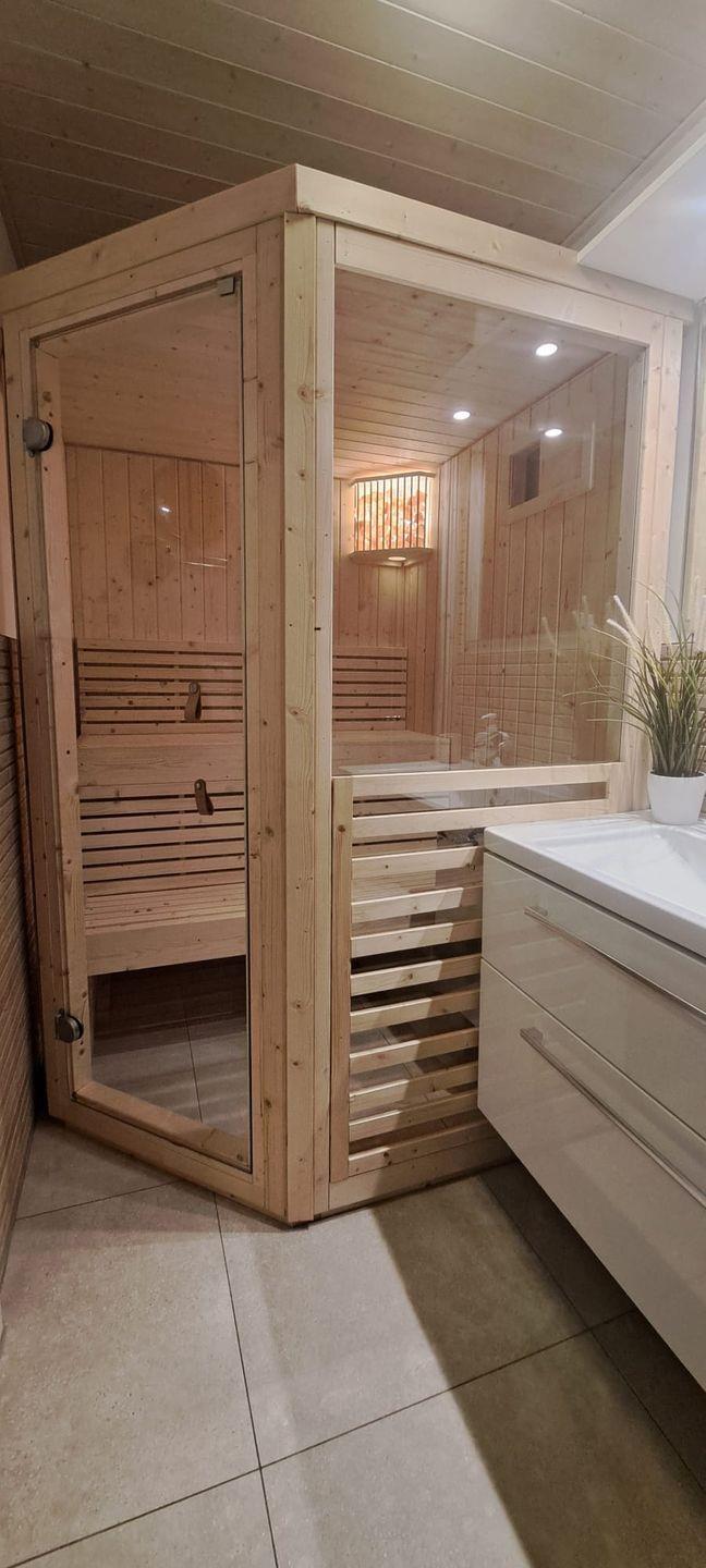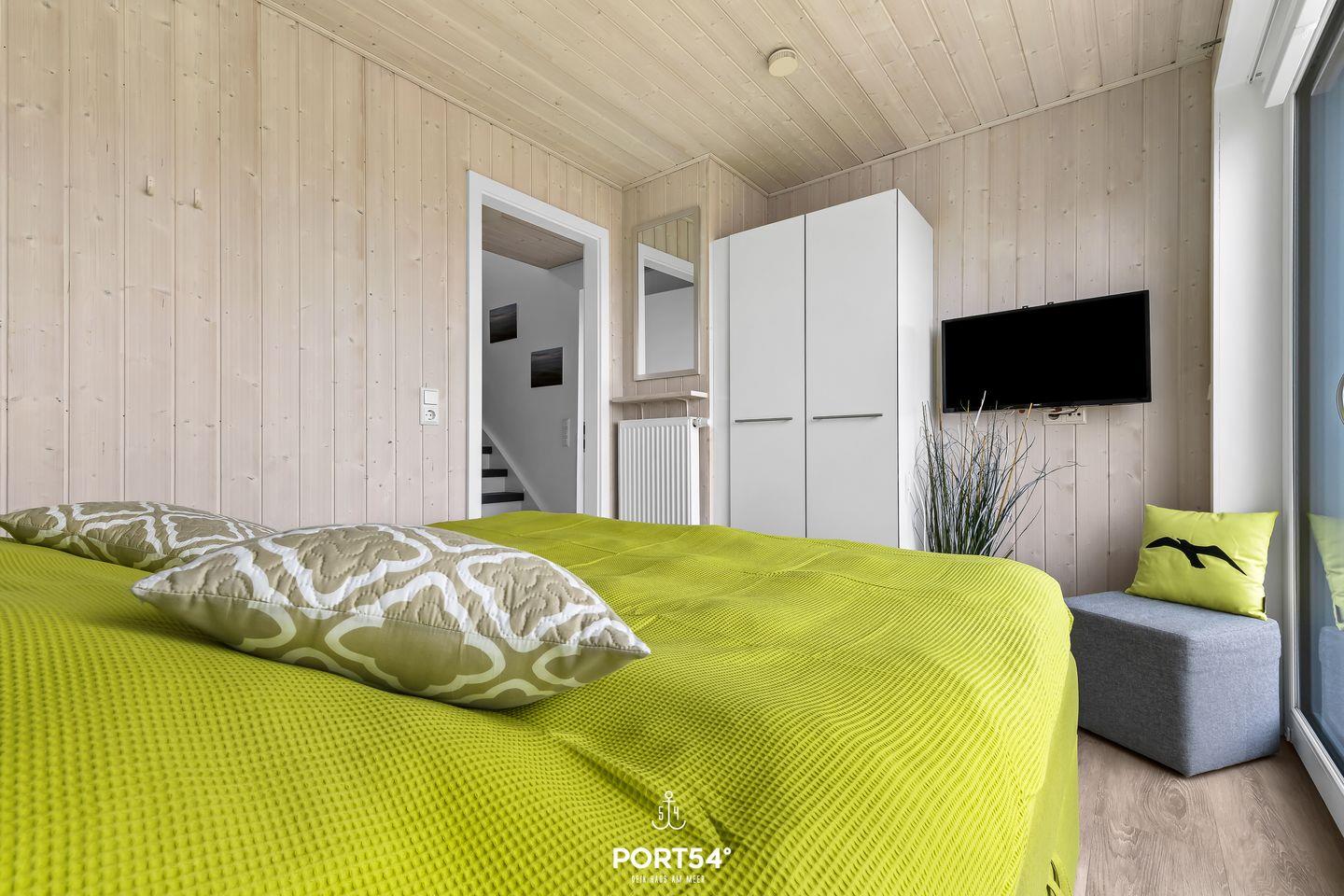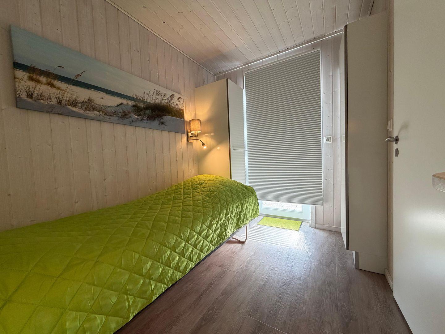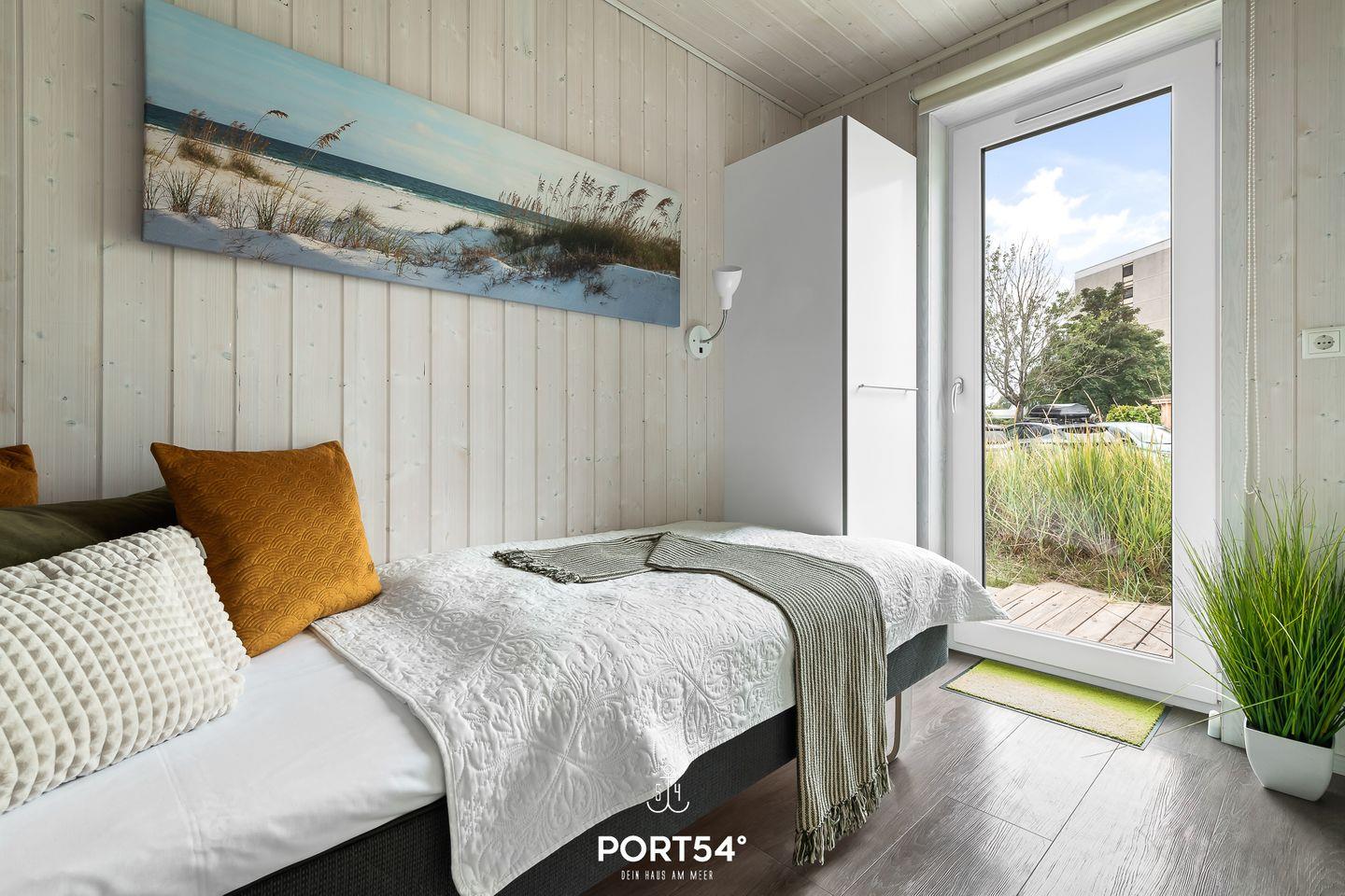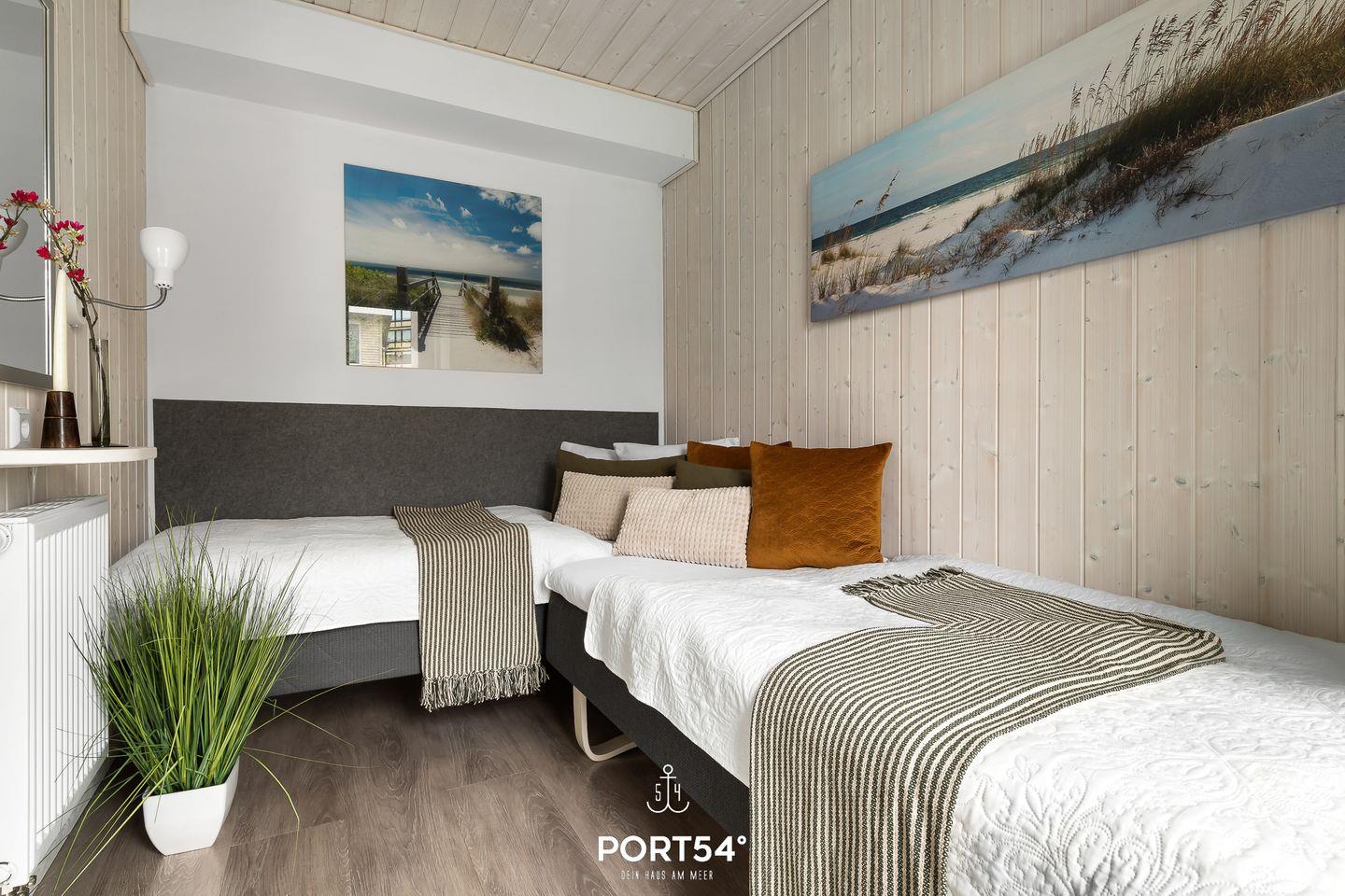 Über die Treppe erreichst du das Erdgeschoß. Das Herzstück im Erdgeschoß ist das kleine aber feine Wellness-Bad mit einer Trockensauna. Freu dich auf die bodentiefe Regendusche. Ein Badschrank mit Schubladen für Ihre Kosmetikartikel befindet sich unter dem Waschbecken. Ebenfalls im Erdgeschoss befinden sich zwei Schlafzimmer: Das Erste liegt zur Seeseite. Es verfügt über bodentiefe Fenster, einen wunderschönen Blick in den Strandgarten und eine geräumige Terrasse. Du schläfst in zwei nebeneinander stehenden, bequemen Einzel-Boxspringbetten (zusammen 180x200cm). Im diesem Schlafzimmer befindet sich ein Fernseher, die Fenster verfügen über Verdunkelungsvorhänge für einen ungestörten Schlaf. Das andere Schlafzimmer verfügt ebenfalls über zwei Einzel- Boxspringbetten (je 90x200cm), sie stehen über Eck. Ein Verdunkelungsrollo sorgt für erholsamen Schlaf. Dieses Zimmer hat eine große Tür, die nach draußen auf die Holzdielen führt. Im Außenbereich befinden sich mehrere Sitzmöglichkeiten mit und ohne Tisch, ein Sonnenschirm, Sonnenliegen sowie ein hochwertiger Holzkohlegrill.