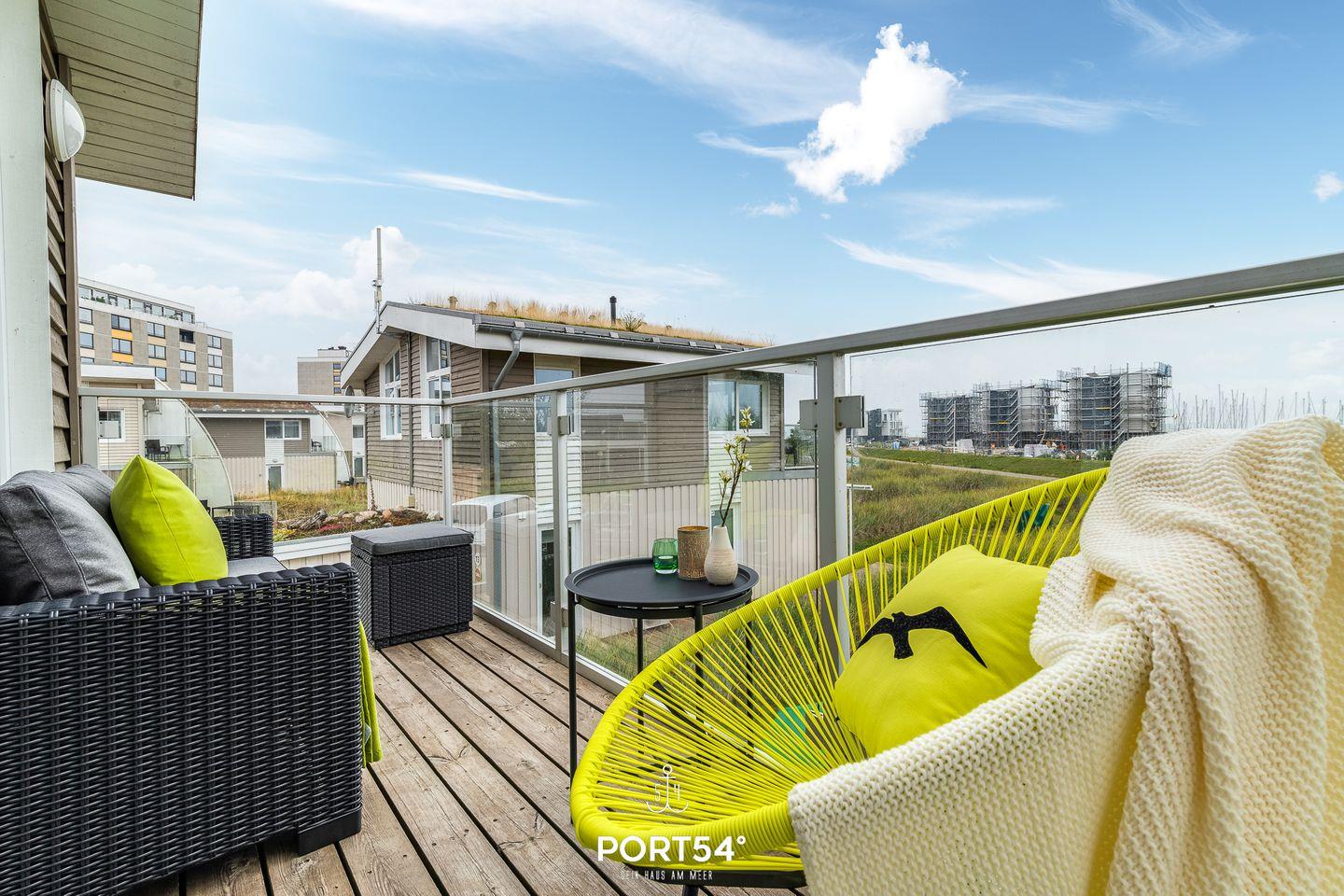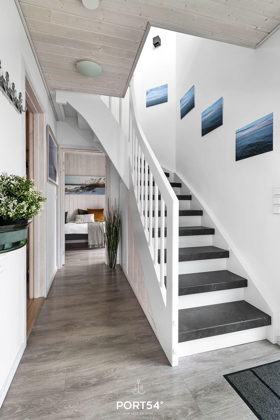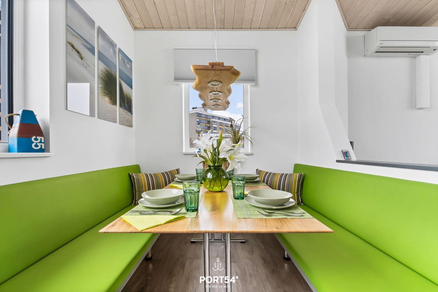 Freue dich auf einen einzigartigen Meerblick vom Sofa, Sessel oder dem gemütlich eingerichteten Balkon und beobachte die großen und kleinen Schiffe, die nach Kiel und in den Nord-Ostsee-Kanal ein- und auslaufen. Ein großer Spaß für große und kleine Urlauber. Im Obergeschoss erwartet dich durch bodentiefe Fenster ein offener, lichtdurchfluteter Wohn- und Essbereich mit geschmackvoller, maritimer Einrichtung. Der gemütliche Wohnbereich bietet ein komfortables Ecksofa, einen Drehsessel mit Fußhocker für entspannte