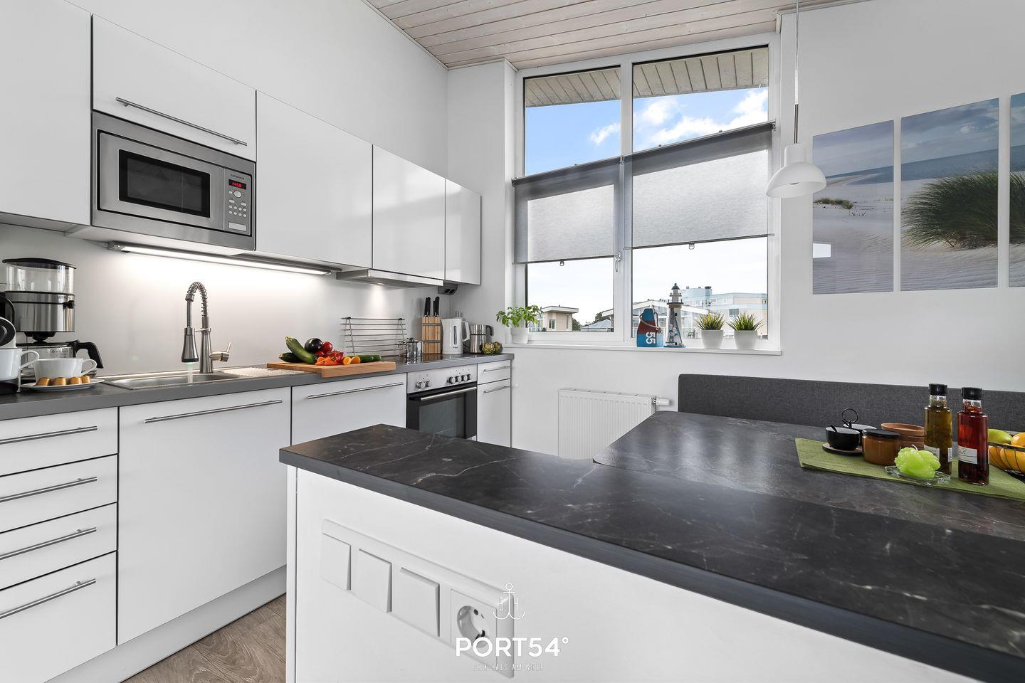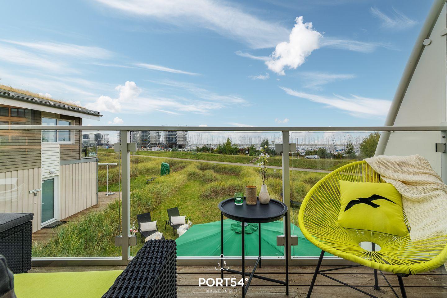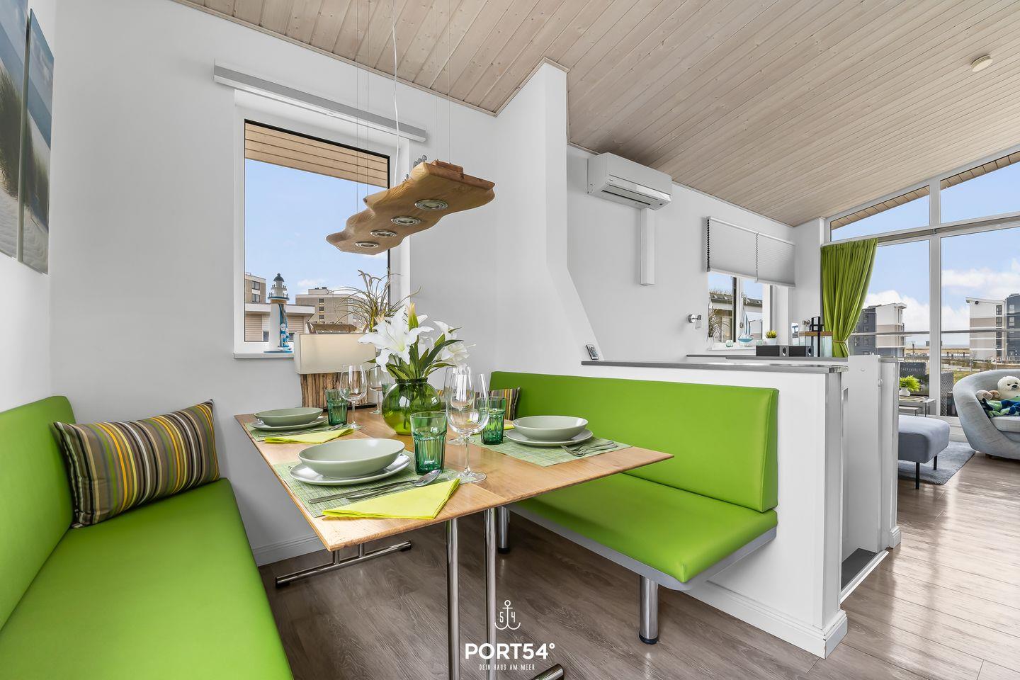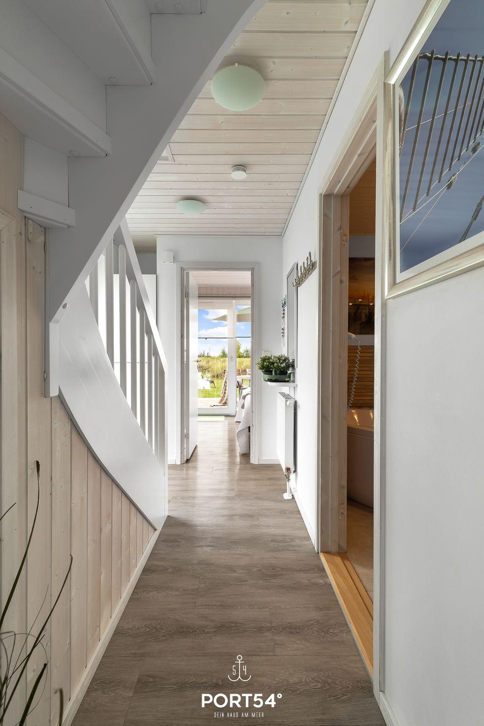 Freue dich auf einen einzigartigen Meerblick vom Sofa, Sessel oder dem gemütlich eingerichteten Balkon und beobachte die großen und kleinen Schiffe, die nach Kiel und in den Nord-Ostsee-Kanal ein- und auslaufen. Ein großer Spaß für große und kleine Urlauber. Im Obergeschoss erwartet dich durch bodentiefe Fenster ein offener, lichtdurchfluteter Wohn- und Essbereich mit geschmackvoller, maritimer Einrichtung. Der gemütliche Wohnbereich bietet ein komfortables Ecksofa, einen Drehsessel mit Fußhocker für entspannte