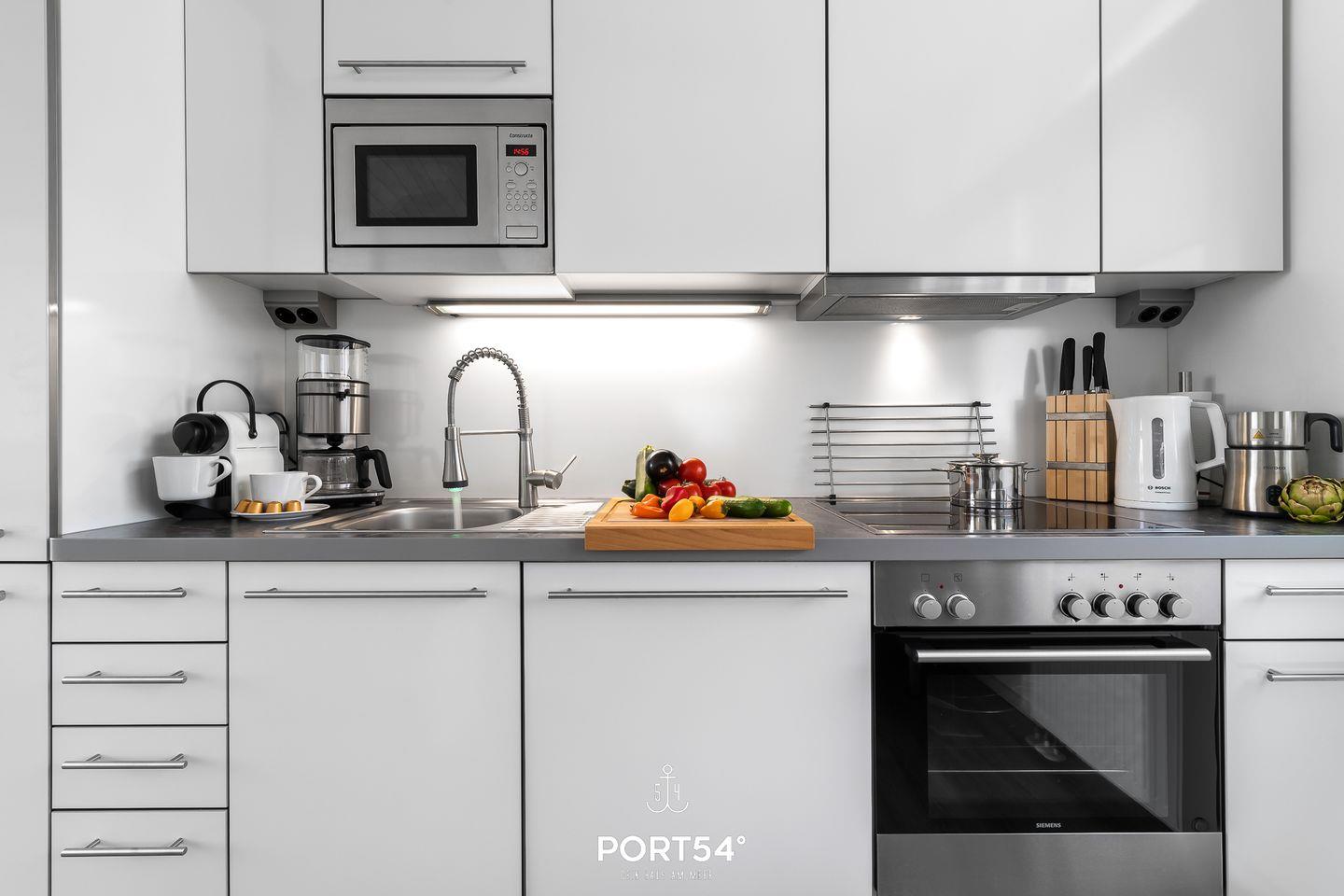 Momente, einen großen 50-Zoll-Fernseher, einen Bioethanol-Kamin und den natürlich den Zugang zum Balkon. Auch von der Essecke aus genießt du den herrlichen Meerblick. Die hervorragend ausgestattete Küche mit Induktionskochfeld und umfangreichem Kücheninventar lädt zum Kochen ein. Für Kaffee- und Espressoliebhaber gibt es sowohl eine Kaffee- als auch eine Nespressomaschine und als kleines Highlight einen Milchaufschäumer für herrlichsten Cappuccino, mit dem selbstverständlich auch eine heiße Schokolade zubereitet werden kann. Die vorhandene Klimaanlage verspricht ein angenehmes Innenraumklima an heißen Sommertagen.
