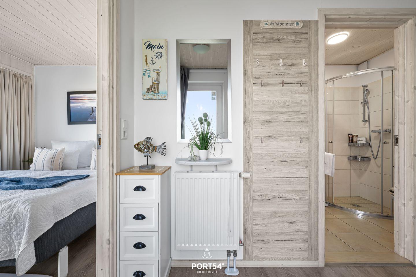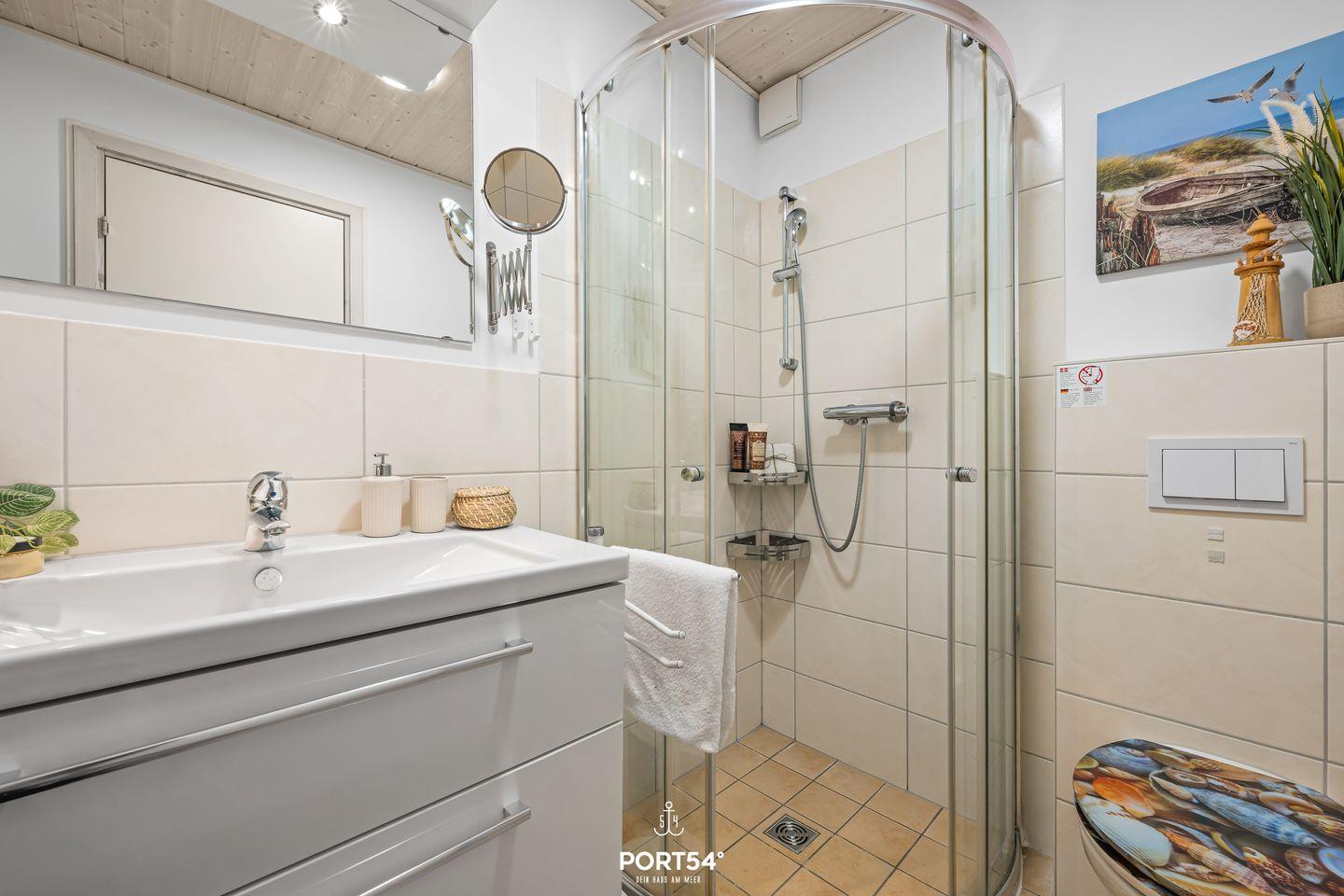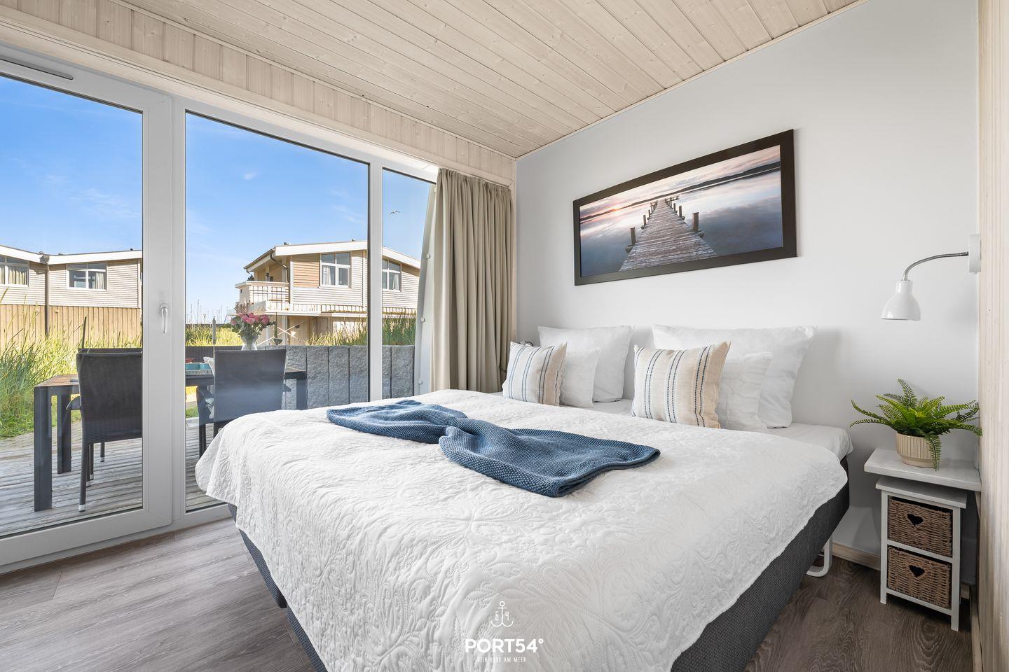Im Erdgeschoss befinden sich zwei Schlafzimmer. Eines davon bietet zwei zusammengeschobene Einzelbetten (zusammen 180x200cm) und das andere zwei Einzelbetten (je 90x200cm). Eines der Schlafzimmer verfügt über einen TV, sowie beide über verdunkelbare Fenster. Ebenfalls im Erdgeschoss gelegen: das Badezimmer mit angenehmer Fußbodenheizung, ebenerdiger Dusche, WC, Waschbecken und Trockensauna.