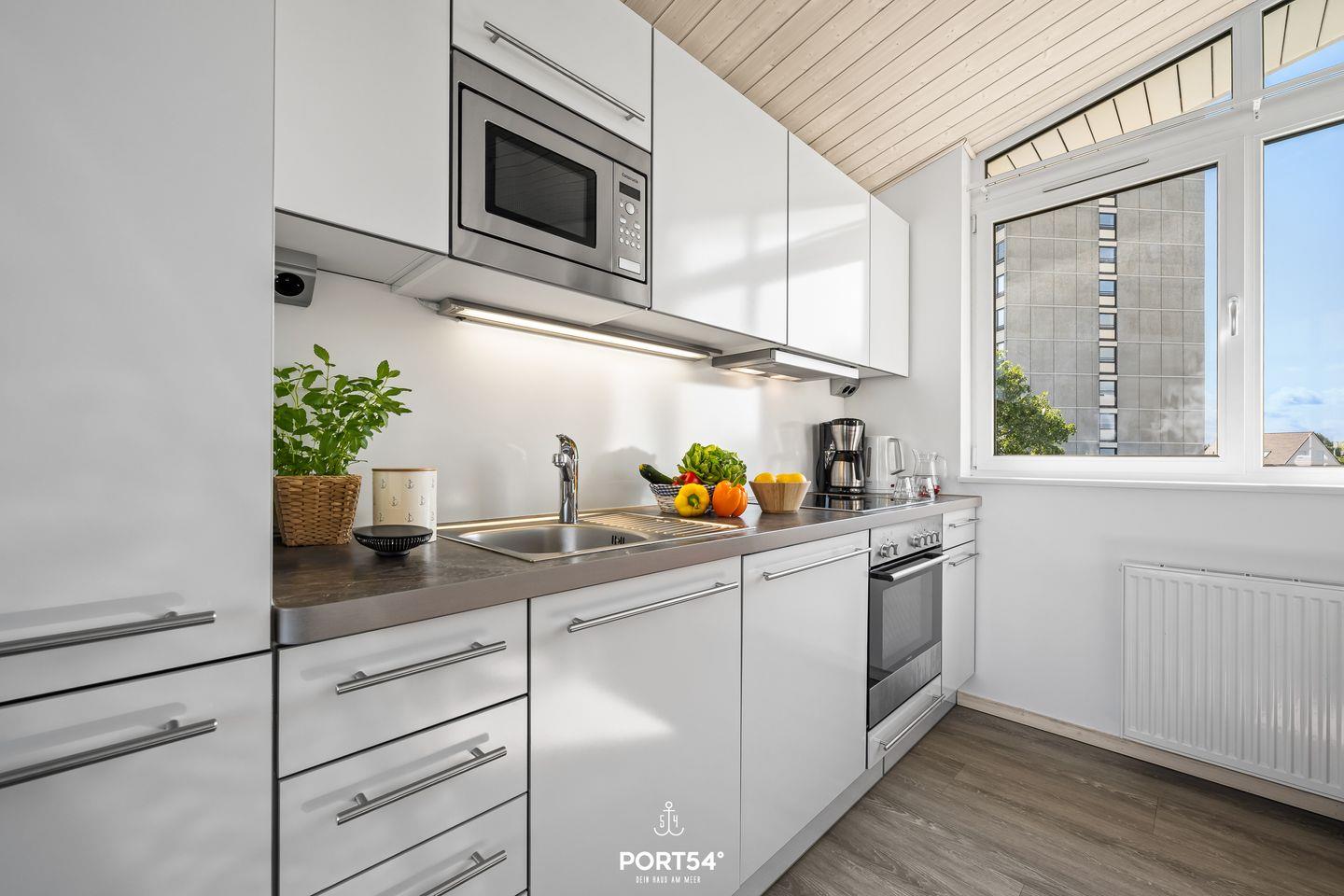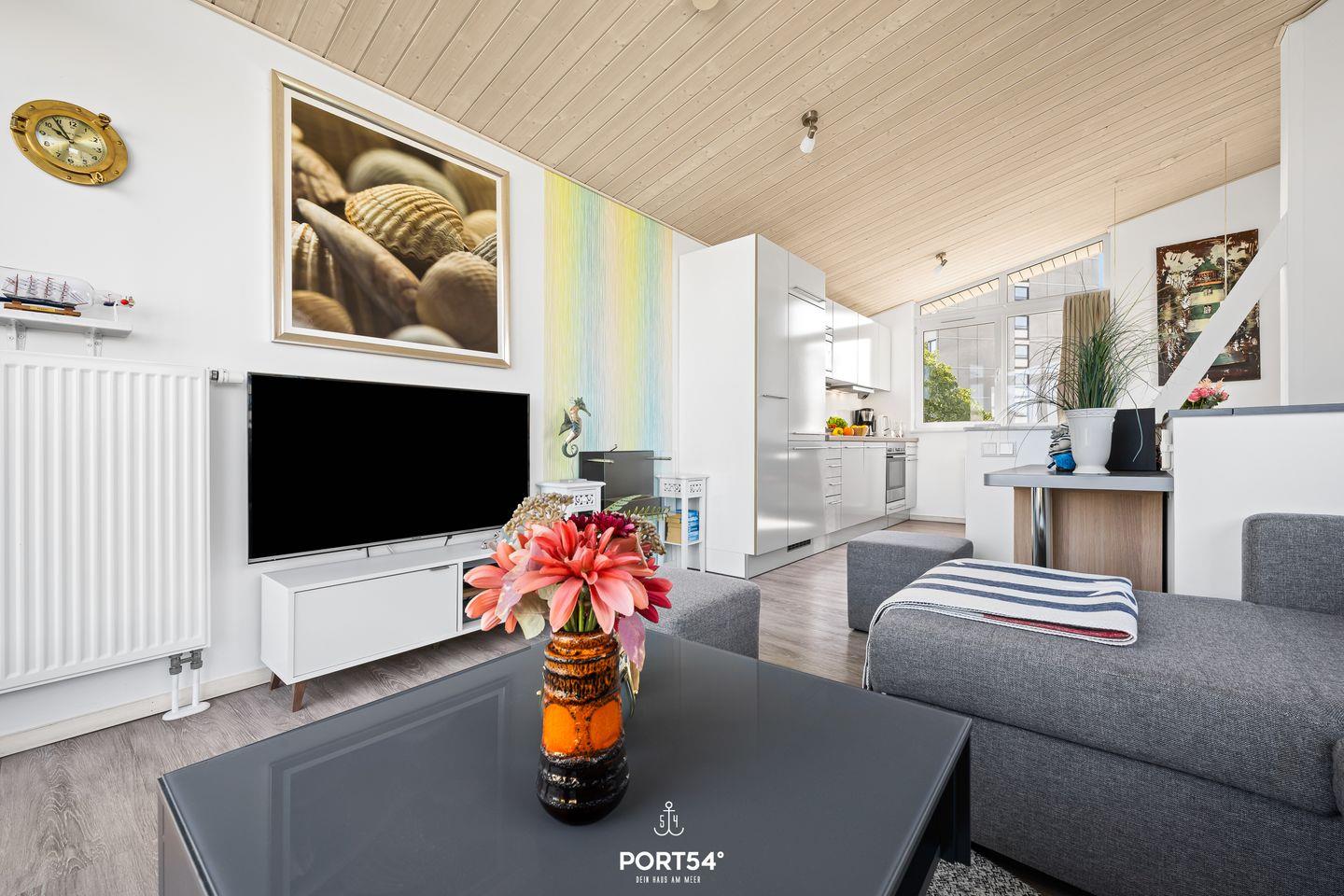 Im ersten Obergeschoss erwartet Sie ein offener, lichtdurchflutetet Wohn- und Essbereich mit angrenzender vollausgestatteter Küche. Der gemütliche Wohnbereich bietet ausreichend Sitzgelegenheiten, einen 50-Zoll-TV, einen Bioethanol-Kamin und den Zugang zum Balkon. Die vorhandene Klimaanlage verspricht ein angenehmes Innenraumklima zu jeder Zeit. Im Außenbereich befinden sich Sitzmöglichkeiten, ein Sonnenschirm, Sonnenliegen sowie ein Holzkohlegrill. Ebenfalls befindet sich direkt am Haus ein kostenfreier PKW Stellplatz und ein abschließbarer Fahrradschuppen mit E-Bike Lademöglichkeiten. Ob laue Sommerabende, stürmische Herbstnachmittage oder kühle Wintertage: diese Doppelhaushälfte besticht mit seiner Ausstattung sowie einer naturnahen Umgebung zu jeder Jahreszeit. Vom Balkon aus genießen Sie den Blick Richtung Meer.