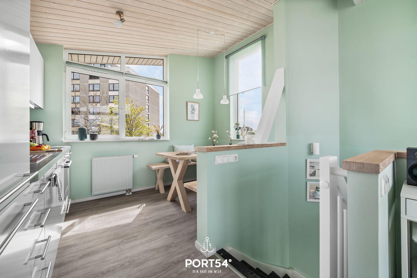 Das lichtdurchflutete Wohnzimmer bildet das Herzstück des Hauses und ist offen mit der bestens ausgestatteten Küche verbunden. Hier finden Sie moderne Geräte wie Ceranherd, Backofen, Mikrowelle, Kühlschrank mit extra Gefrierschrank, Spülmaschine, Wasserkocher, Toaster sowie eine Nespresso-Maschine und einen Mixer. Die Küchenutensilien und Geschirrhandtücher sind ebenfalls vorhanden und gewährleisten Ihnen einen angenehmen Selbstversorger-Aufenthalt. Der gemütliche Essbereich schließt sich direkt an und lädt zu entspannten gemeinsamen Mahlzeiten ein.