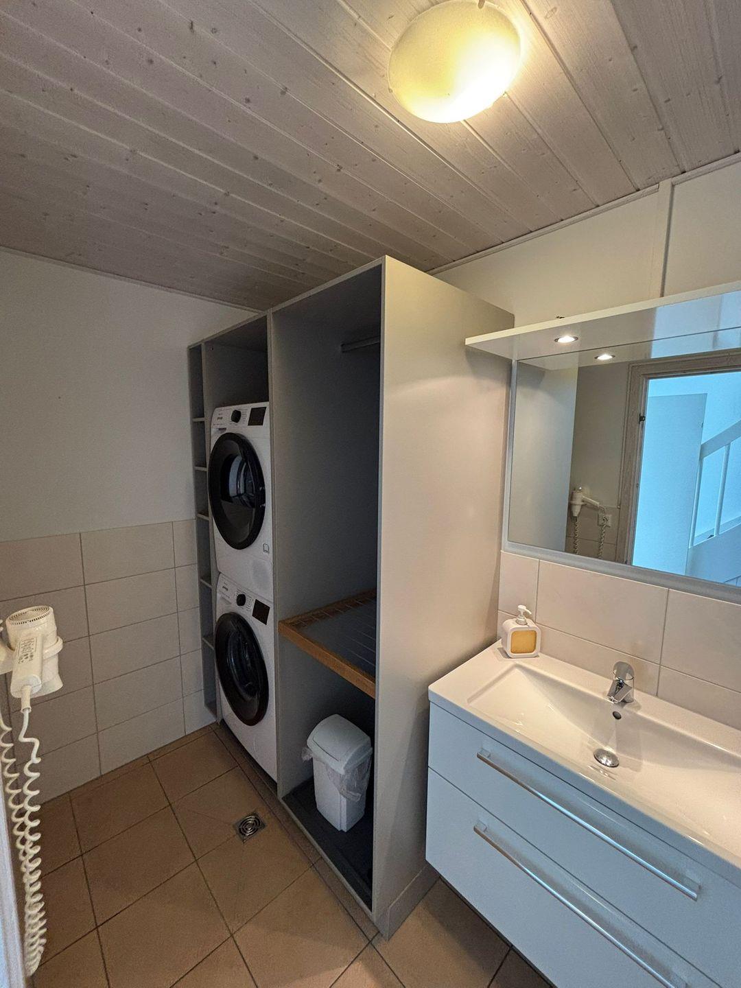 Im Erdgeschoss befinden sich zwei Schlafzimmer. Eines davon bietet zwei zusammengeschobene Einzelbetten (zusammen 180x200cm) und das andere zwei Einzelbetten (je 90x200cm). Eines der Schlafzimmer verfügt über einen TV, sowie beide über abdunkelbare Fenster. Ebenfalls im Erdgeschoss gelegen: das Badezimmer mit angenehmer Fußbodenheizung, ebenerdiger Dusche, Waschmaschine, Trockner, WC und Waschbecken.