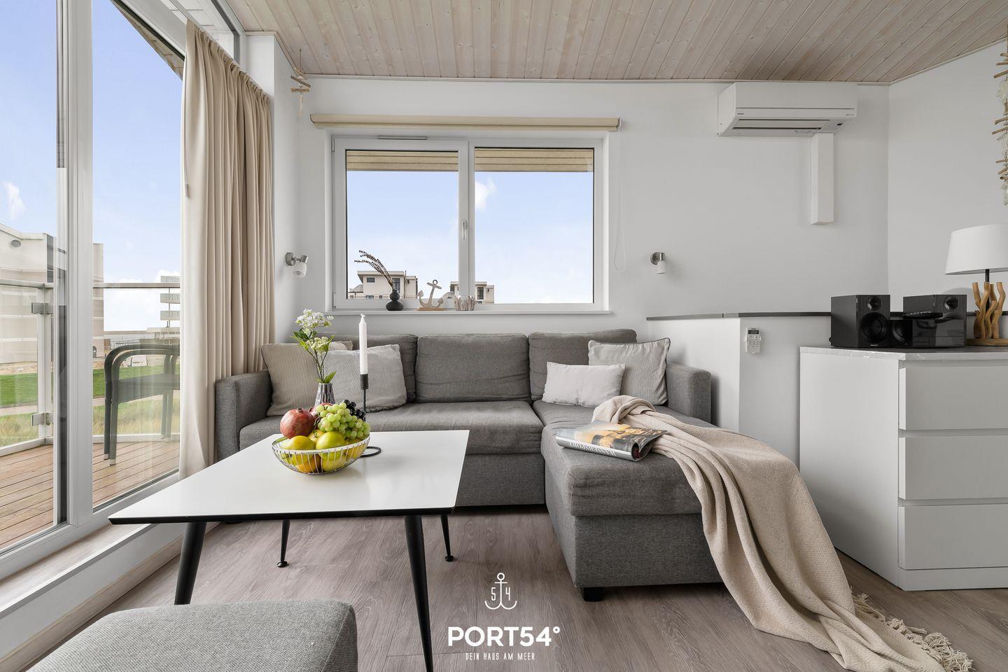 Im Obergeschoss erwartet Sie ein offener, lichtdurchfluteter Wohn- und Essbereich mit Schlafcouch für 2 Kinder und angrenzender vollausgestatteter Küche. Der gemütliche Wohnbereich bietet ausreichend Sitzgelegenheiten, einen 50-Zoll-SmartTV, einen Bioethanol-Kamin und den Zugang zum Balkon. Die vorhandene Klimaanlage verspricht ein angenehmes Innenraumklima zu jeder Zeit. Das Obergeschoss ist mit einem variablen Treppenschutzgitter ausgestattet.