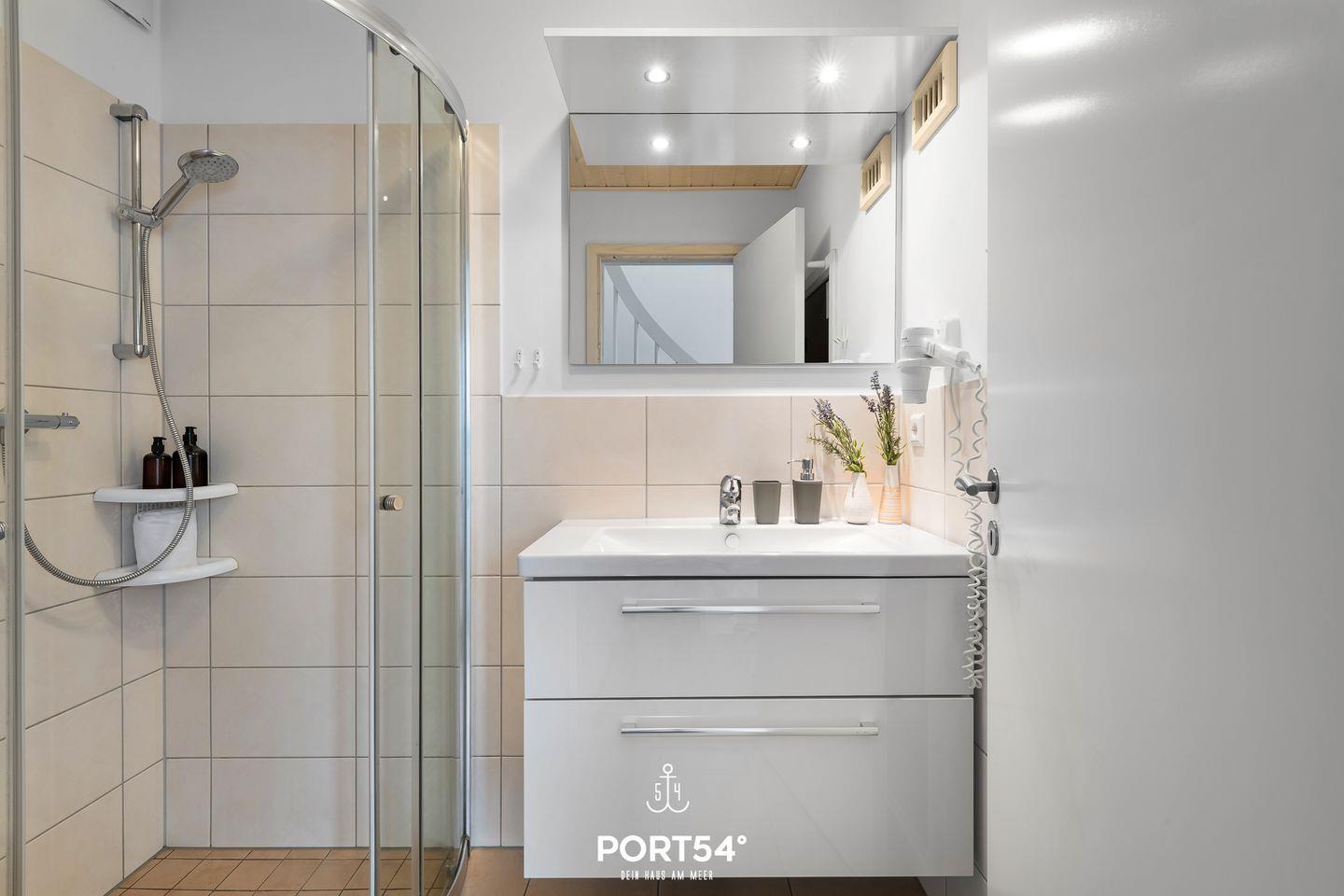 Im Außenbereich befinden sich Sitzmöglichkeiten, ein Sonnenschirm, Sonnenliegen sowie ein Holzkohlegrill. Ebenfalls befindet sich am Haus ein kostenfreier PKW Stellplatz und ein abschließbarer Fahrradschuppen. Vom Balkon aus genießen Sie den Blick auf die Ostsee und den Yachthafen.