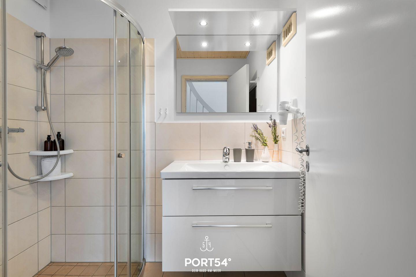 Im Erdgeschoss befinden sich zwei Schlafzimmer. Eines davon bietet zwei zusammengeschobene Einzelbetten (zusammen 180x200cm) und das andere zwei Einzelbetten (je 90x200cm). Eines der Schlafzimmer verfügt über einen TV, sowie beide über verdunkelbare Fenster. Ebenfalls im Erdgeschoss gelegen: das Badezimmer mit angenehmer Fußbodenheizung, ebenerdiger Dusche, WC, Waschbecken und Trockensauna.