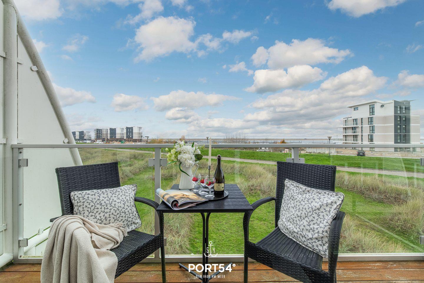 Im Außenbereich befinden sich Sitzmöglichkeiten, ein Sonnenschirm, Sonnenliegen sowie ein Holzkohlegrill. Ebenfalls befindet sich am Haus ein kostenfreier PKW Stellplatz und ein abschließbarer Fahrradschuppen. Vom Balkon aus genießt du den Blick auf die Ostsee und den Yachthafen.