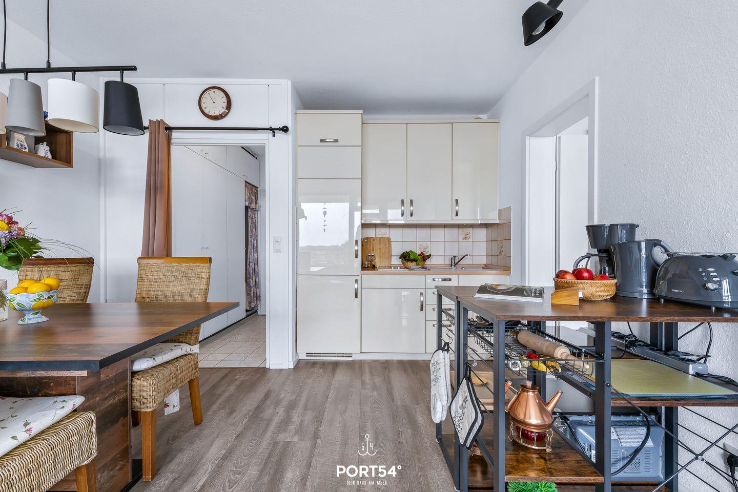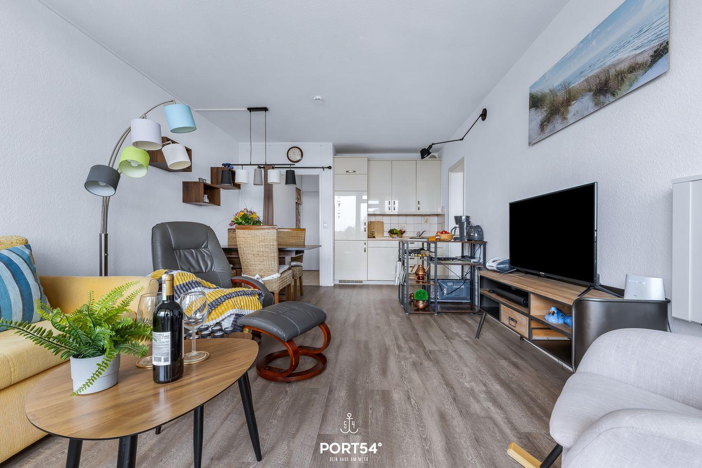 Gemütlichkeit und Komfort erwarten dich im Inneren der Wohnung. Neben einem hellen und freundlich gestalteten Wohnzimmer, das mit einem Sofa und einem Sessel ausgestattet ist, findest du hier auch einen Essbereich, der Platz für gesellige Abende mit Familie und Freunden bietet. Das Schlafzimmer ist mit 4 Schlafplätzen ausgestattet, wovon es sich bei einem Bett um ein Etagenbett handelt. Das Etagenbett ist von einem Raumtrenner von den anderen Schlafplätzen (zwei Einzelbetten, die zu einem großen Doppelbett zusammengeschoben werden können) getrennt. Für deine kulinarischen Bedürfnisse steht dir eine offene, gut ausgestattete Küche zur Verfügung, die mit einem 2-Platten-Herd, Kühlschrank, Geschirr und Besteck sowie Küchenutensilien ausgestattet ist. Genieße deine Mahlzeiten auf einem der beiden Balkone, wo du frische Meeresluft tanken kannst.