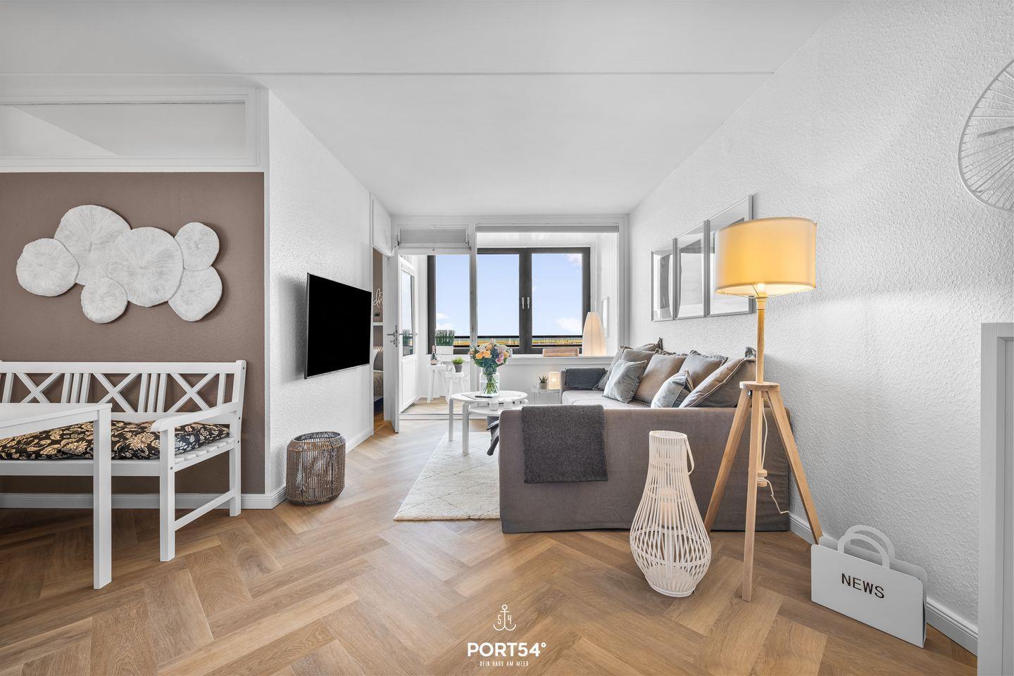 Die Wohnung befindet sich im 6. Stock und beeindruckt mit einem außergewöhnlich guten Meerblick, der Ihnen bereits beim Aufwachen den Atem rauben wird. Genießen Sie die frische Meeresluft, während Sie den Sonnenaufgang über der Ostsee beobachten. Die lichtdurchfluteten Räumlichkeiten sind geschmackvoll eingerichtet und bieten Ihnen eine gemütliche Atmosphäre. Der offene Wohnbereich mit einer komfortablen Sofaecke (Schlafcouch) lädt zum Entspannen ein und ist mit einem 48-Zoll-Fernseher sowie einer HiFi-Anlage ausgestattet. Ein extra Schlafzimmer, das durch eine verschließbare Tür vom Wohnraum abgetrennt ist verfügt über ein Doppelbett.