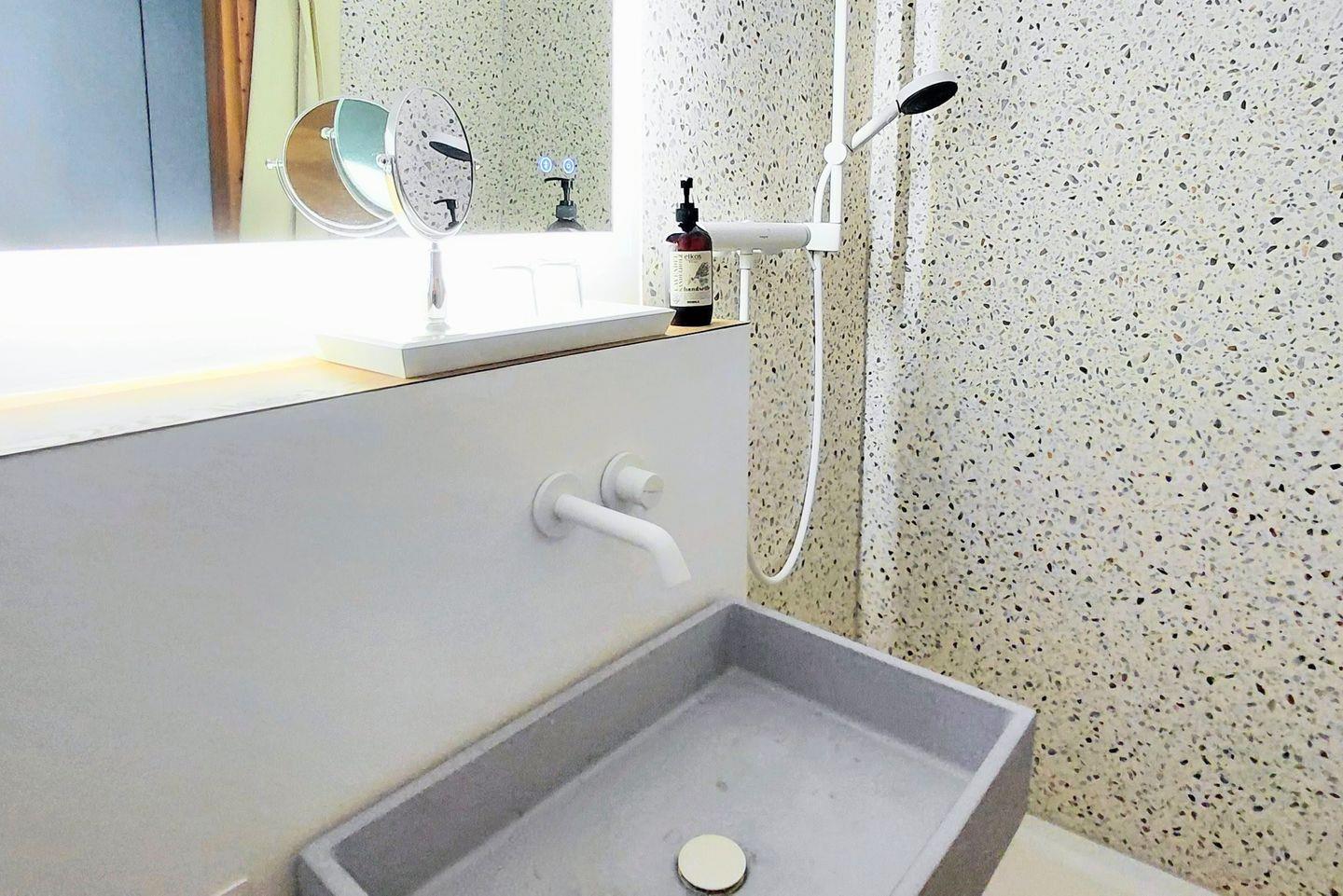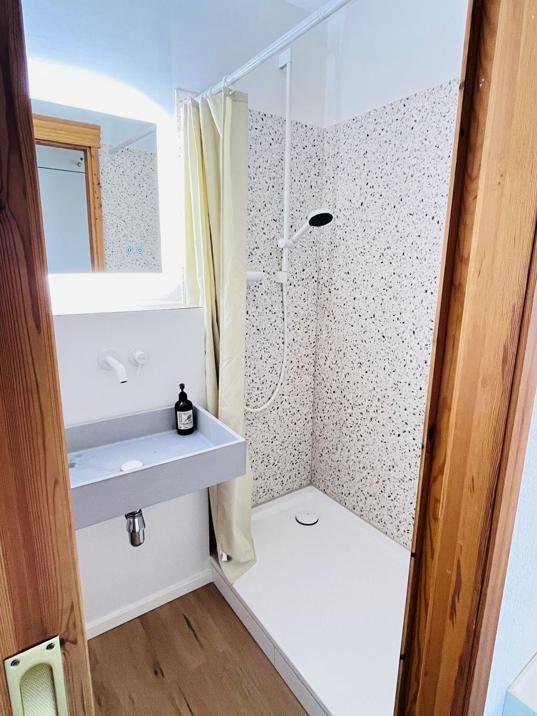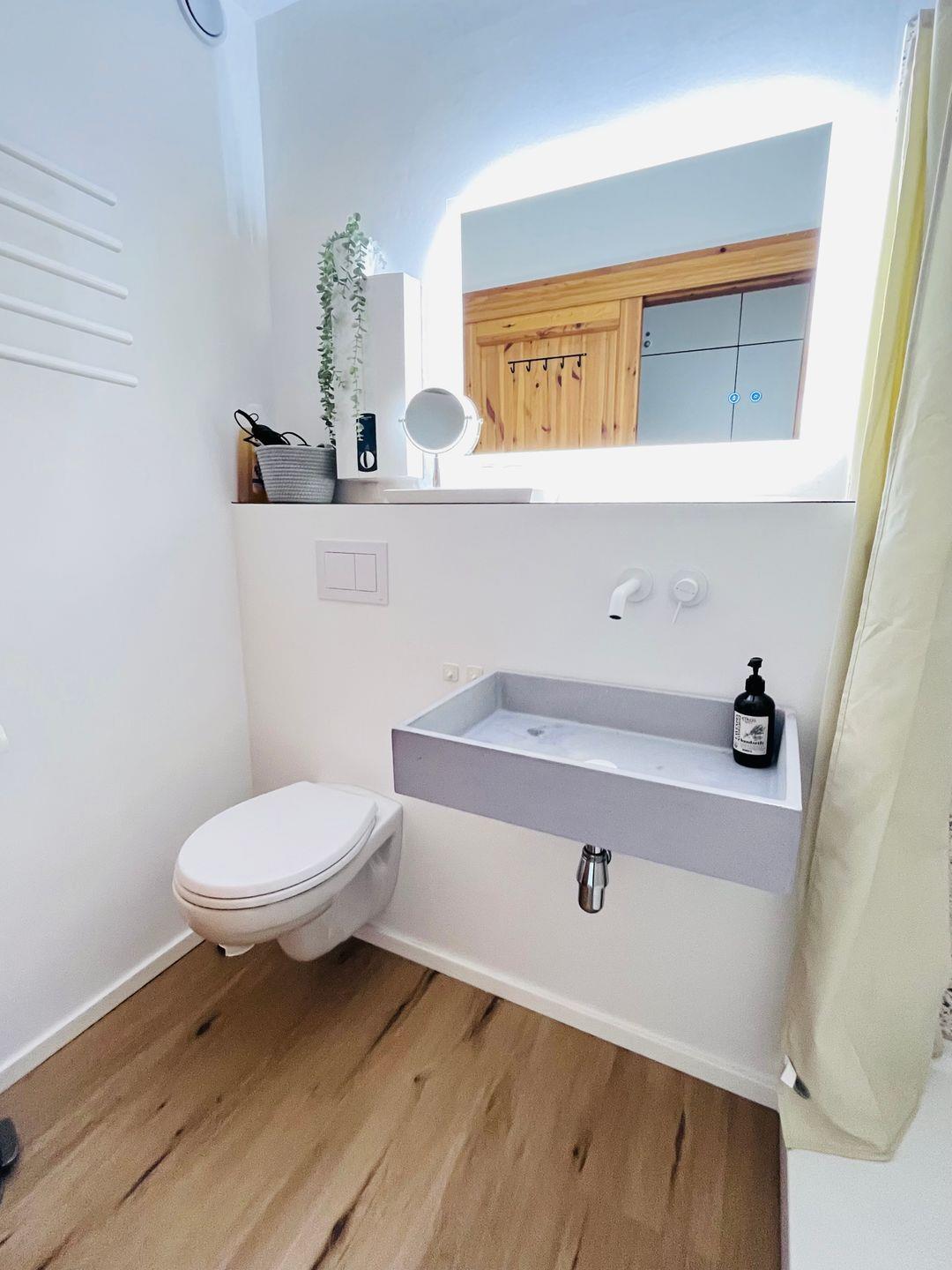 Das modernisierte Badezimmer verfügt über Dusche, WC, Waschbecken, Spiegel und Haartrockner. Rauchmelder sorgen für zusätzliche Sicherheit, und alle Fenster sind mit Sichtschutz versehen. Ein Staubsauger steht ebenfalls zur Verfügung.