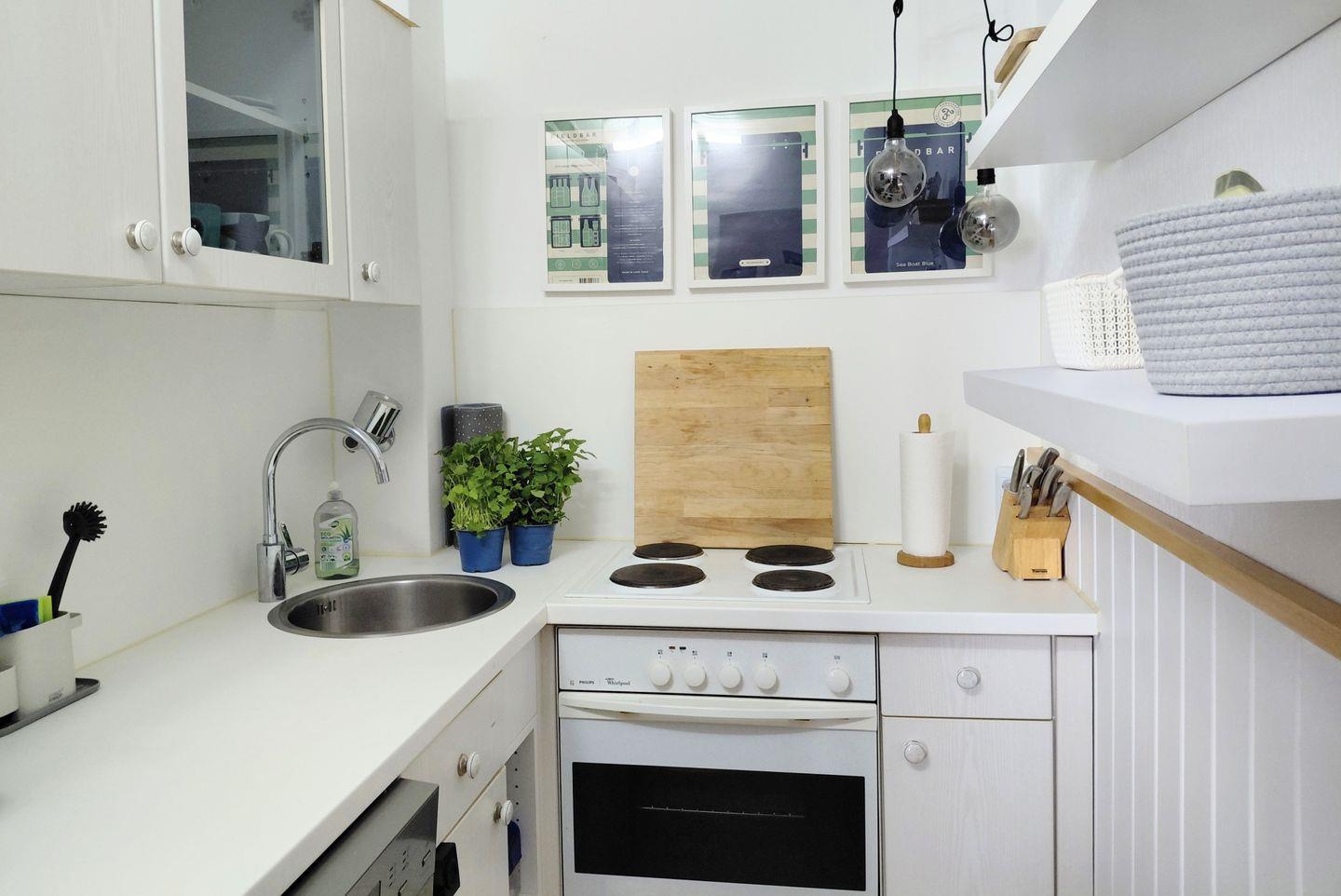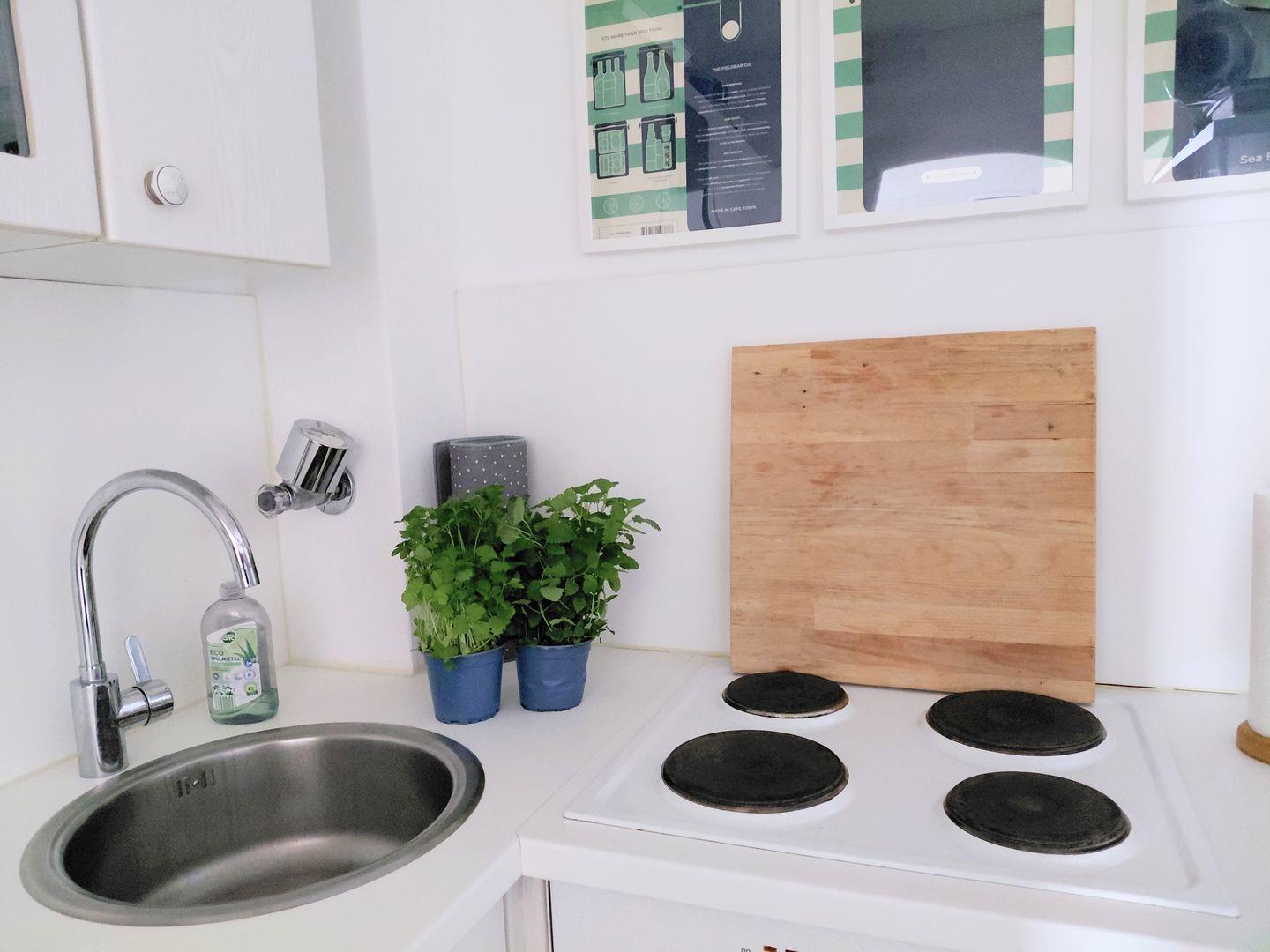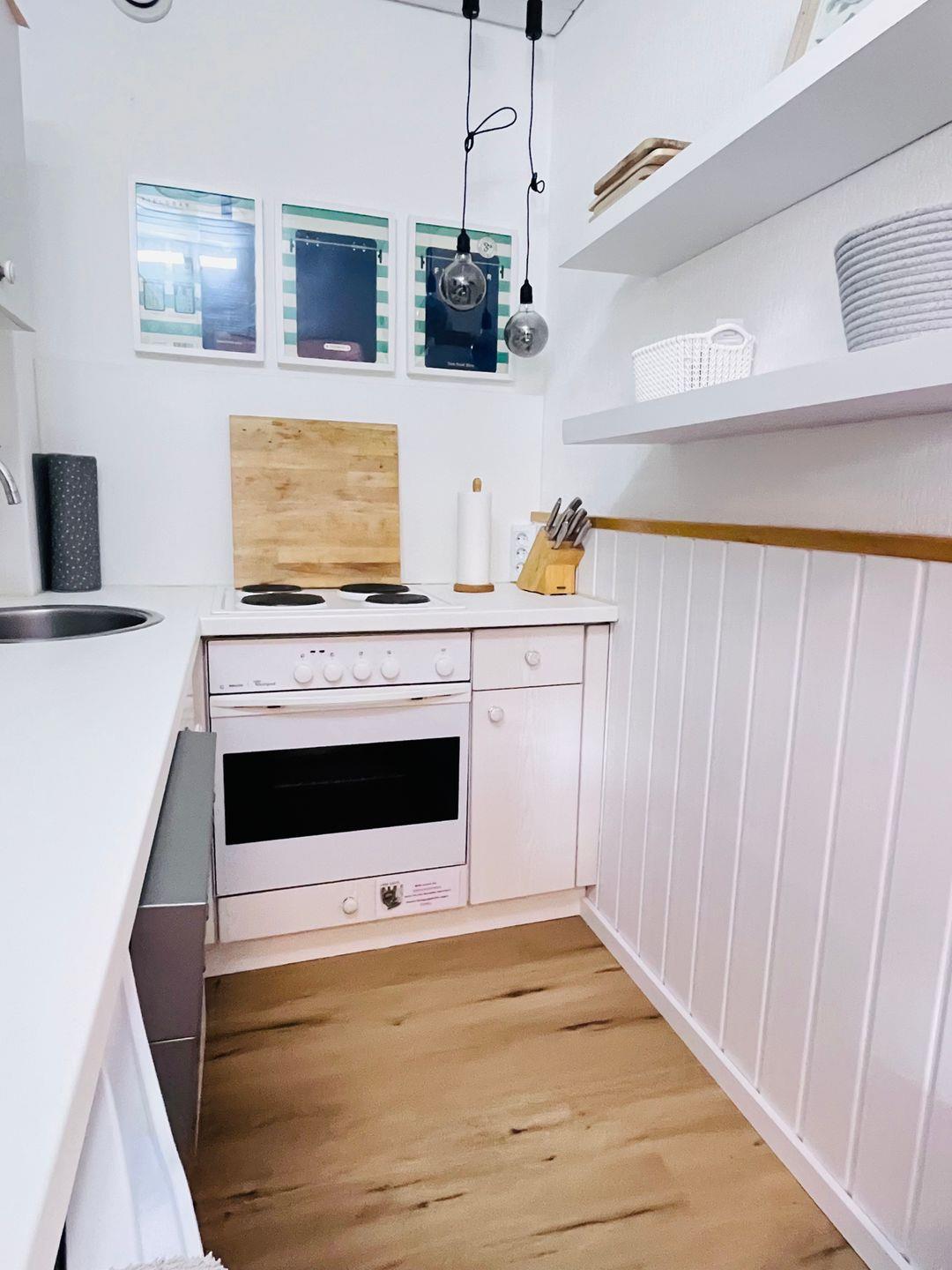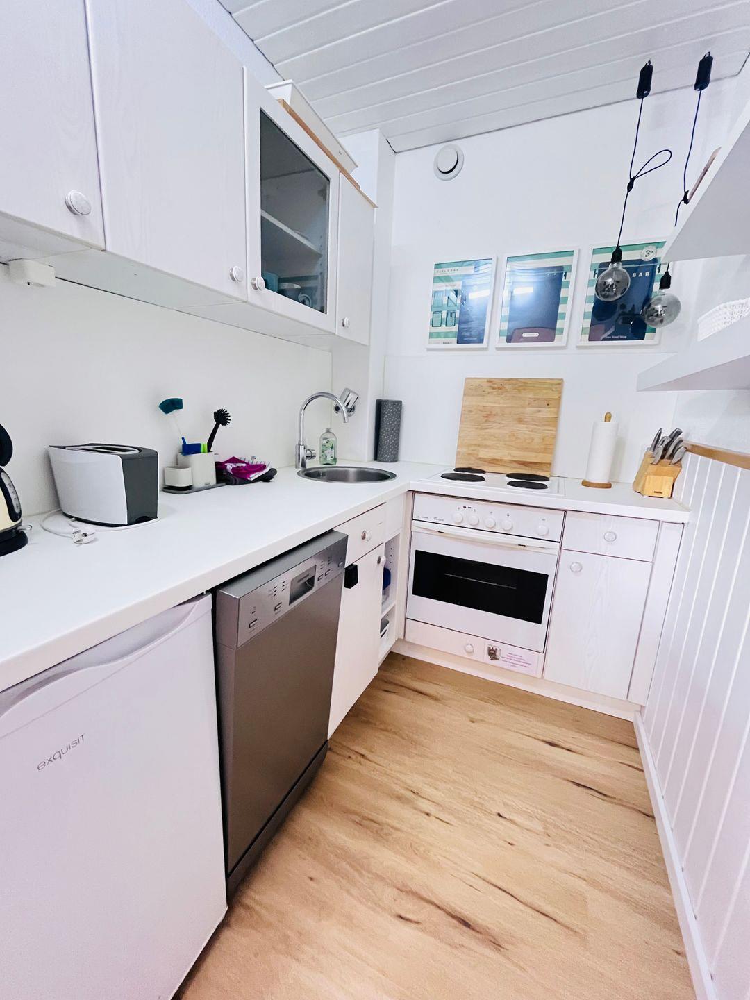 Die Kochnische ist umfangreich ausgestattet und ermöglicht eine angenehme Selbstversorgung: Ceranherd, Backofen, Kaffeemaschine, Toaster, Wasserkocher sowie ein Kühlschrank mit Gefrierfach sind vorhanden. Küchenutensilien, Geschirr, Besteck und Geschirrhandtücher stehen ebenfalls bereit. Ein Esstisch mit vier Stühlen rundet den Bereich ab. Eine Erstausstattung sorgt für eine bequeme Ankunft, und auf Wunsch kann ein Einkaufsservice alle Verpflegungswünsche erfüllen.