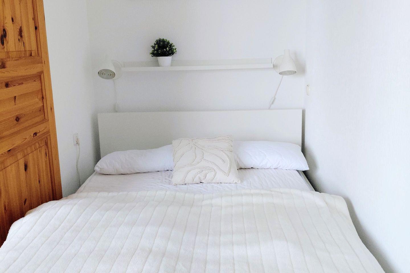 Das Schlafzimmer ist mit einem Doppelbett (140 × 200 cm), einer Kommode und einem TV ausgestattet. Zwei weitere Personen können auf der komfortablen Schlafcouch im Wohnzimmer übernachten.