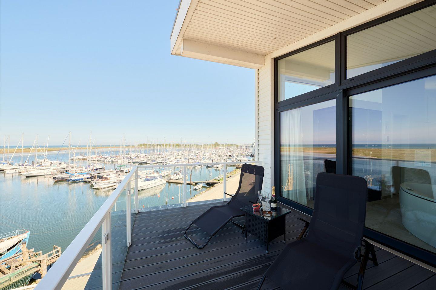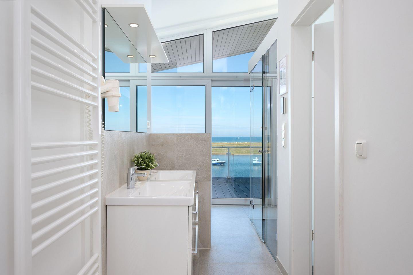 Das Wohnzimmer ist ausgestattet mit einer gemütlichen Sitzecke mit Fernseher und Blu-Ray-Player, einer Musikanlage mit CD-Player und einem wärmenden Bioethanol-Kamin. Der äußerst großzügige Balkon lädt mit komfortablen Sitzmöbeln und zwei Sonnenliegen zu schönen Stunden ein. Auch die hochwertige Küche ist bestens ausgestattet, sogar ein integrierter Wok ist hier vorhanden. Alle drei Schlafzimmer verfügen über ein Doppelbett und einen eigenen Fernseher. Der Master-Bedroom mit Blick in die Marina besitzt einen direkten Zugang zum Balkon und ein integriertes Badezimmer, hier ist das besondere Highlight die Badewanne mit Whirlpool-Funktion und der grandiose Blick über das Meer – Entspannung pur! Wenn du nicht so gerne badest, nutze einfach die angrenzende Duschkabine mit großer Regendusche, diese kann auch als Dampfsauna genutzt werden. Im zweiten Badezimmer findest du eine weitere Duschkabine und die finnische Sauna. Beide Bäder sind mit Fußbodenheizung ausgestattet.