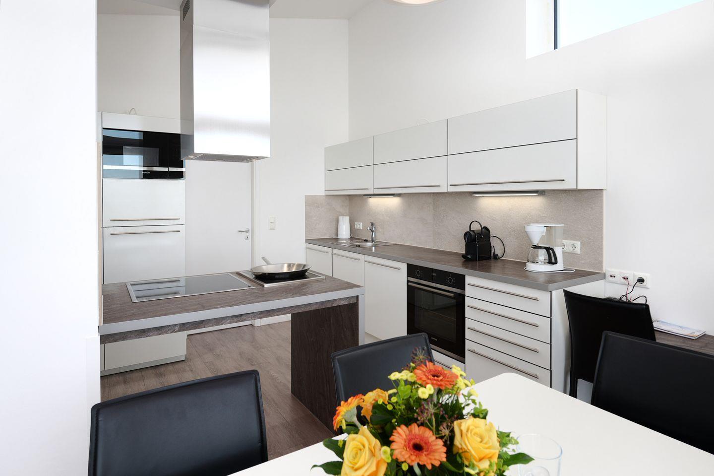 Das Penthouse empfängt dich mit einem traumhaften, offenen Küchen-, Ess- und Wohnbereich mit großer, bodentiefer Fensterfront. Der Ausblick ist einfach beeindruckend, entspannend und wunderschön!