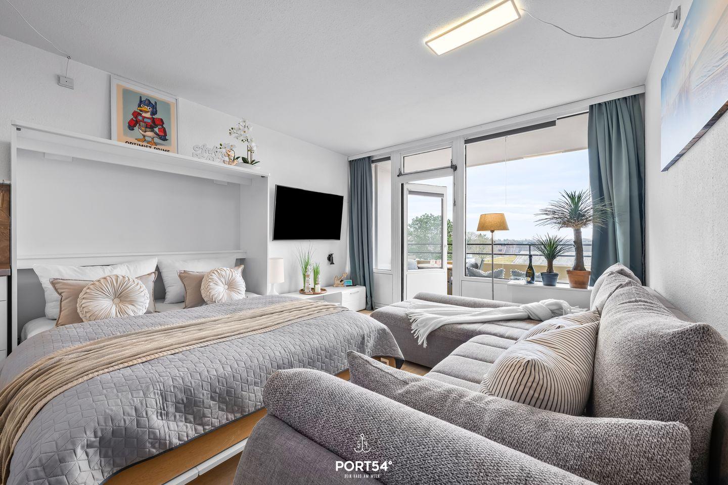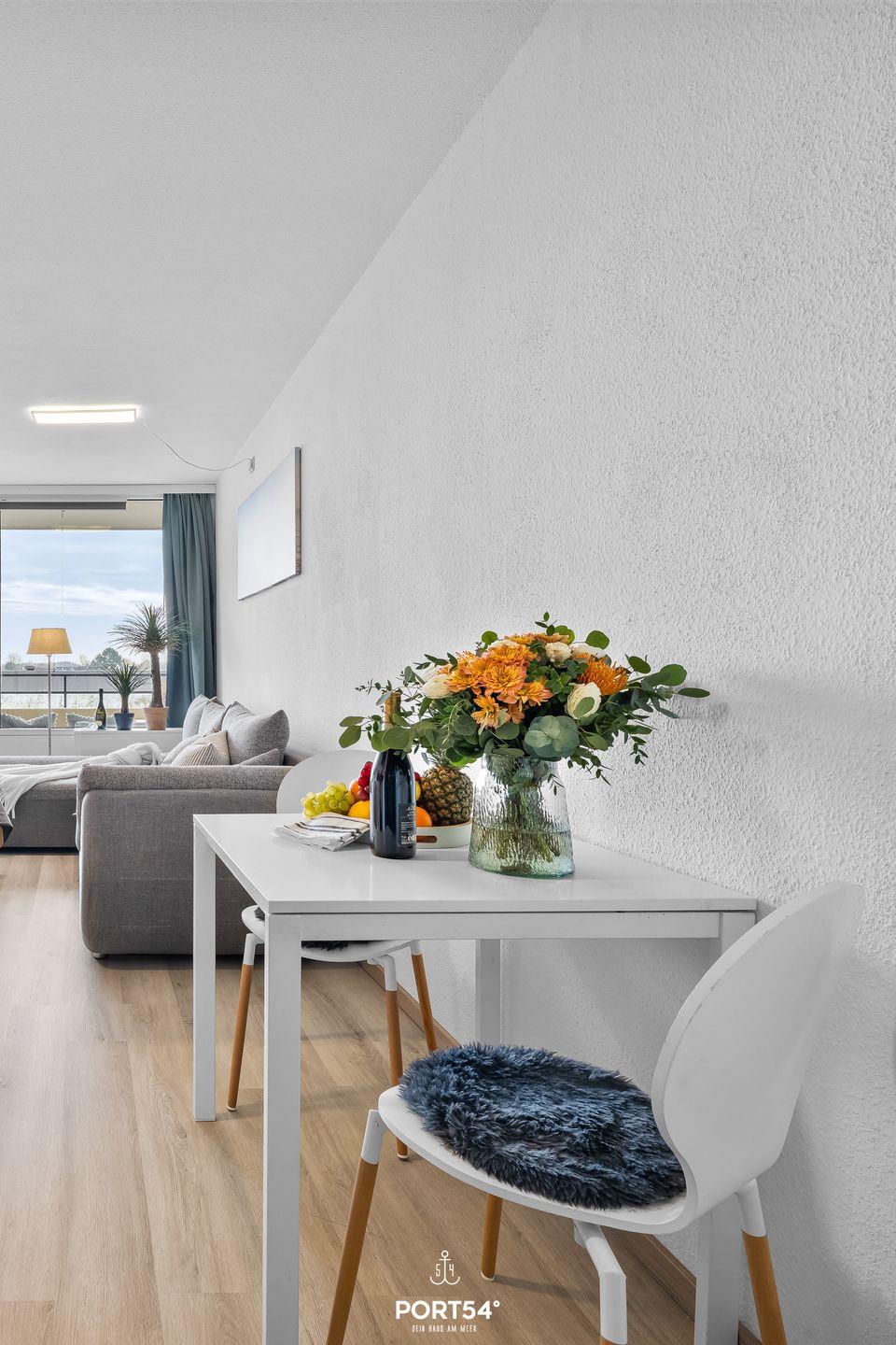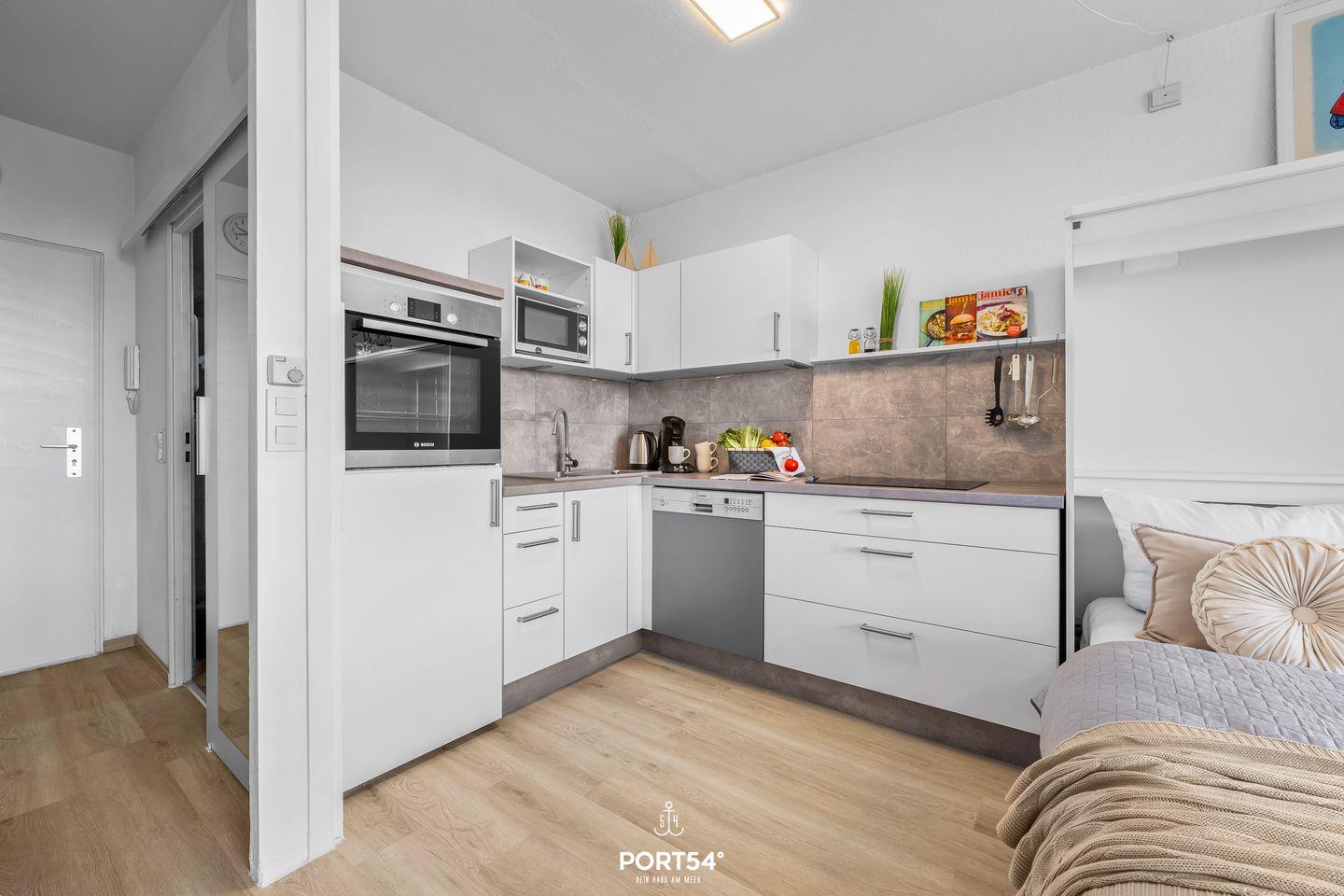 Die helle, offen gestaltete Ein-Raum-Ferienwohnung verfügt über ein großes Schlafsofa, ein Murphy-Schrankbett, einen Essbereich und eine moderne Küchenzeile. Diese ist offen zum Wohnraum und mit zahlreichen Annehmlichkeiten ausgestattet: Neben einem Induktionsherd, Backofen, Kühlschrank mit Gefrierfach, Mikrowelle und Spülmaschine sind auch eine Senseo-Espressomaschine, Toaster, Wasserkocher sowie Geschirr und Küchenutensilien vorhanden. Ein Esstisch bietet den perfekten Ort für gemeinsame Mahlzeiten.