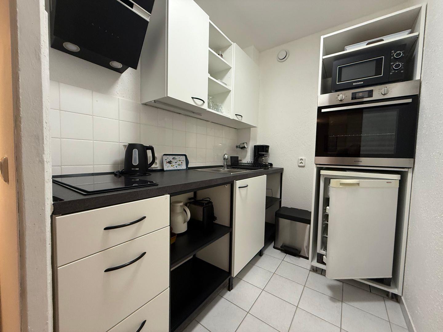 Die kleine, gut ausgestattete Küche mit Essplatz lädt dazu ein, nach Herzenslust zu kochen und gemeinsame Mahlzeiten zu genießen. Der Flur mit Garderobe sorgt dafür, dass alles seinen Platz hat, und das moderne Bad mit Dusche und WC macht deinen Aufenthalt rundum komfortabel.
