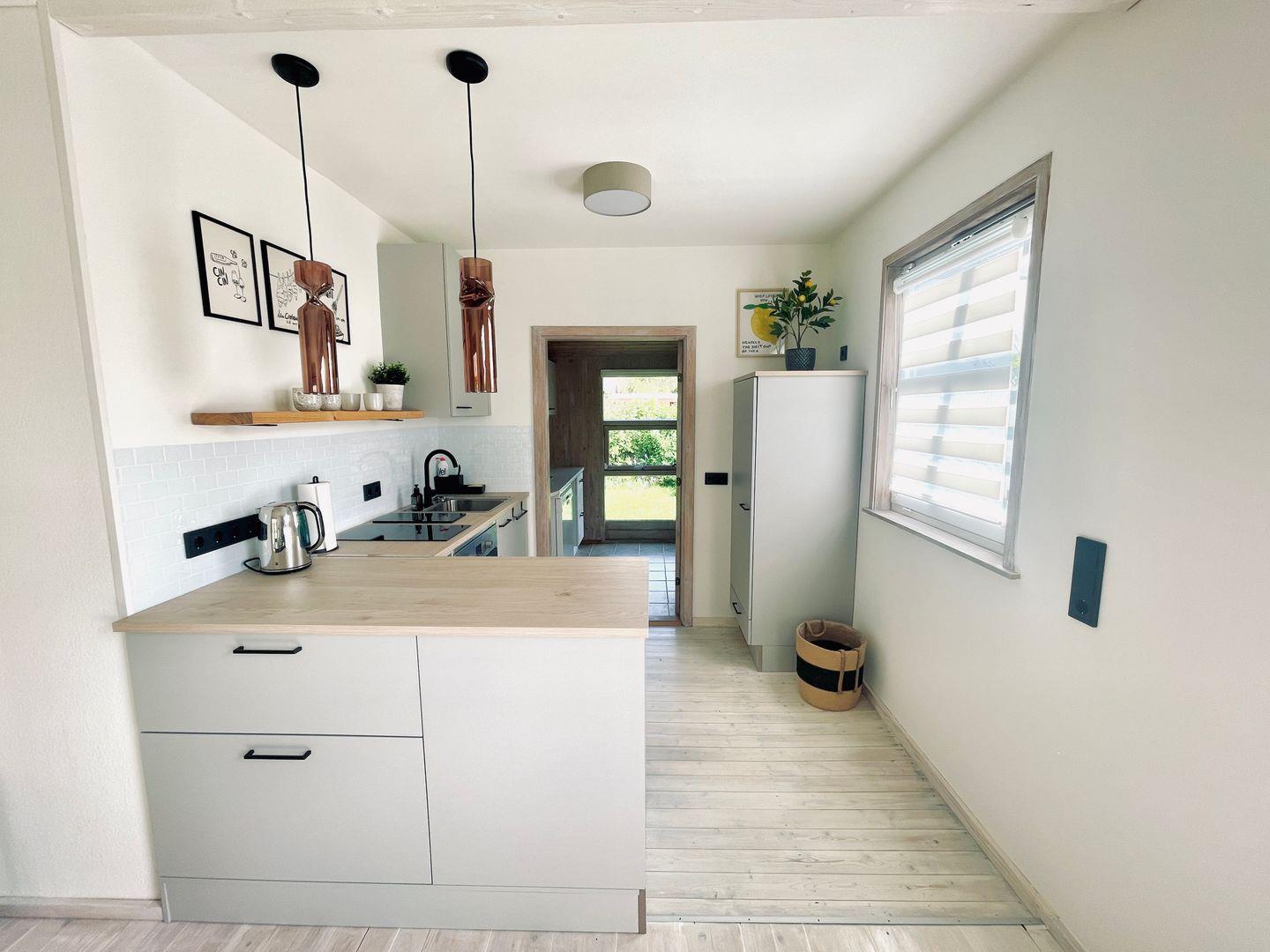 Der Wohnbereich im Ferienhaus ist großzügig gestaltet. Eine TV-Ecke (Smart-TV und Wlan) mit Sofa, sowie ein Essbereich zur offenen Küche bilden das Zentrum des Hauses. Im Wintergarten warteten eine neue finnische Sauna, Relaxliegen, Bücher und ein weiteres gemütliches Sofa auf unsere Gäste.