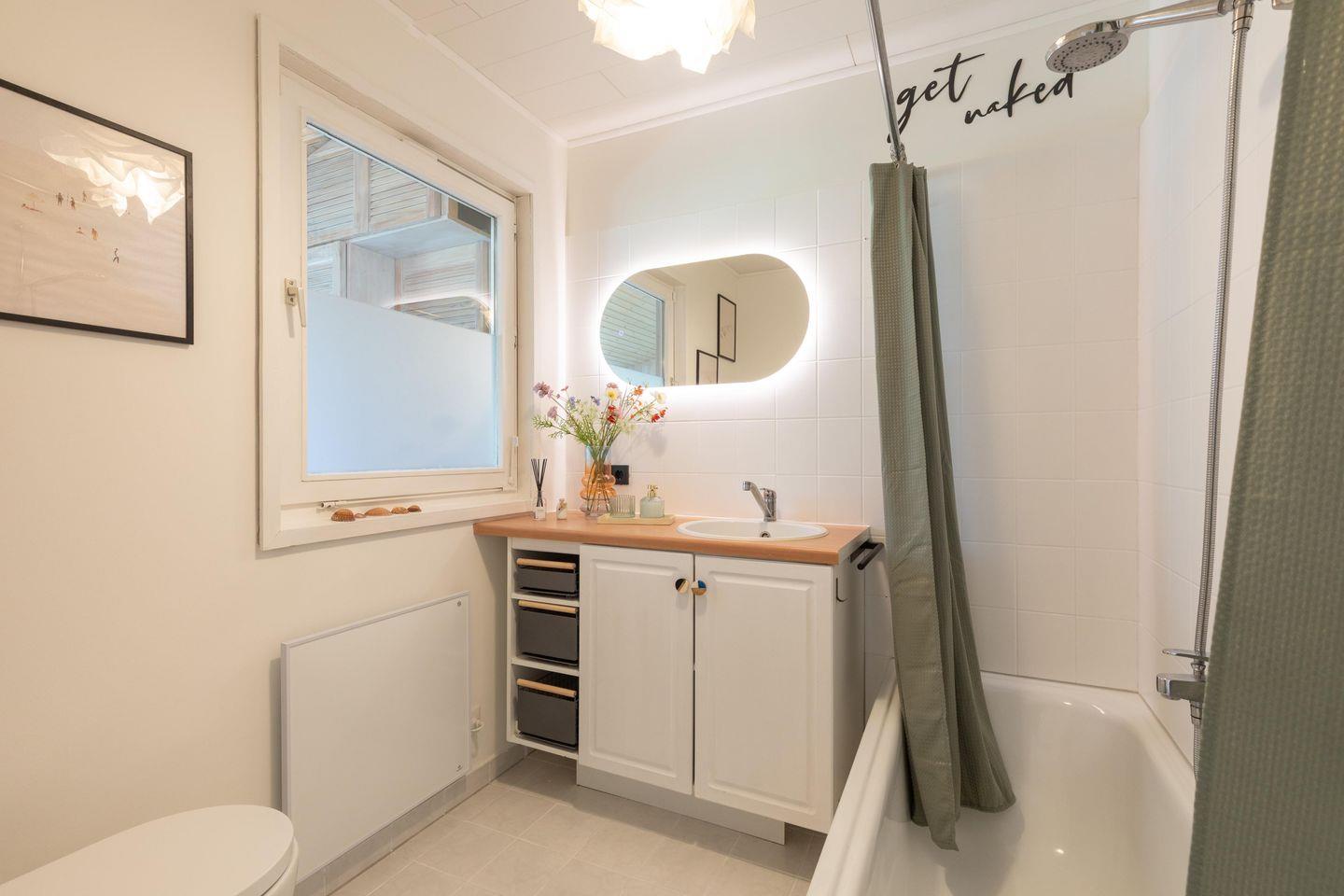 Das kleine Badezimmer ist modernisiert und verfügt über eine Badewannen-Dusche.