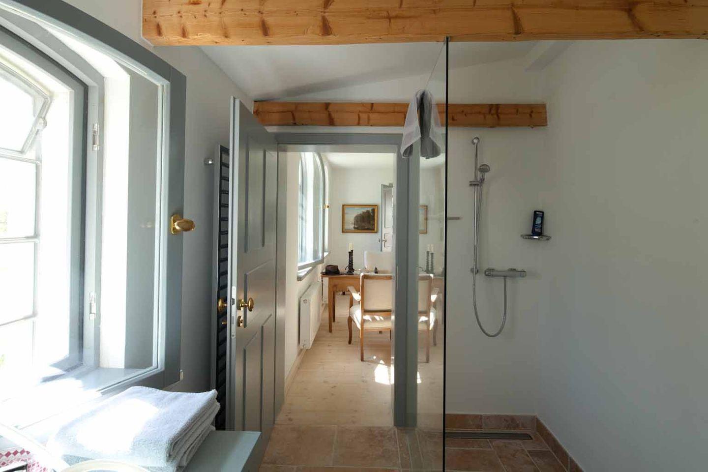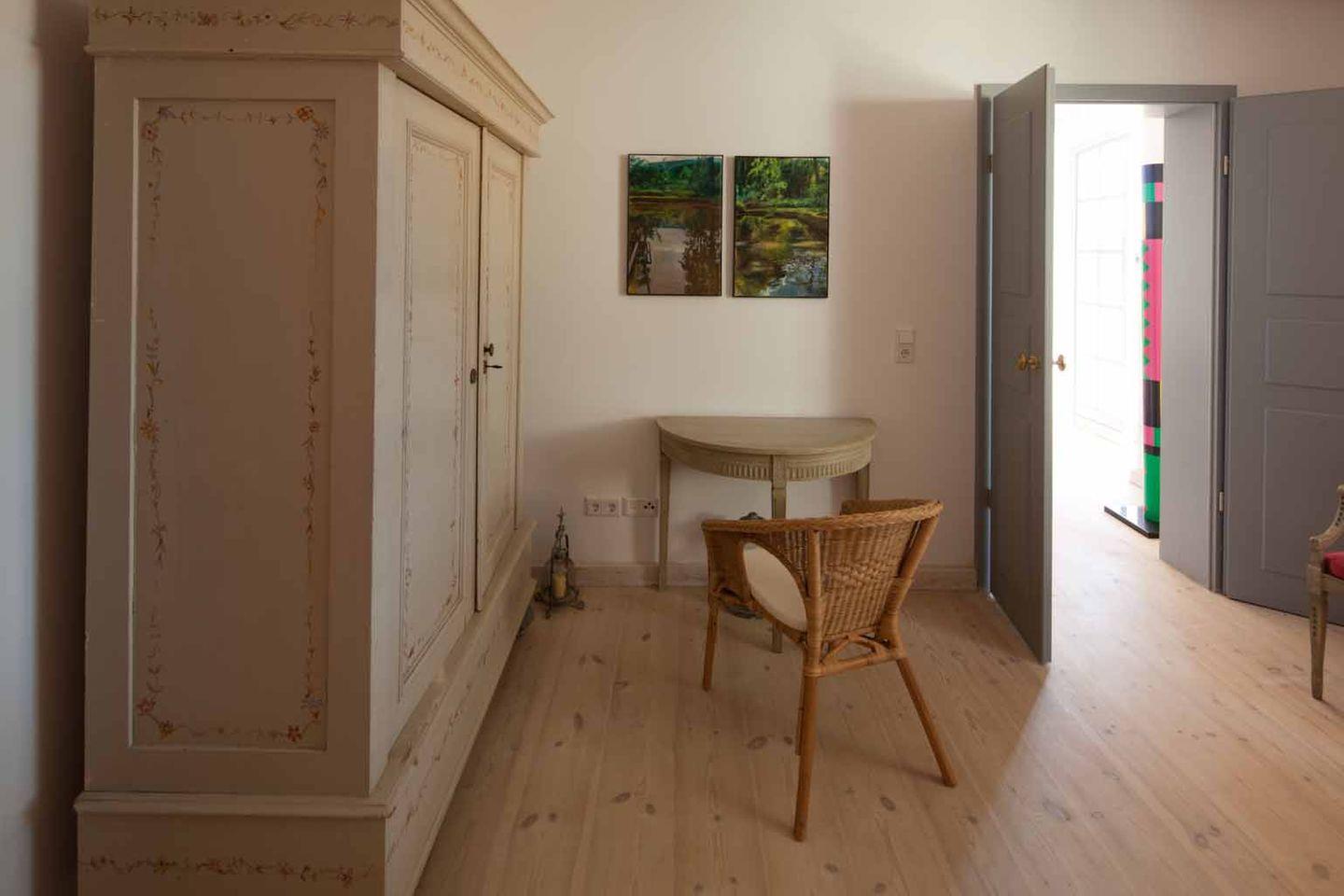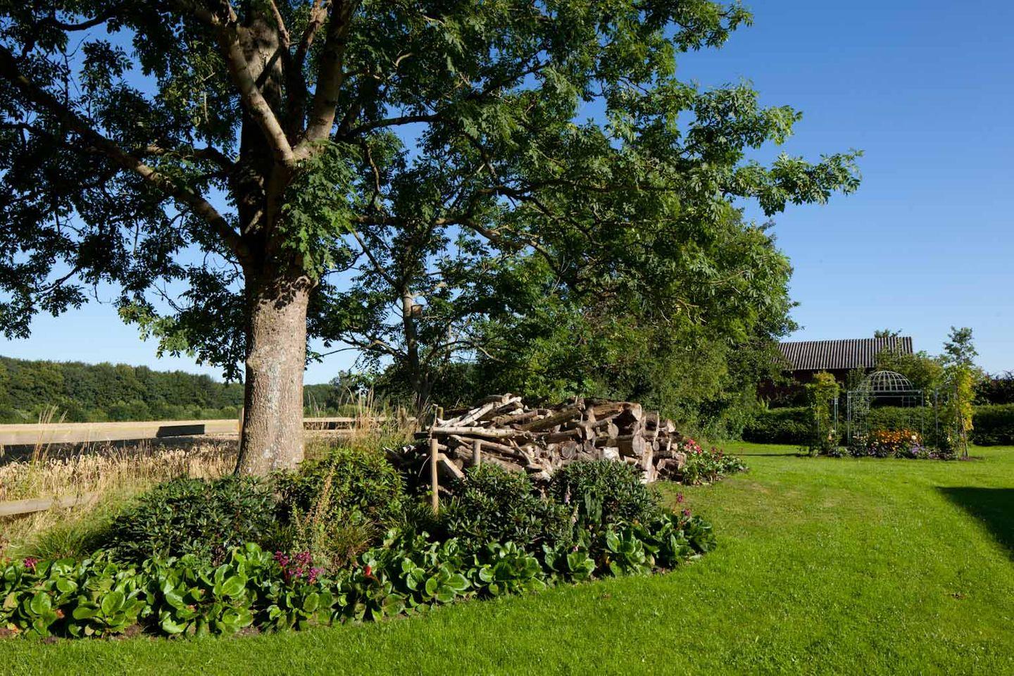 Die Terrasse ist eingebettet in einen gepflegten Garten mit altem Baumbestand, Wiesen und Feldern. Der Blick geht ins Grüne – nicht auf eine Straße. Ob Kaffee am Morgen, ein Glas Wein zum Sonnenuntergang oder eine ruhige Lesestunde: Dieser Außenbereich macht den Aufenthalt besonders.
