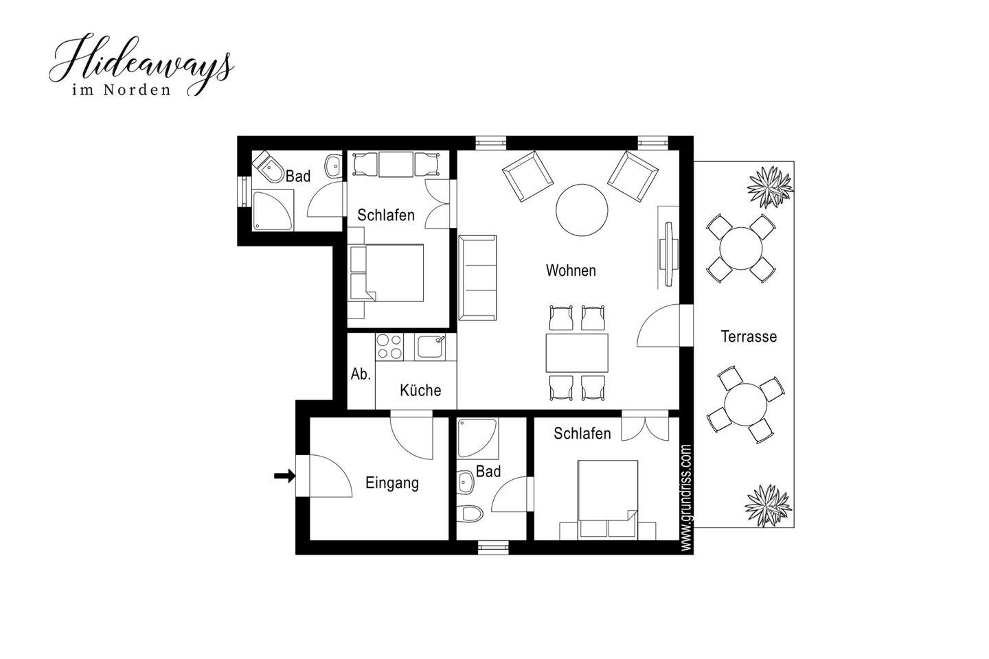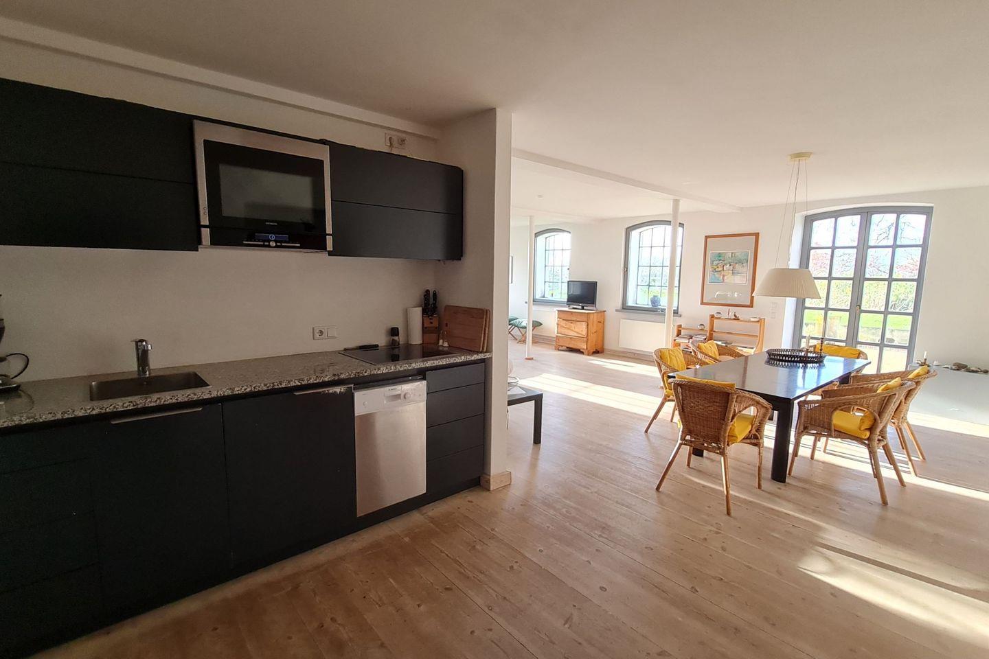 Die nach SW ausgerichtete Wohnung (Baujahr 2012) bietet auf etwa 120 m², im Erdgeschoss gelegen, komfortables, anspruchsvolles Wohnen für vier bis max. sechs Personen. Eine großflächige Terrasse, zugänglich vom Wohn-, Essbereich, umgeben von einem gepflegten Garten mit altem Baumbestand, Wiesen und Feldern runden den Komfort des Apartments ab. Die Wohnung verfügt über zwei Schlafzimmer mit je zwei Betten und einem jeweils direkt verbundenen stilvollen Duschbad. Eine vollständig ausgestattete Pantry mit Geschirrspüler, Kühlschrank, Kochfeld und Ofen sowie Sat-TV und W-Lan runden den hohen Standard ab.