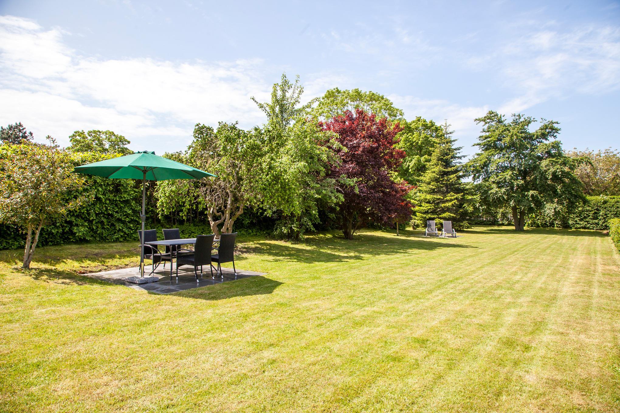 Der große eingezäunte und dicht eingewachsene Garten ist ein Urlaubsparadies für alle Gäste. Natürlich genießen auch Hunde hier die Möglichkeit, sich nach Herzenslust auszutoben und herumzutollen.