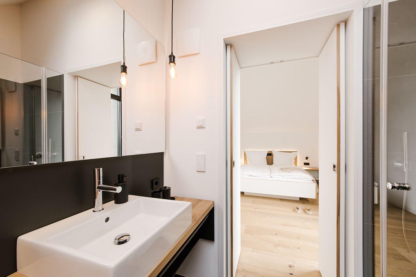 Der gemütliche Sitzbereich mit einer langen Bank erstreckt sich durch den gesamten Raum. Ein lässiger Loungebereich komplettiert den idealen Ort. Musik entspannt genießen und ein anderes Wohnflair erleben. Für einen exzellenten Sound haben wir eine Nubert-Soundbox ins Haus gestellt. Sie ist mit dem hauseigenen Tablet verbunden. Wer dennoch nicht auf seine Lieblings-CD verzichten möchte, für den steht auch ein CD Player bereit. Unser vollautomatischer Kamin liefert den passenden Sound für einen romantischen Winterabend. Ein Gäste-WC im Erdgeschoss bietet zusätzlichen Komfort. Ein weiteres Highlight im Obergeschoss des Hauses sind die beiden Schlafzimmer mit Doppelbett (160×200) und Backstagebereich. Hier verstecken sich die beiden Duschbäder für maximale Privatsphäre. Ein zweites Gäste-WC im Obergeschoss vervollständigt diesen Bereich. Der Außenbereich des Musikhauses DAS.DRITTE lädt dazu ein, die frische Ostsee-Luft zu genießen und vielleicht sogar Musik im Freien zu erleben, umgeben von der friedlichen Umgebung. Ein besonderes Highlight ist außerdem die Gemeinschaftssauna auf dem Grundstück, die eigenständig über einen Münzautomaten gesteuert werden kann. Perfekt, um nach einem Tag voller Aktivitäten zu entspannen und neue Energie zu tanken.
