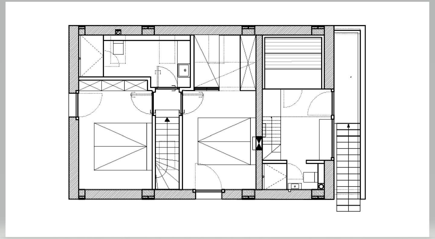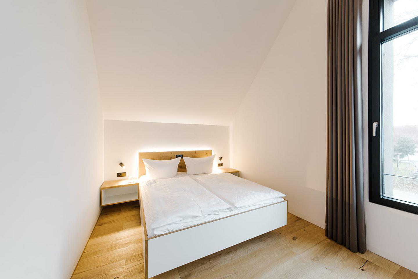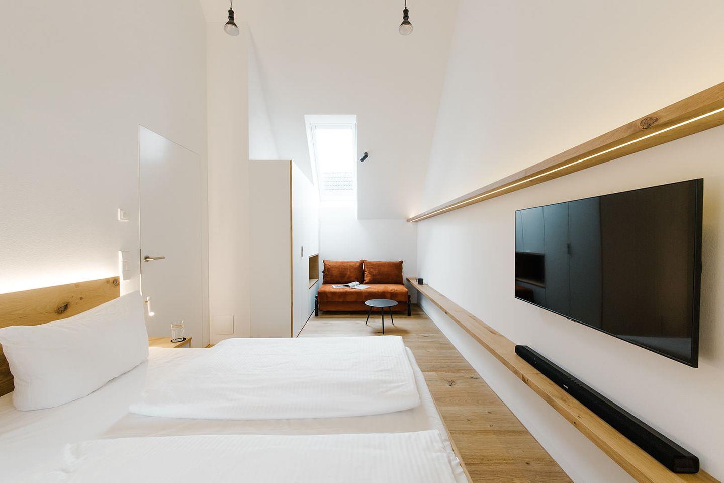 Im Obergeschoss liegen zwei Schlafzimmer. Das großzügige Familienzimmer mit Doppelbett (180 × 200), Schlafcouch (140 × 200) und eigenem TV eignet sich besonders gut für Eltern mit Kindern. Ein weiteres Schlafzimmer mit Doppelbett (160 × 200) bietet zusätzlichen Komfort. Das zweite Badezimmer mit Dusche befindet sich ebenfalls auf dieser Ebene und sorgt für angenehme Abläufe bei voller Belegung.