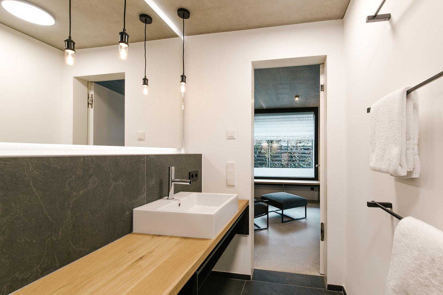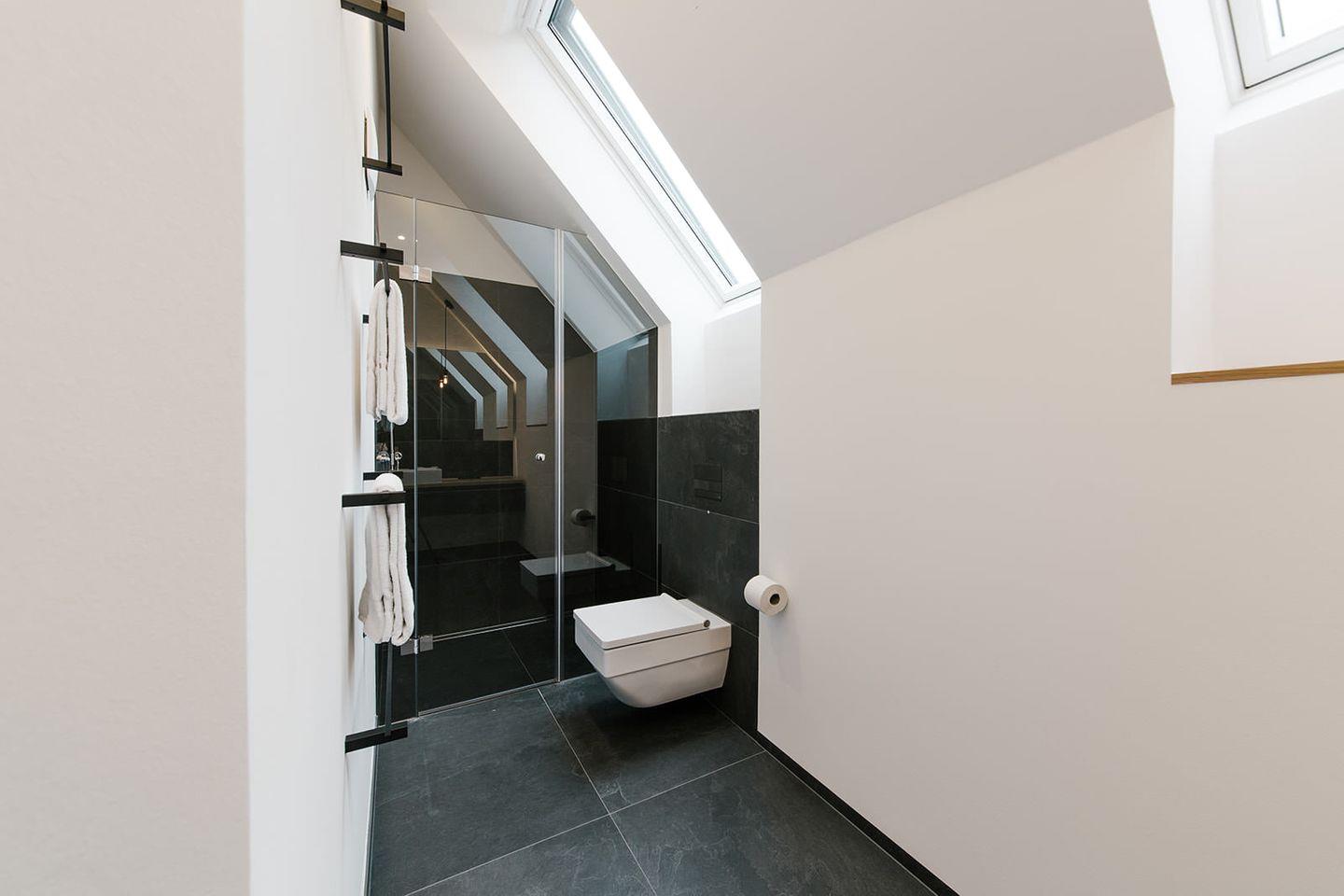 Ebenfalls im Erdgeschoss befindet sich eines der beiden Badezimmer mit ebenerdiger Dusche.