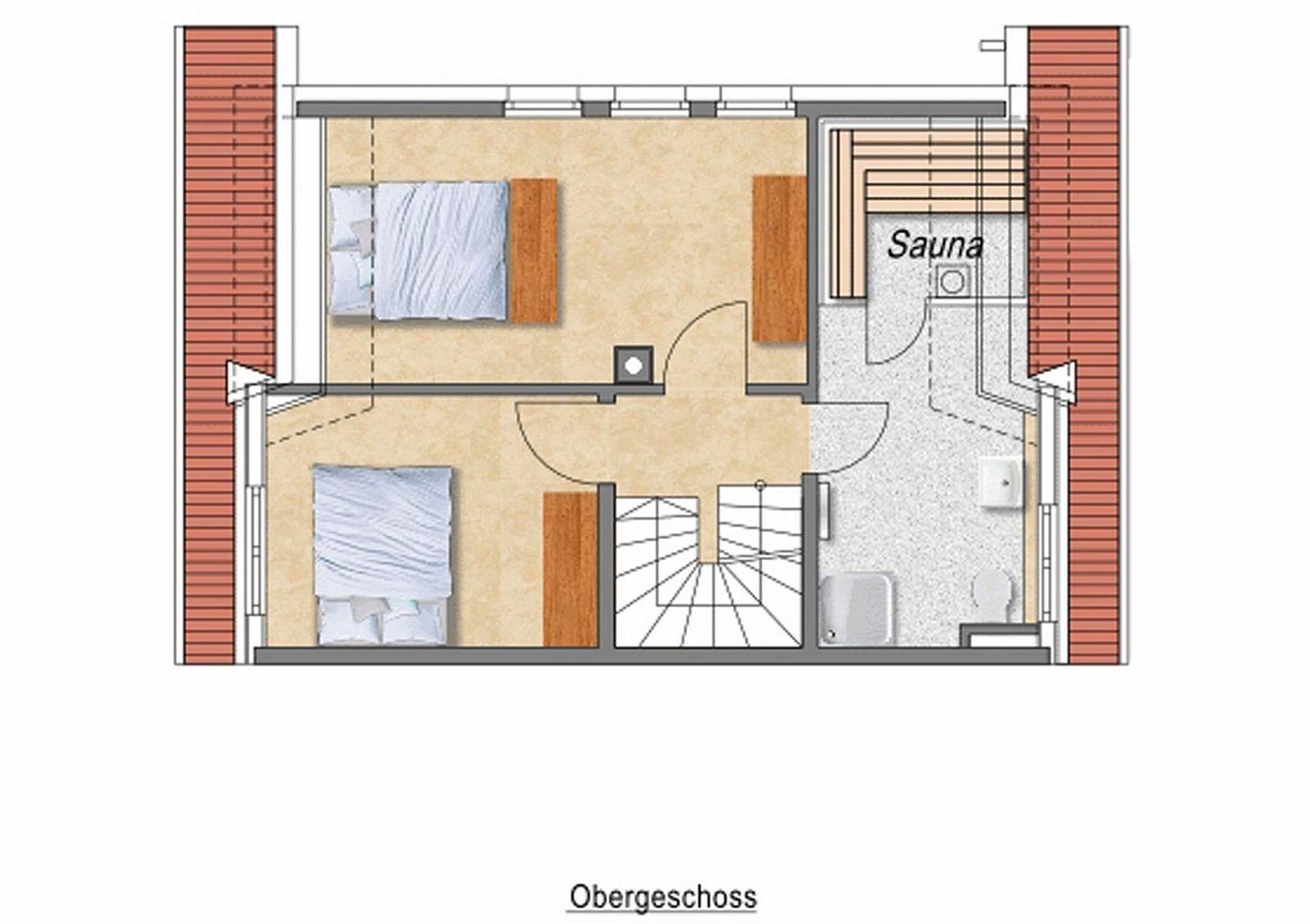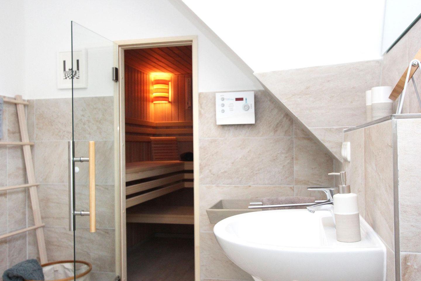 Über eine Eichenholztreppe erreicht man das Obergeschoss, welches aus den zwei Schlafzimmern mit hochwertigen Boxspringbetten und einem großen hellen Badezimmer mit einer begehbaren Dusche und angrenzender Sauna besteht.