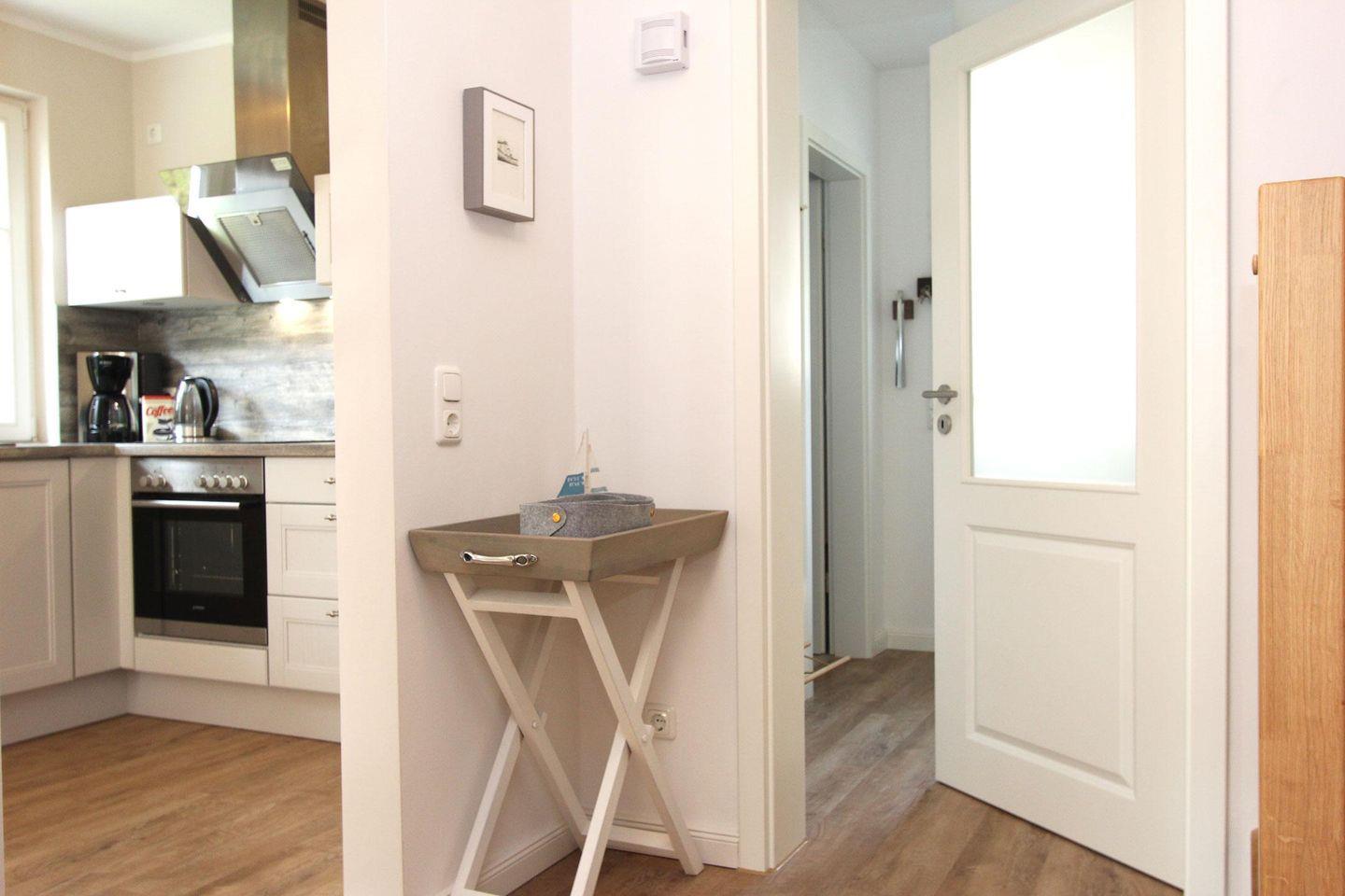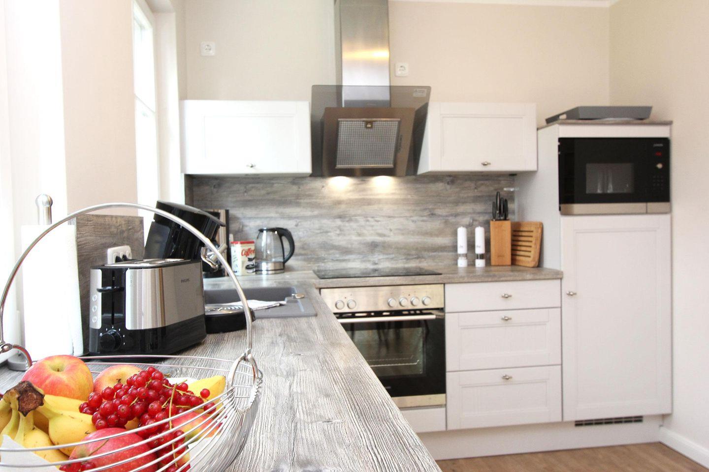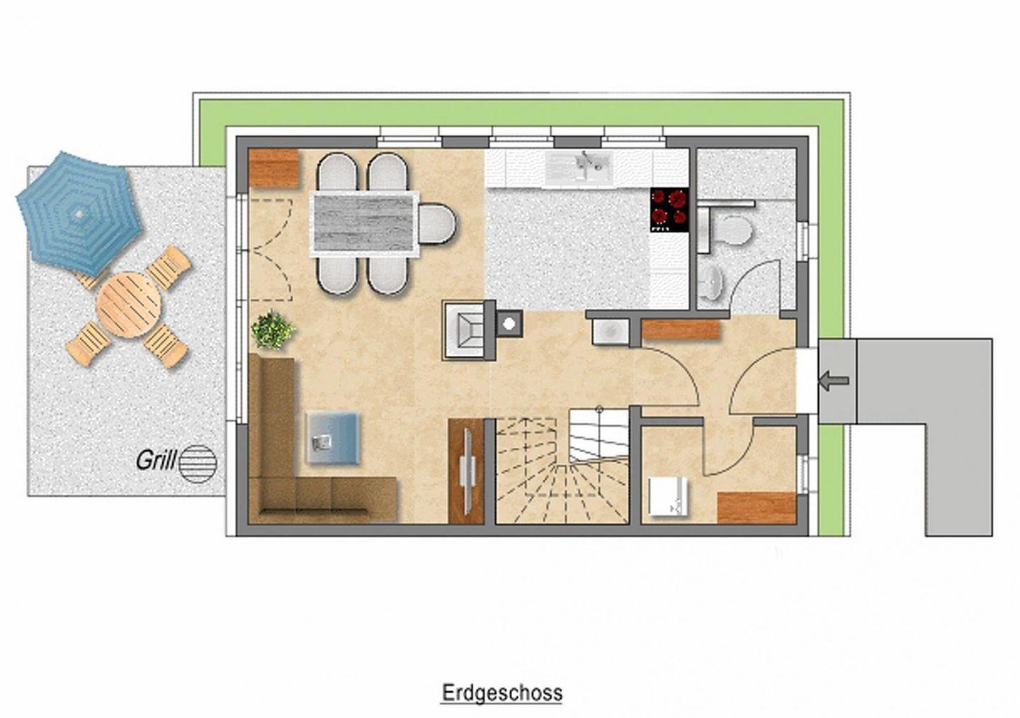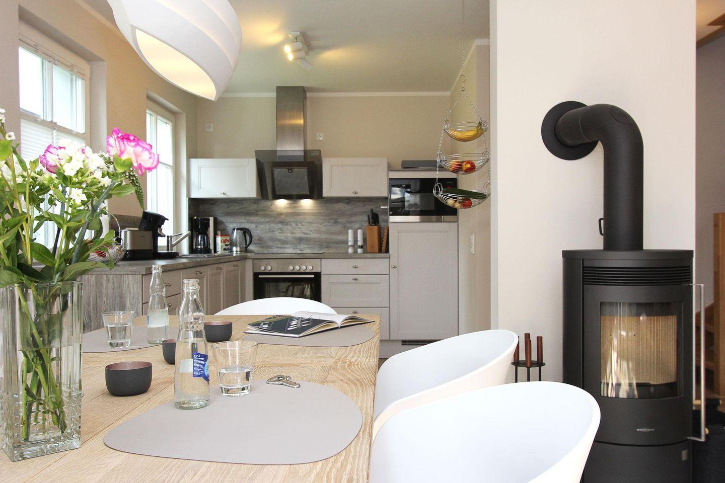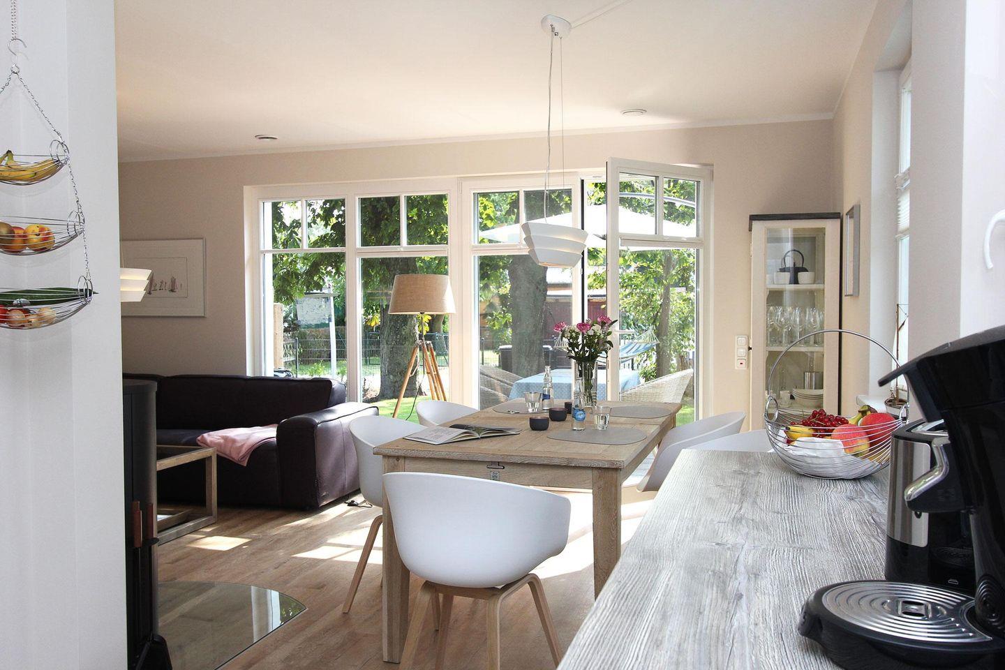 Im Erdgeschoss befindet sich die große geräumige Küche und der lichtdurchflutete Wohn- und Essbereich. Eine Senseo Kaffeemaschine steht in der Küche für Sie bereit. Vom Wohnzimmer aus gelangen Sie direkt auf die Südterrasse und in den beschaulichen, grünen Garten. Ebenfalls im Erdgeschoss finden Sie das Gästebad mit einer bodengleichen Dusche.
