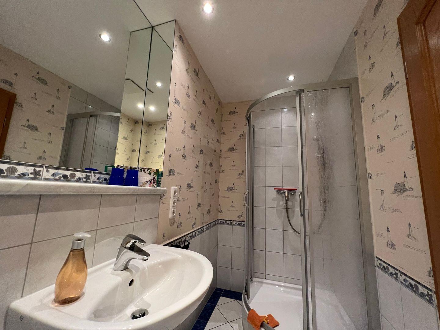 * Bad mit Waschbecken, großem Spiegel, Dusche/WC & einer Infrarot-Wärmelampe