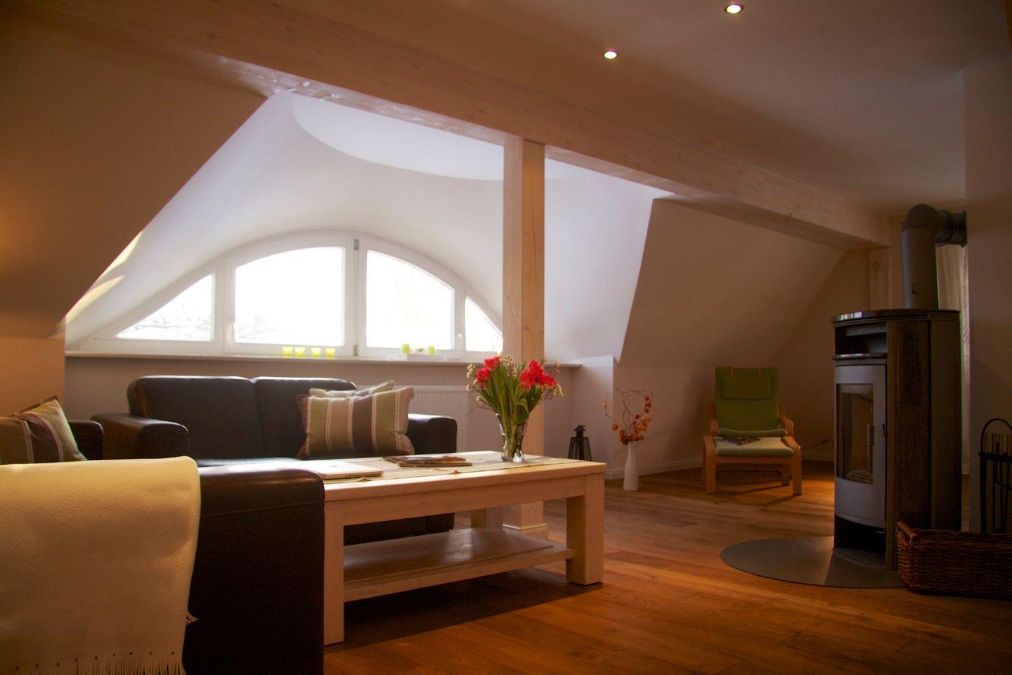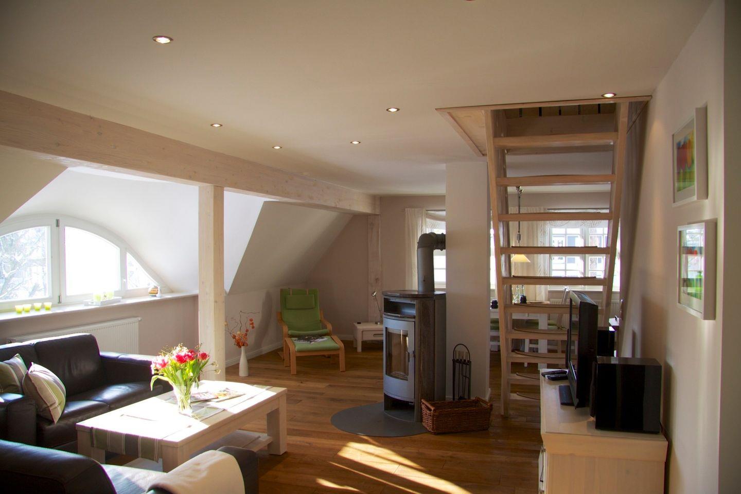Die Ferienwohnung 4 ist eine 2 geschossige Galeriewohnung mit 54m2 Wohnfläche und großzügig angelegt. Genießen Sie entspannte Stunden am Kaminofen oder Ihrer gemütlichen Schlafgalerie im Spitzboden.