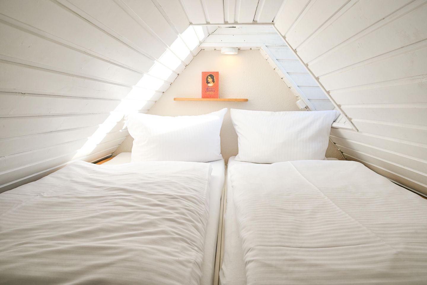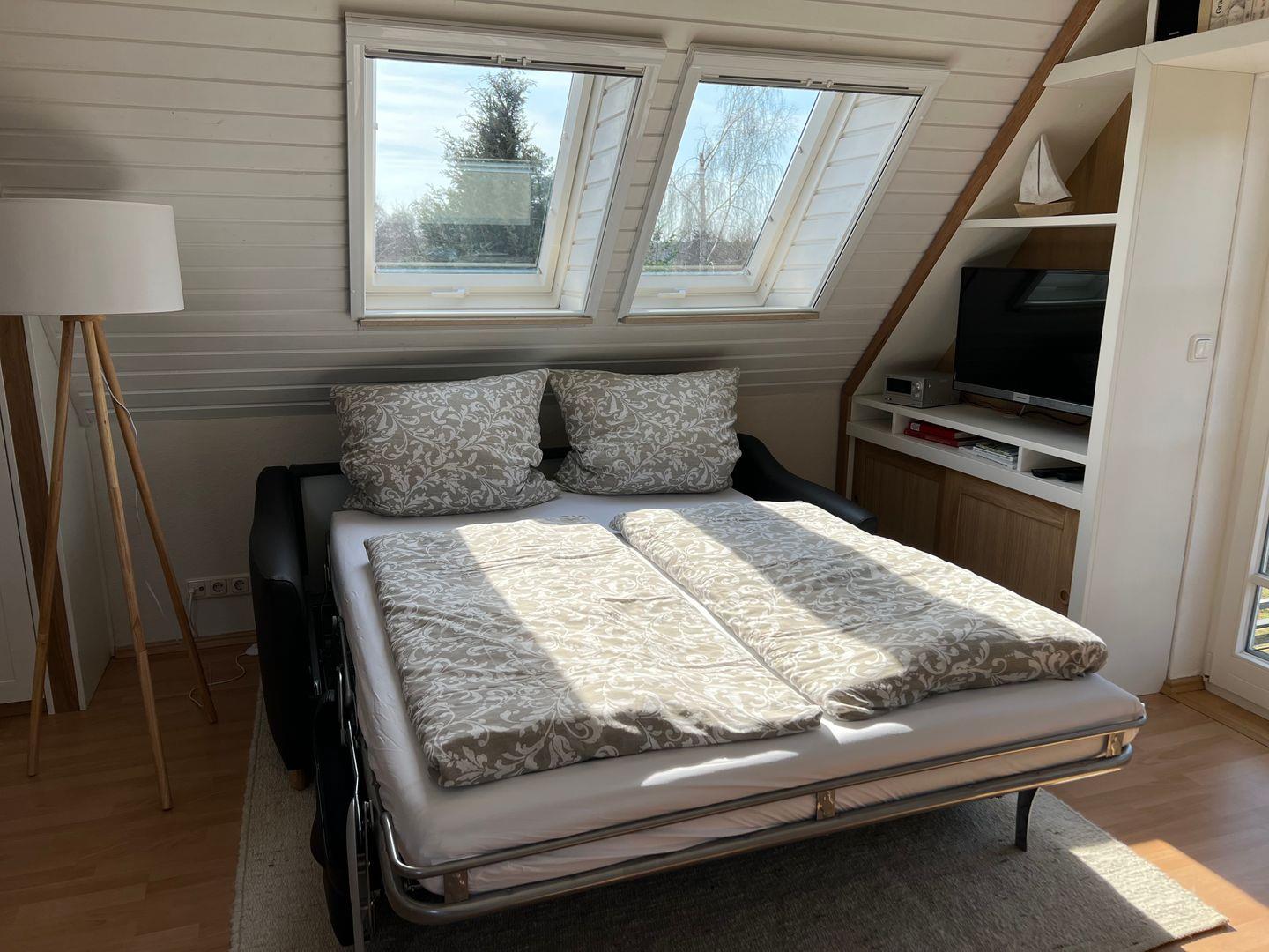 Es gibt zwei Schlafmöglichkeiten: Eine kleine Schlafkoje im Spitzbodenbereich, zugänglich über eine Treppe vom Wohnbereich mit zwei Betten (keine durchgehende Matratze, 1. Bett 80x190cm, 2. Bett 80x180cm) und das Sofa im Wohnbereich (ausklappbar zu einem vollwertigen Bett mit Ergoflex Lattenrost und Gelformmatratze, Liegefläche 140x200cm). Das kleine Badezimmer, mit Dusche und WC, geht vom Wohnbereich ab. Fast alle Fenster, außer das Bad und die Balkontür, sind mit Insektenschutzgittern versehen. Der kleine Balkon lädt zu tollen Sonnenuntergängen ein.