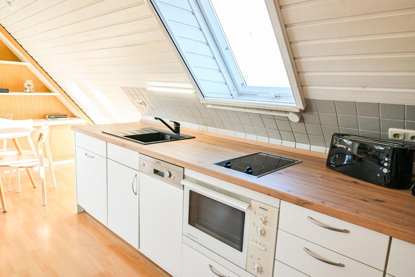 Unsere kleine gemütliche Ferienwohnung unter dem Dach bietet Platz für bis zu 2 Personen. Sie hat einen offenen, hell und freundlich eingerichteten Wohnbereich mit einem Sofa und Flat-TV. Die angrenzende offene Küchenzeile mit Essplatz ist voll ausgestattet.