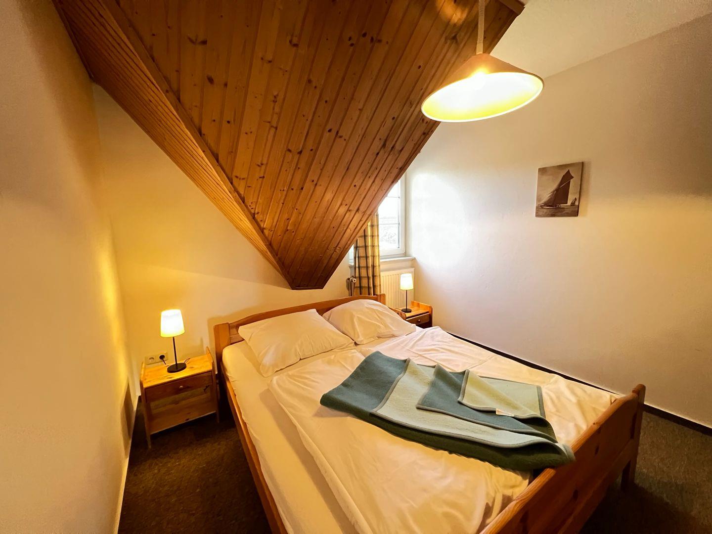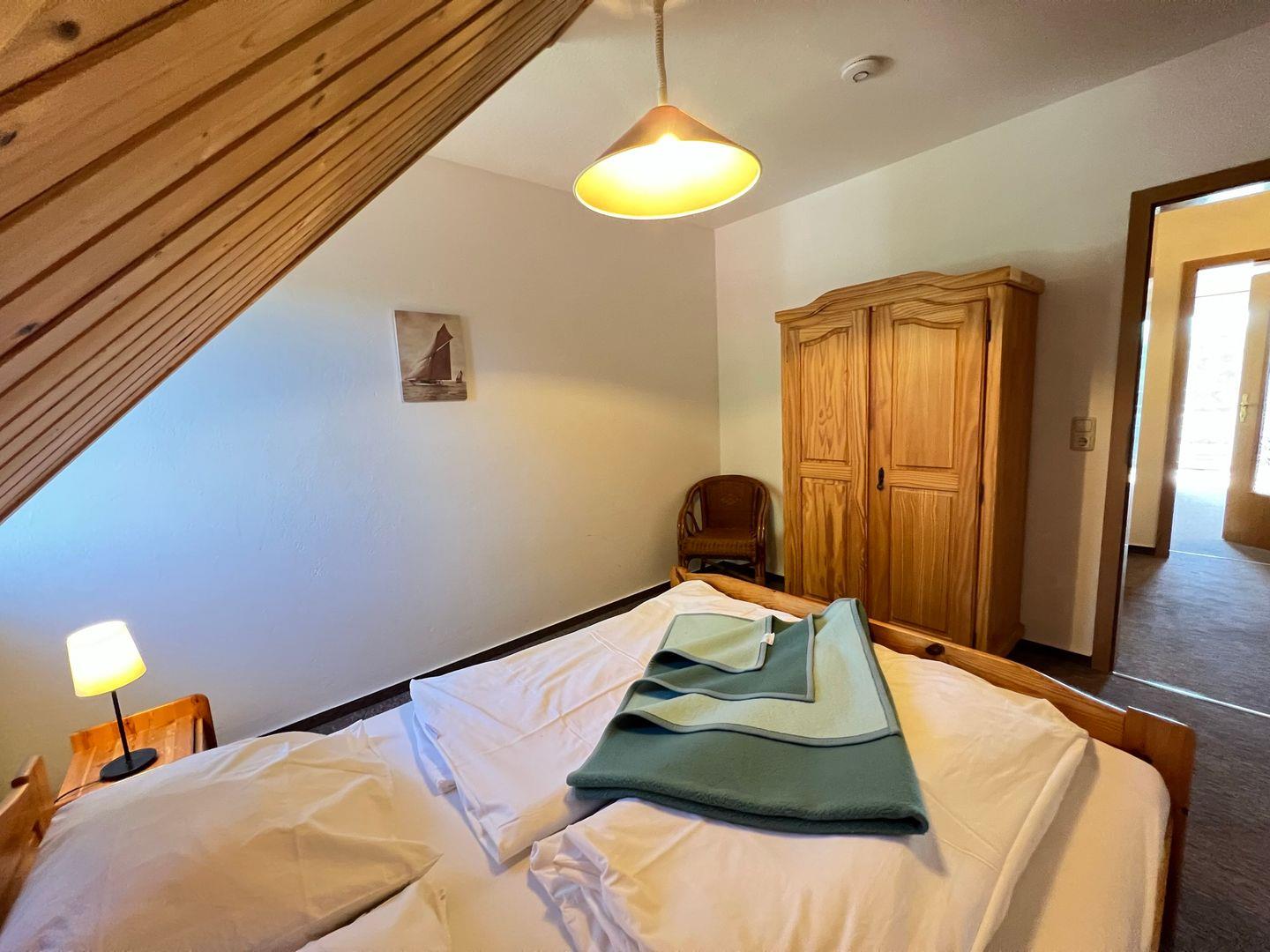 Schlafzimmer mit Ehebett und großem Kleiderschrank.