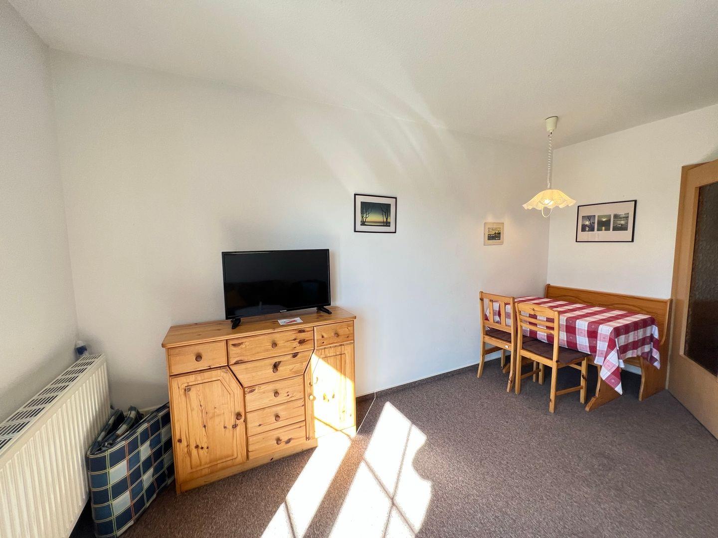 Im Wohnbereich ist eine Küchenzeile und ein Essplatz integriert .