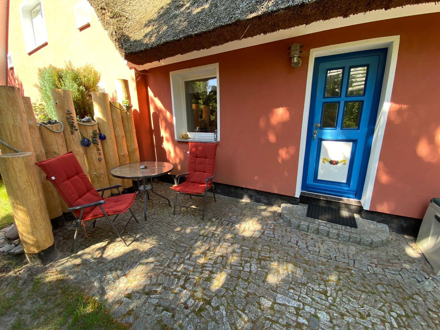 Gemütliche Ferienwohnung unter Reetdach im Wiecker Ortszentrum, 5 Minuten vom Hafen, mit Terrasse und eigenem Parkplatz.