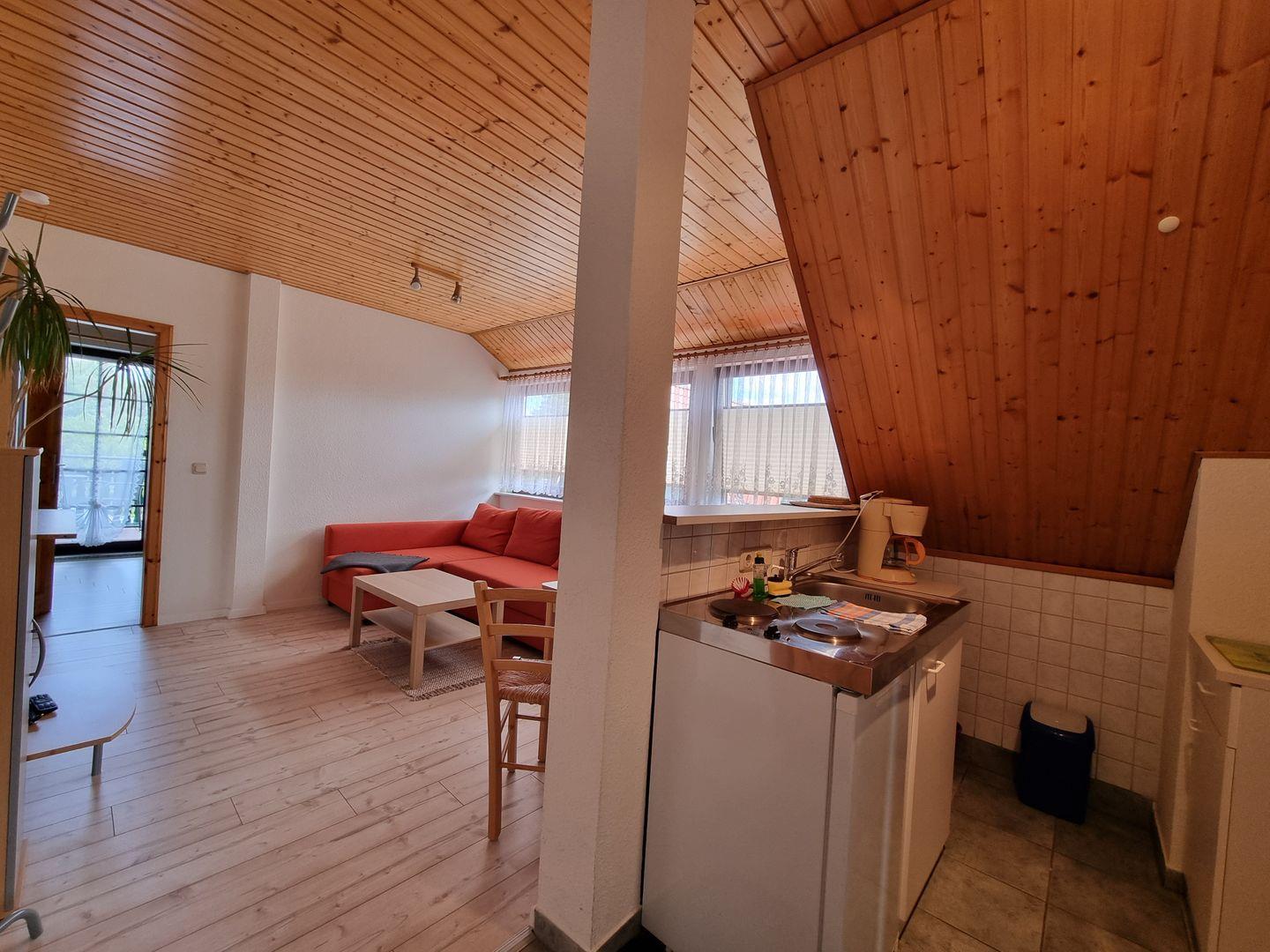Die Wohnung befindet sich im Obergeschoss eines zweistöckigen Hauses und besteht aus zwei einladenden Zimmern, die mit einem Laminatboden ausgestattet sind und eine angenehme Atmosphäre schaffen. Das Schlafzimmer ist mit Bettwäsche versehen und bietet Sichtschutz für alle Fenster, um eine erholsame Nachtruhe zu gewährleisten.