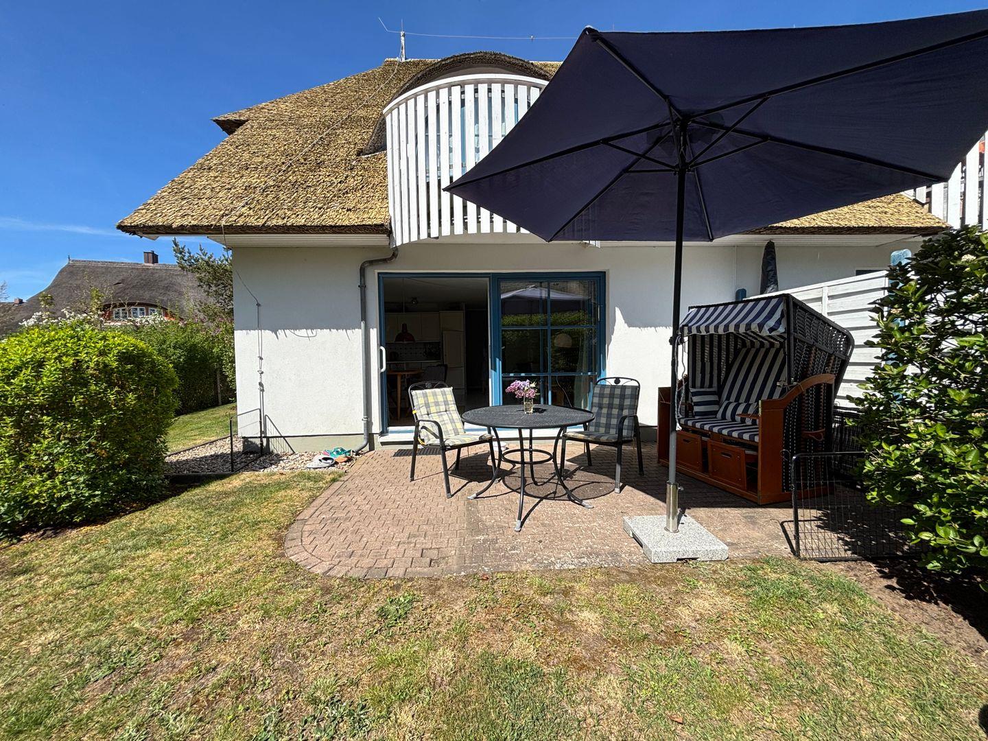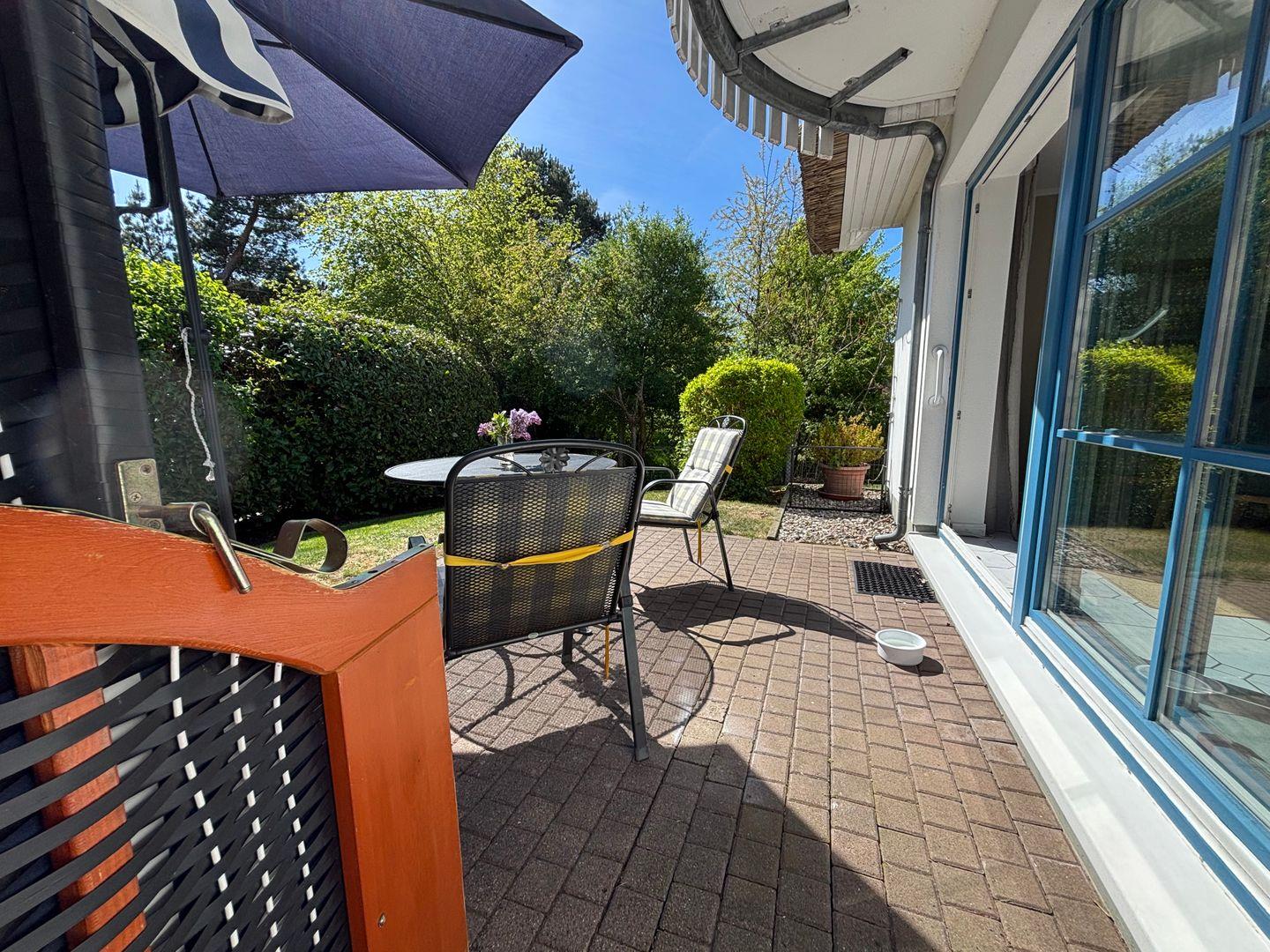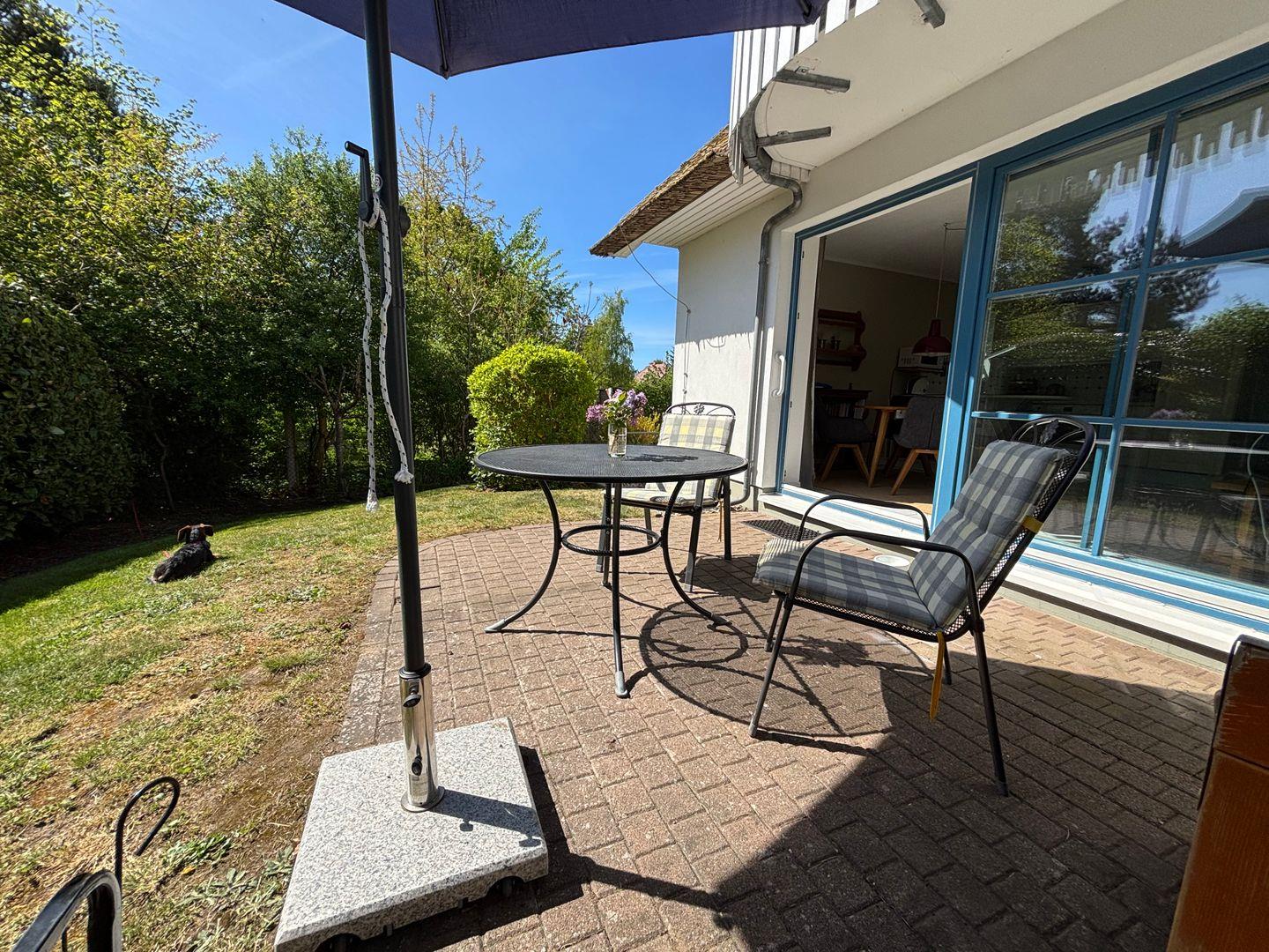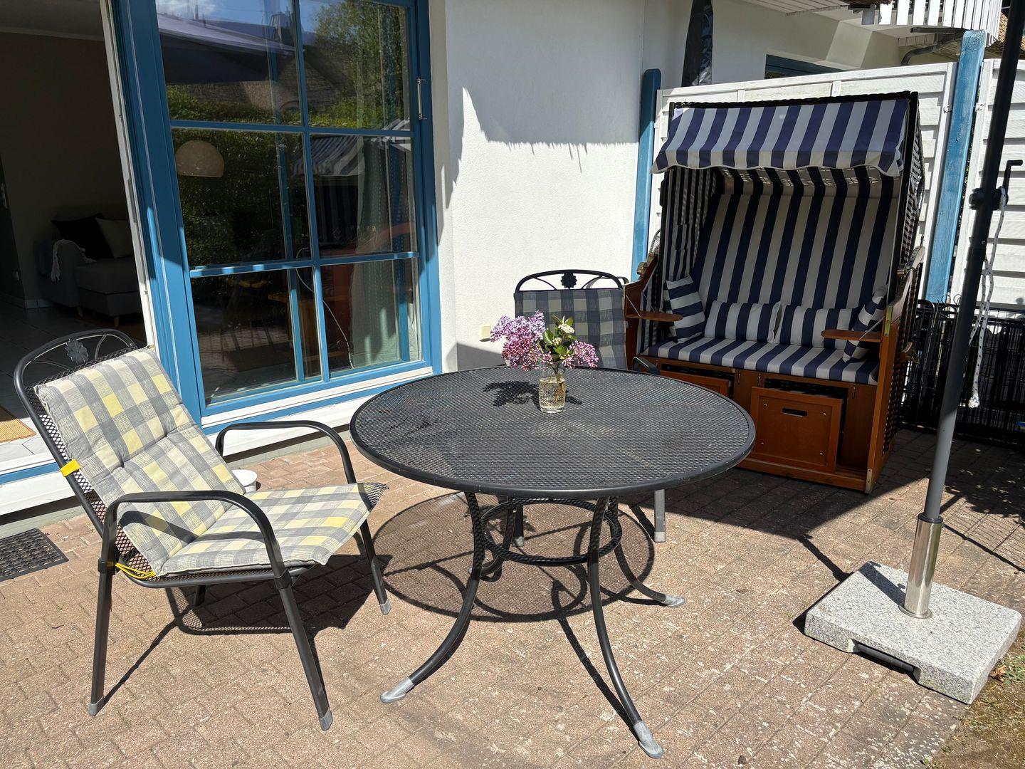 Auf der, von der Wohnküche zugänglichen Terrasse, empfängt Sie ein Tisch mit vier Stühlen, ein großer Sonnenschirm und ein Strandkorb. Hier kann man in Ruhe ein Buch lesen oder in der Abendsonne den Tag ausklingen lassen.