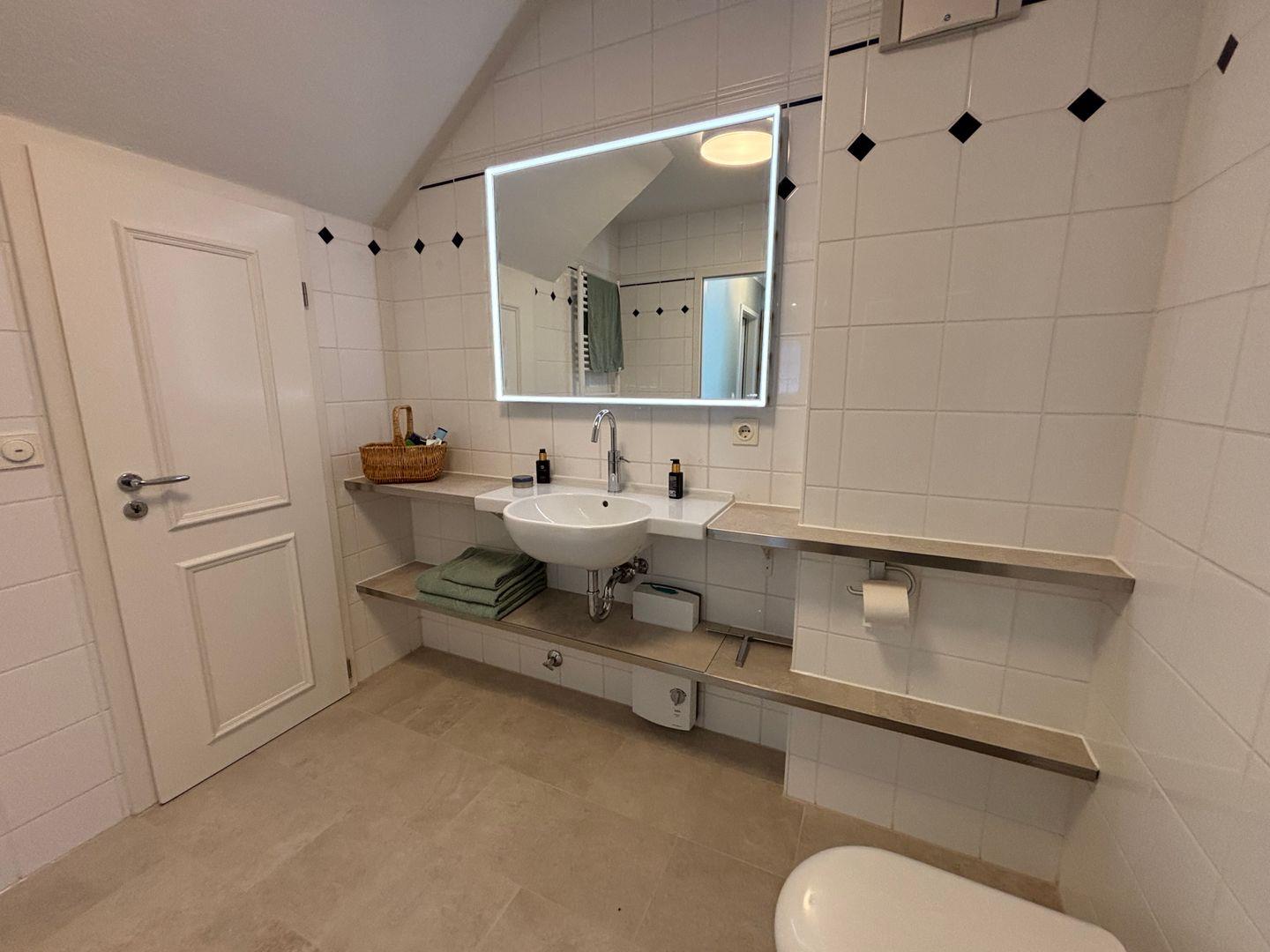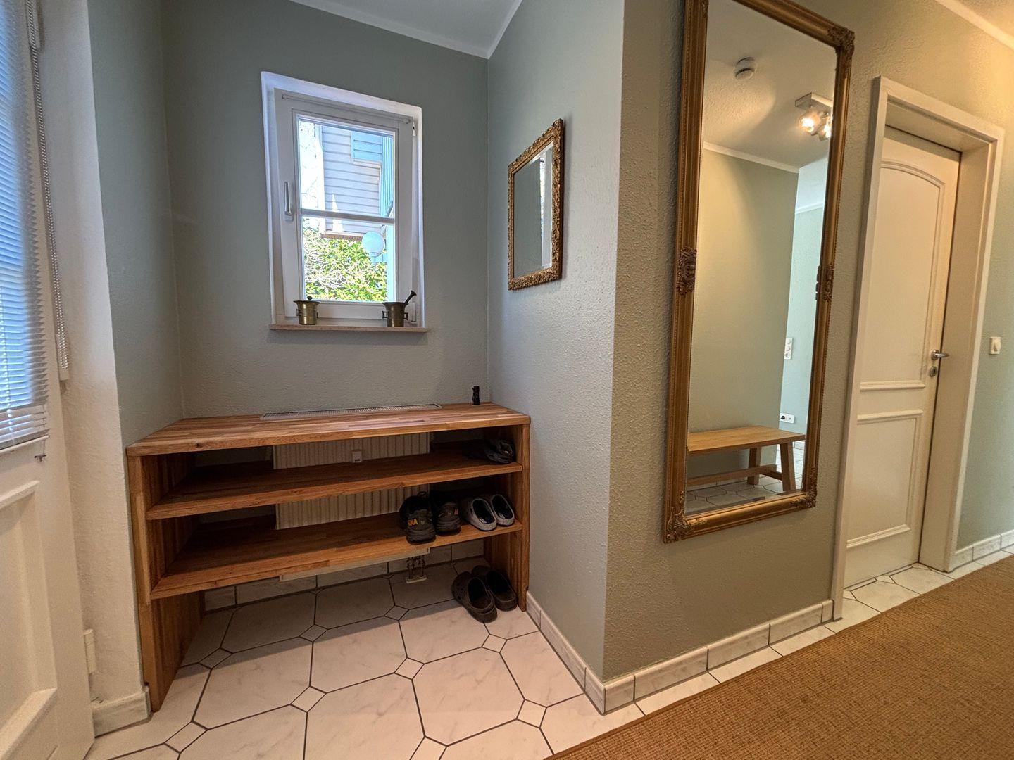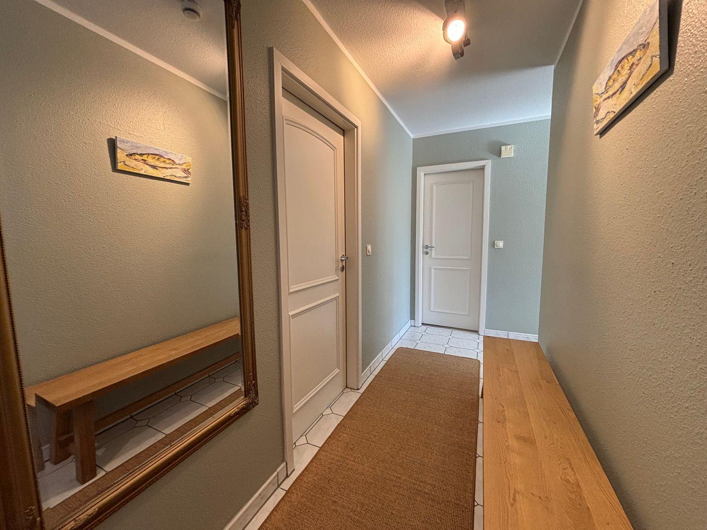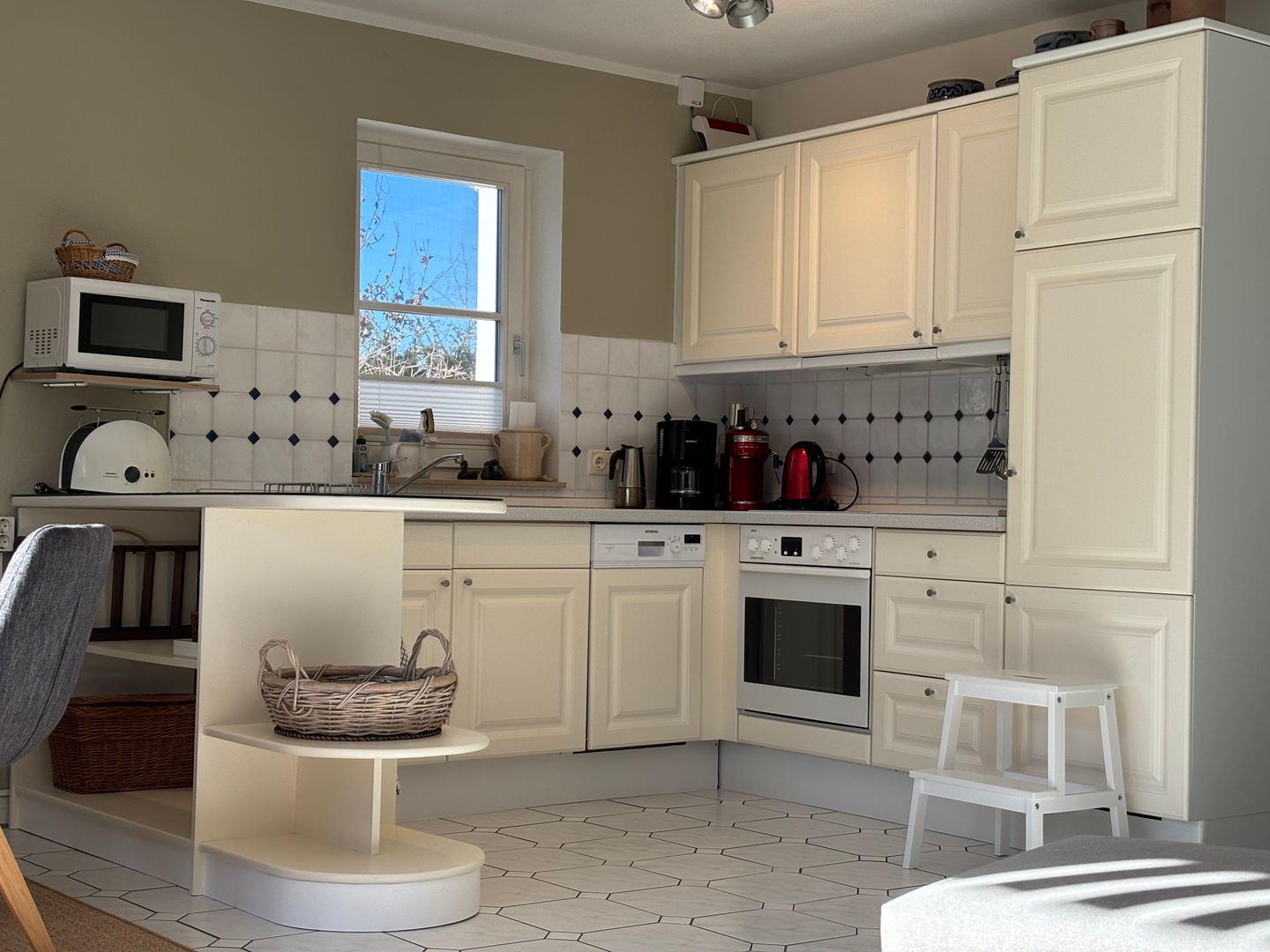 Vom hellen Eingangsbereich führt ein Flur zum ruhig gelegenen Schlafzimmer mit Doppelbett ( 180cm x 200 cm ), zum neu ausgestatteten Bad mit bodengleicher Dusche und zur Wohnküche. In der voll ausgestatteten Küche ist viel Platz um entspannt köstliche Mahlzeiten zuzubereiten. Die Küche bietet einen Backofen, eine Mikrowelle, vier Herdplatten, einen Kühlschrank mit kleinem Gefrierfach, Geschirrspüler und alles was man sonst benötigt.