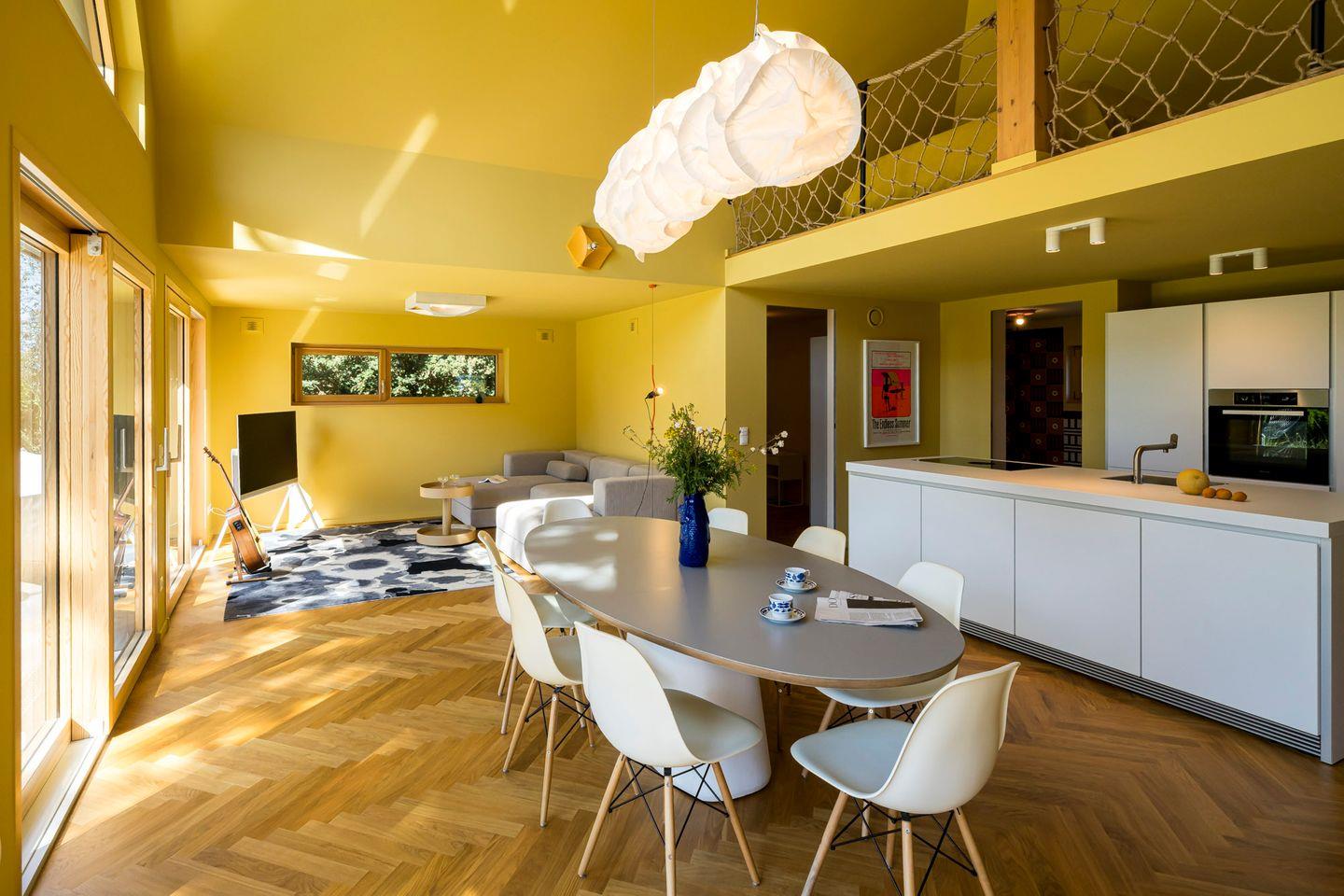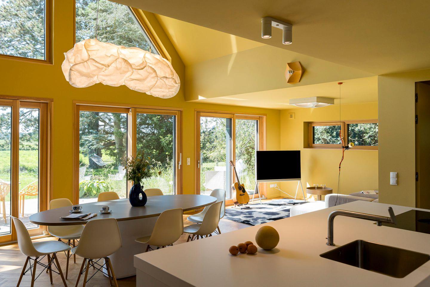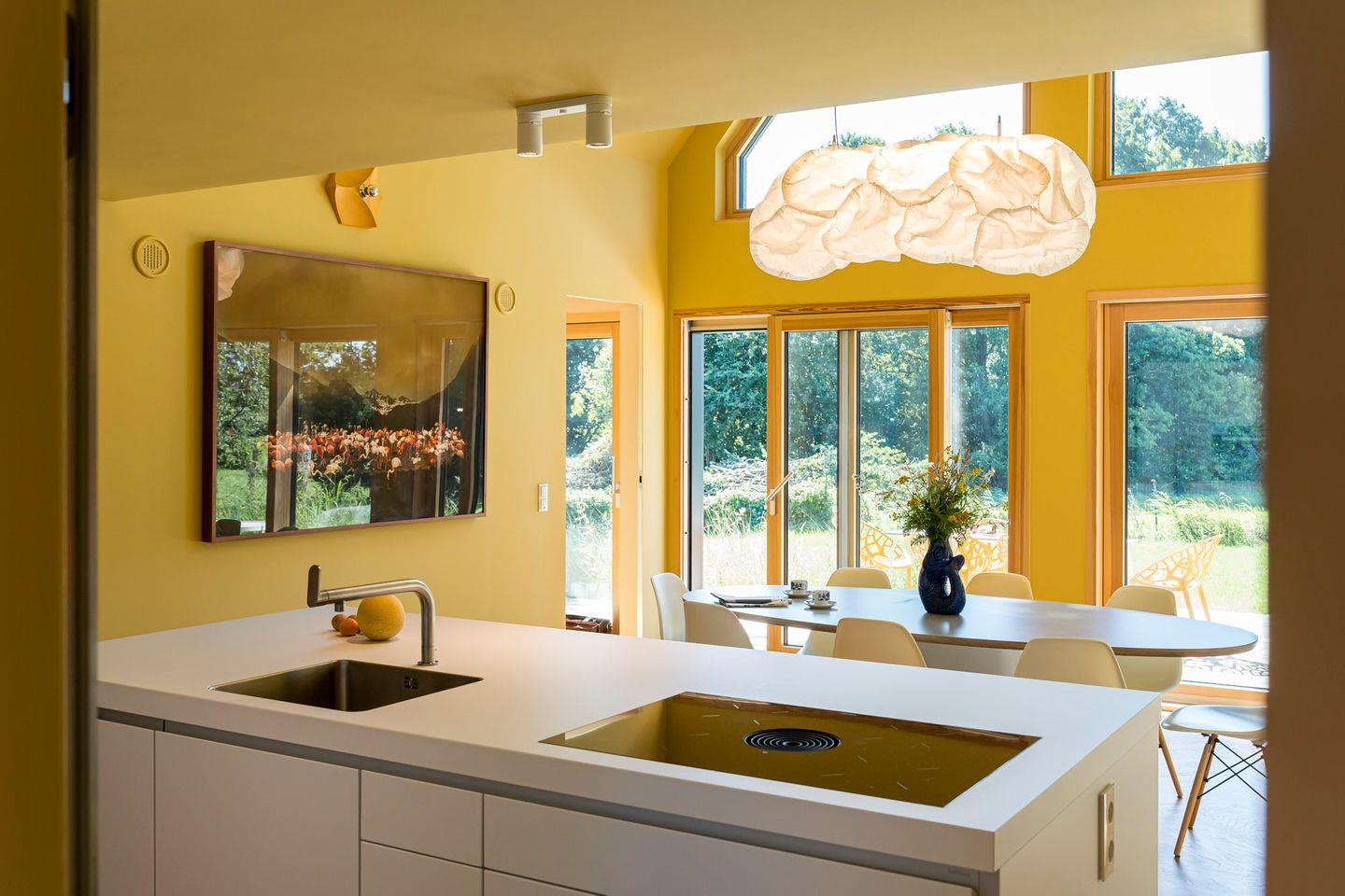 Die lichtdurchflutete Wohnküche bildet das Herz des Hauses. Durch die großen Fensterfronten fällt der Blick direkt in die offene Landschaft – Rehe oder Hasen lassen sich hier immer wieder beobachten. Der offene Wohnbereich mit gemütlicher Sofaecke, TV und großem Esstisch lädt zum Zusammensitzen ein, selbst an windigen Tagen oder bei norddeutschem Regen. Die voll ausgestattete Küche bietet alles, was gemeinsames Kochen im Urlaub angenehm macht.